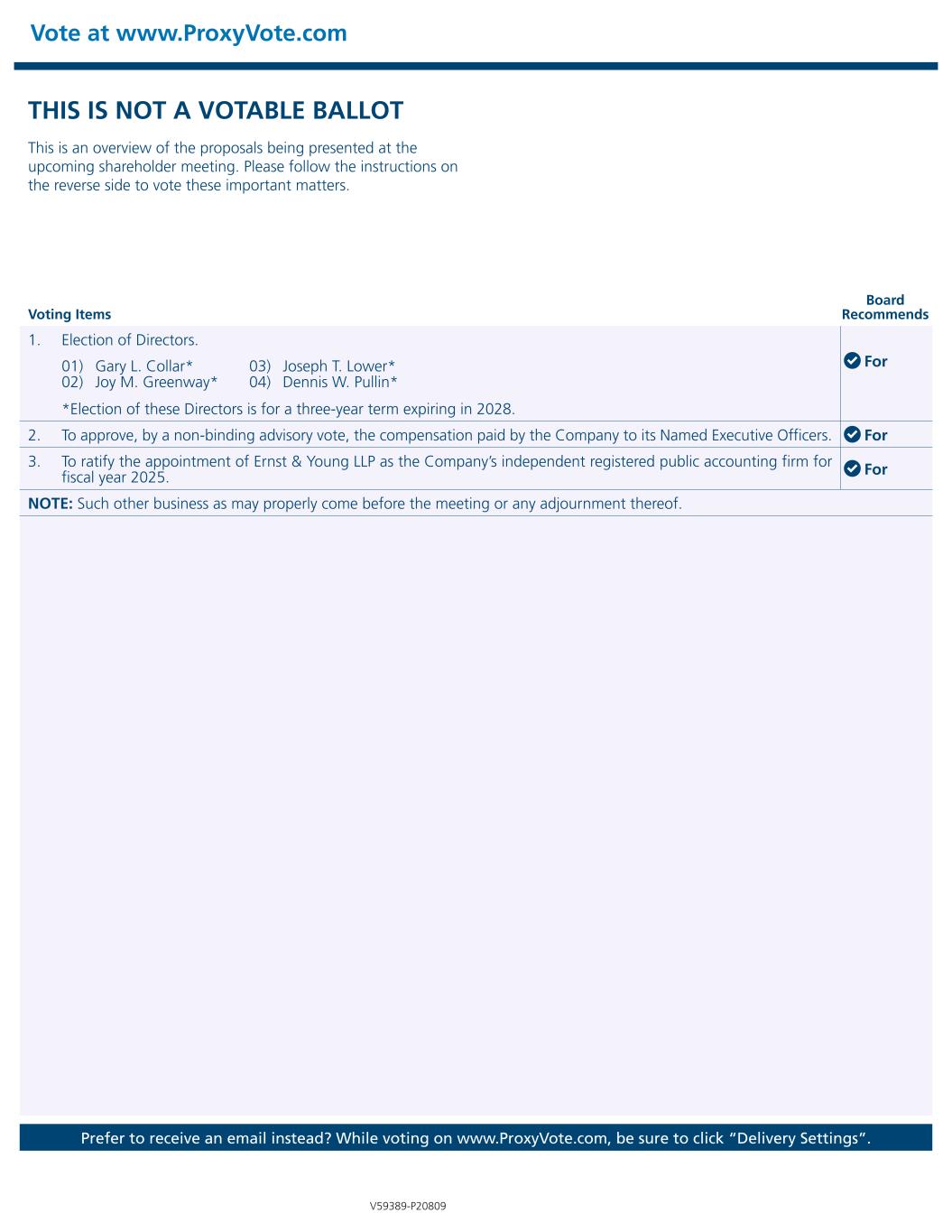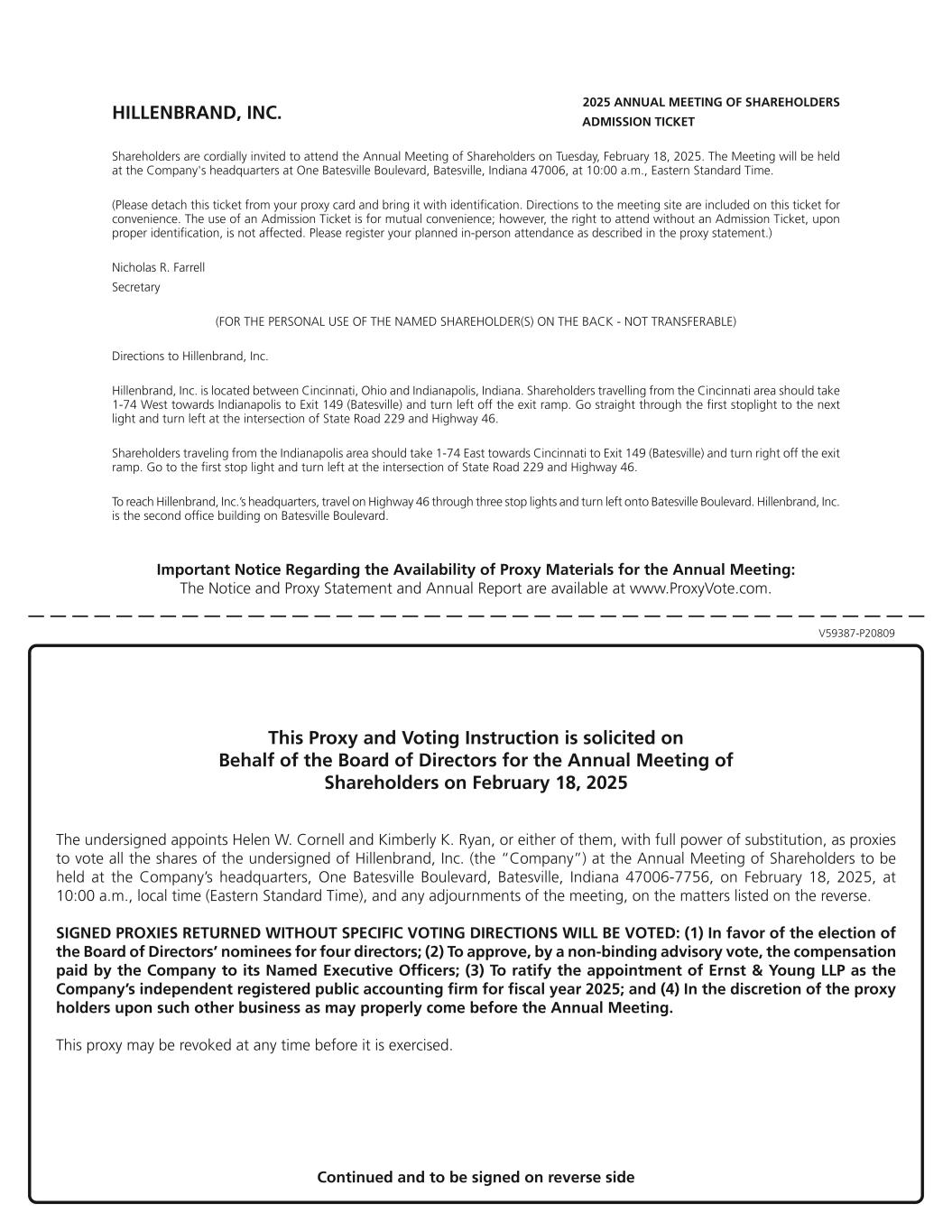 V59387-P20809 This Proxy and Voting Instruction is solicited on Behalf of the Board of Directors for the Annual Meeting of Shareholders on February 18, 2025 The undersigned appoints Helen W. Cornell and Kimberly K. Ryan, or either of them, with full power of substitution, as proxies to vote all the shares of the undersigned of Hillenbrand, Inc. (the “Company”) at the Annual Meeting of Shareholders to be held at the Company’s headquarters, One Batesville Boulevard, Batesville, Indiana 47006-7756, on February 18, 2025, at 10:00 a.m., local time (Eastern Standard Time), and any adjournments of the meeting, on the matters listed on the reverse. SIGNED PROXIES RETURNED WITHOUT SPECIFIC VOTING DIRECTIONS WILL BE VOTED: (1) In favor of the election of the Board of Directors’ nominees for four directors; (2) To approve, by a non-binding advisory vote, the compensation paid by the Company to its Named Executive Officers; (3) To ratify the appointment of Ernst & Young LLP as the Company’s independent registered public accounting firm for fiscal year 2025; and (4) In the discretion of the proxy holders upon such other business as may properly come before the Annual Meeting. This proxy may be revoked at any time before it is exercised. Continued and to be signed on reverse side 2025 ANNUAL MEETING OF SHAREHOLDERS ADMISSION TICKET Shareholders are cordially invited to attend the Annual Meeting of Shareholders on Tuesday, February 18, 2025. The Meeting will be held at the Company's headquarters at One Batesville Boulevard, Batesville, Indiana 47006, at 10:00 a.m., Eastern Standard Time. (Please detach this ticket from your proxy card and bring it with identification. Directions to the meeting site are included on this ticket for convenience. The use of an Admission Ticket is for mutual convenience; however, the right to attend without an Admission Ticket, upon proper identification, is not affected. Please register your planned in-person attendance as described in the proxy statement.) Nicholas R. Farrell Secretary (FOR THE PERSONAL USE OF THE NAMED SHAREHOLDER(S) ON THE BACK - NOT TRANSFERABLE) Directions to Hillenbrand, Inc. Hillenbrand, Inc. is located between Cincinnati, Ohio and Indianapolis, Indiana. Shareholders travelling from the Cincinnati area should take 1-74 West towards Indianapolis to Exit 149 (Batesville) and turn left off the exit ramp. Go straight through the first stoplight to the next light and turn left at the intersection of State Road 229 and Highway 46. Shareholders traveling from the Indianapolis area should take 1-74 East towards Cincinnati to Exit 149 (Batesville) and turn right off the exit ramp. Go to the first stop light and turn left at the intersection of State Road 229 and Highway 46. To reach Hillenbrand, Inc.’s headquarters, travel on Highway 46 through three stop lights and turn left onto Batesville Boulevard. Hillenbrand, Inc. is the second office building on Batesville Boulevard. Important Notice Regarding the Availability of Proxy Materials for the Annual Meeting: The Notice and Proxy Statement and Annual Report are available at www.ProxyVote.com. HILLENBRAND, INC.