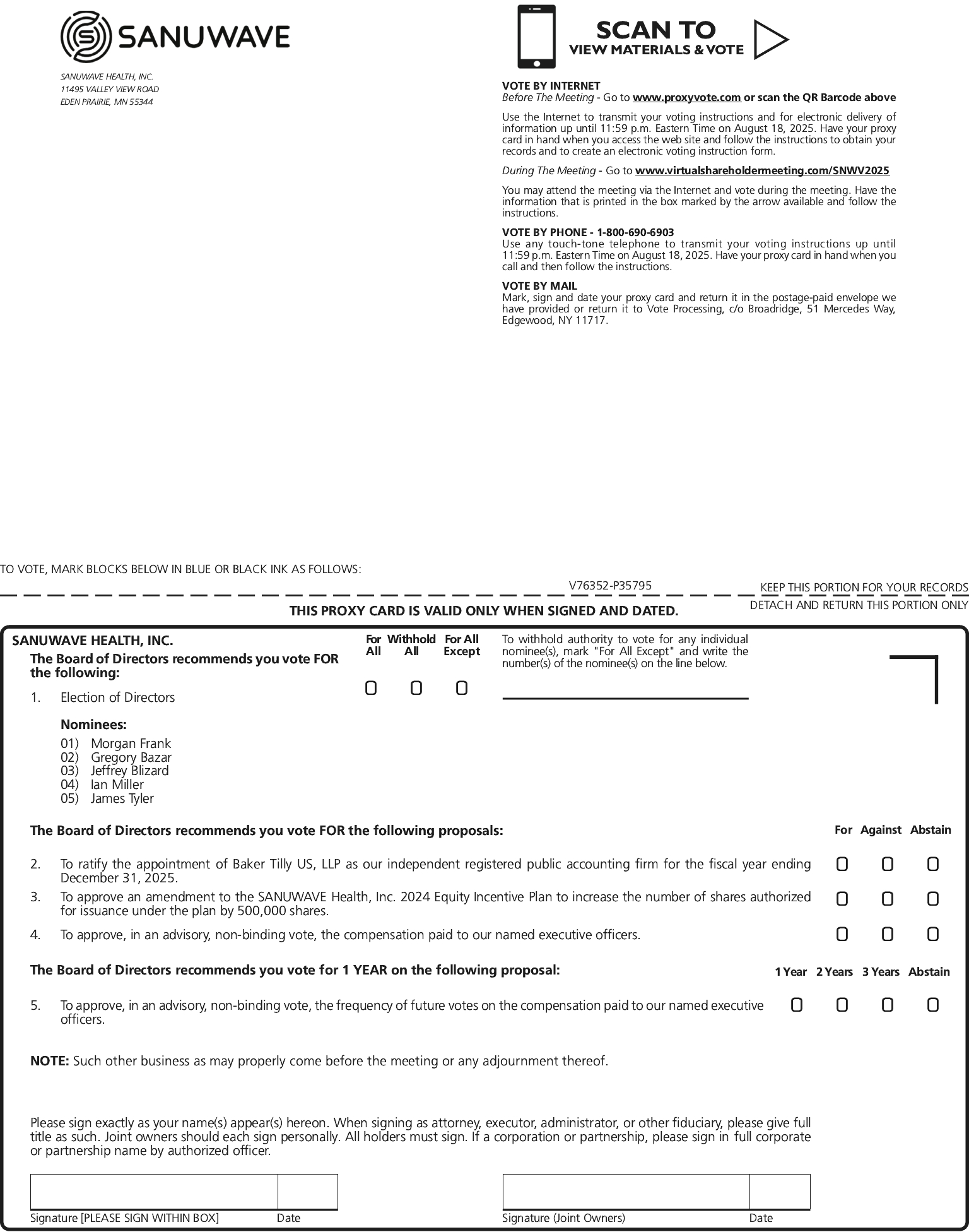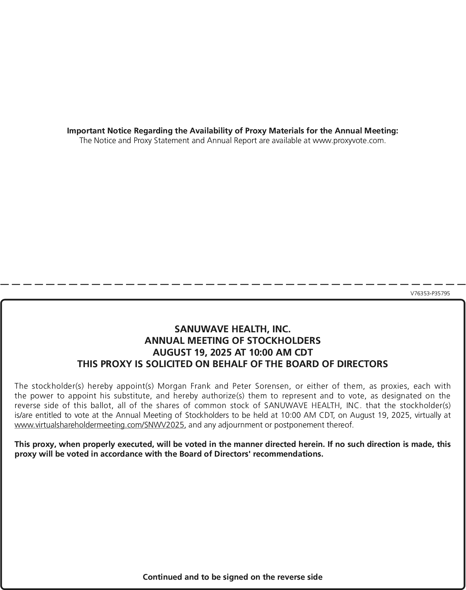 NOTICE IS HEREBY GIVEN that the annual meeting (the “Stockholder Meeting”) of SANUWAVE Health, Inc., a Nevada corporation (“SANUWAVE,” “Sanuwave,” “we,” “us,” or the “Company”), will be held at 10:00 a.m., Central Time, on August 19, 2025. The Stockholder Meeting will be a virtual meeting conducted via live webcast. You are cordially invited to attend the Stockholder Meeting online by visiting https://www.virtualshareholdermeeting.com/SNWV2025 and using a control number assigned by Broadridge Financial Solutions, Inc. (“Broadridge”). The Stockholder Meeting will be held for the purpose of considering and voting on the proposals described below and in the accompanying proxy statement. To register and receive access to the virtual meeting, registered stockholders and beneficial stockholders (those holding shares through a stock brokerage account or by a bank or other holder of record) will need to follow the instructions applicable to them provided in the accompanying proxy statement.
