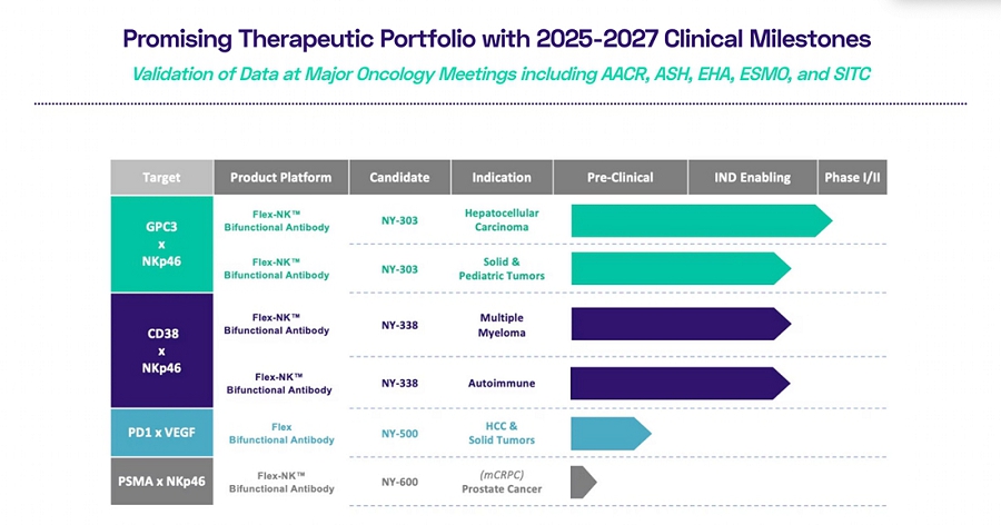 NAYA’s immediate focus is the clinical development of two bifunctional antibodies, NY-303, a GPC-3 targeted natural killer (“NK”) engager which has been cleared to recruit patients in a Monotherapy Safety and Efficacy Phase I/IIa clinical trial in hepatocellular carcinoma (“HCC”) patients not responding to first line immunotherapy, and NY-338, a CD38 targeted NK cell engager, for the treatment of multiple myeloma and auto-immune diseases. Additionally, NAYA aims to advance Initial New Drug (“IND”) filings with the Food and Drug Administration (“FDA”) and phase I/IIa clinical trial initiation in 2026 for NY-500, an AI-optimized PD1-VEGF bifunctional antibody, in first line HCC treatment, and NY-600, a PSMA FLEX NK™ bifunctional antibody (NY-600), for the treatment of prostate cancer.