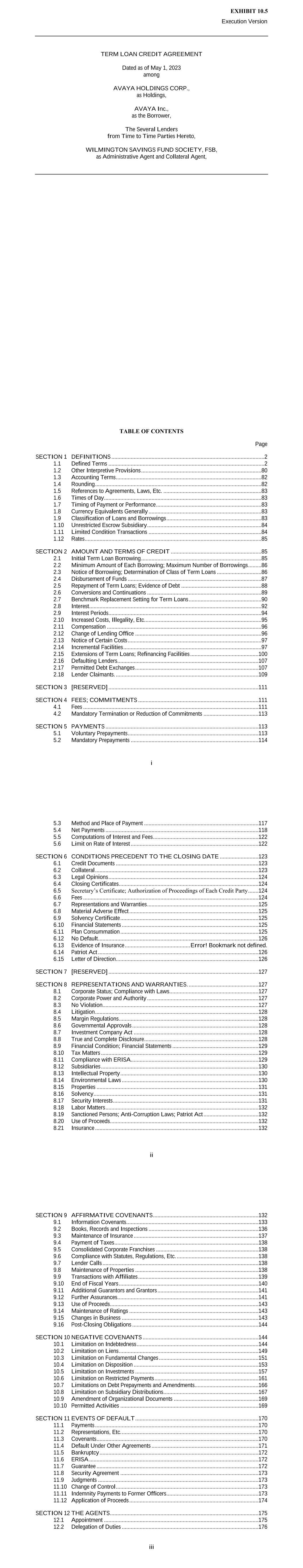 Execution Version TERM LOAN CREDIT AGREEMENT Dated as of May 1, 2023 among AVAYA HOLDINGS CORP., as Holdings, AVAYA Inc., as the Borrower, The Several Lenders from Time to Time Parties Hereto, WILMINGTON SAVINGS FUND SOCIETY, FSB, as Administrative Agent and Collateral Agent, EXHIBIT 10.5 i TABLE OF CONTENTS Page SECTION 1 DEFINITIONS .......................................................................................................2 1.1 Defined Terms .........................................................................................................2 1.2 Other Interpretive Provisions .................................................................................80 1.3 Accounting Terms ..................................................................................................82 1.4 Rounding ................................................................................................................82 1.5 References to Agreements, Laws, Etc. ..................................................................83 1.6 Times of Day..........................................................................................................83 1.7 Timing of Payment or Performance .......................................................................83 1.8 Currency Equivalents Generally ............................................................................83 1.9 Classification of Loans and Borrowings ................................................................83 1.10 Unrestricted Escrow Subsidiary .............................................................................84 1.11 Limited Condition Transactions ............................................................................84 1.12 Rates .......................................................................................................................85 SECTION 2 AMOUNT AND TERMS OF CREDIT .............................................................85 2.1 Initial Term Loan Borrowing .................................................................................85 2.2 Minimum Amount of Each Borrowing; Maximum Number of Borrowings .........86 2.3 Notice of Borrowing; Determination of Class of Term Loans ..............................86 2.4 Disbursement of Funds ..........................................................................................87 2.5 Repayment of Term Loans; Evidence of Debt ......................................................88 2.6 Conversions and Continuations .............................................................................89 2.7 Benchmark Replacement Setting for Term Loans .................................................90 2.8 Interest....................................................................................................................92 2.9 Interest Periods.......................................................................................................94 2.10 Increased Costs, Illegality, Etc. ..............................................................................95 2.11 Compensation ........................................................................................................96 2.12 Change of Lending Office .....................................................................................96 2.13 Notice of Certain Costs ..........................................................................................97 2.14 Incremental Facilities .............................................................................................97 2.15 Extensions of Term Loans; Refinancing Facilities ..............................................100 2.16 Defaulting Lenders...............................................................................................107 2.17 Permitted Debt Exchanges ...................................................................................107 2.18 Lender Claimants. ................................................................................................109 SECTION 3 [RESERVED] .....................................................................................................111 SECTION 4 FEES; COMMITMENTS .................................................................................111 4.1 Fees ......................................................................................................................111 4.2 Mandatory Termination or Reduction of Commitments .....................................113 SECTION 5 PAYMENTS .......................................................................................................113 5.1 Voluntary Prepayments ........................................................................................113 5.2 Mandatory Prepayments ......................................................................................114 ii 5.3 Method and Place of Payment .............................................................................117 5.4 Net Payments .......................................................................................................118 5.5 Computations of Interest and Fees .......................................................................122 5.6 Limit on Rate of Interest ......................................................................................122 SECTION 6 CONDITIONS PRECEDENT TO THE CLOSING DATE ..........................123 6.1 Credit Documents ................................................................................................123 6.2 Collateral ..............................................................................................................123 6.3 Legal Opinions .....................................................................................................124 6.4 Closing Certificates ..............................................................................................124 6.5 Secretary’s Certificate; Authorization of Proceedings of Each Credit Party .......124 6.6