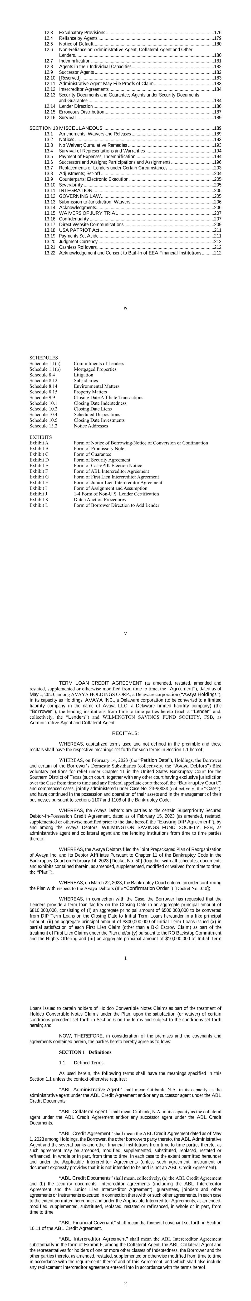 iv 12.3 Exculpatory Provisions ........................................................................................176 12.4 Reliance by Agents ..............................................................................................179 12.5 Notice of Default..................................................................................................180 12.6 Non-Reliance on Administrative Agent, Collateral Agent and Other Lenders .................................................................................................................180 12.7 Indemnification ....................................................................................................181 12.8 Agents in their Individual Capacities ...................................................................182 12.9 Successor Agents .................................................................................................182 12.10 [Reserved] ............................................................................................................183 12.11 Administrative Agent May File Proofs of Claim .................................................183 12.12 Intercreditor Agreements .....................................................................................184 12.13 Security Documents and Guarantee; Agents under Security Documents and Guarantee ......................................................................................................184 12.14 Lender Direction ..................................................................................................186 12.15 Erroneous Distribution .........................................................................................187 12.16 Survival ................................................................................................................189 SECTION 13 MISCELLANEOUS ..........................................................................................189 13.1 Amendments, Waivers and Releases ...................................................................189 13.2 Notices .................................................................................................................193 13.3 No Waiver; Cumulative Remedies ......................................................................193 13.4 Survival of Representations and Warranties ........................................................194 13.5 Payment of Expenses; Indemnification ...............................................................194 13.6 Successors and Assigns; Participations and Assignments ...................................196 13.7 Replacements of Lenders under Certain Circumstances .....................................203 13.8 Adjustments; Set-off ............................................................................................204 13.9 Counterparts; Electronic Execution .....................................................................205 13.10 Severability ..........................................................................................................205 13.11 INTEGRATION ..................................................................................................205 13.12 GOVERNING LAW ............................................................................................205 13.13 Submission to Jurisdiction; Waivers ....................................................................206 13.14 Acknowledgments................................................................................................206 13.15 WAIVERS OF JURY TRIAL .............................................................................207 13.16 Confidentiality .....................................................................................................207 13.17 Direct Website Communications .........................................................................209 13.18 USA PATRIOT Act .............................................................................................211 13.19 Payments Set Aside..............................................................................................211 13.20 Judgment Currency ..............................................................................................212 13.21 Cashless Rollovers ...............................................................................................212 13.22 Acknowledgement and Consent to Bail-In of EEA Financial Institutions ..........212 v SCHEDULES Schedule 1.1(a) Commitments of Lenders Schedule 1.1(b) Mortgaged Properties Schedule 8.4 Litigation Schedule 8.12 Subsidiaries Schedule 8.14 Environmental Matters Schedule 8.15 Property Matters Schedule 9.9 Closing Date Affiliate Transactions Schedule 10.1 Closing Date Indebtedness Schedule 10.2 Closing Date Liens Schedule 10.4 Scheduled Dispositions Schedule 10.5 Closing Date Investments Schedule 13.2 Notice Addresses EXHIBITS Exhibit A Form of Notice of Borrowing/Notice of Conversion or Continuation Exhibit B Form of Promissory Note Exhibit C Form of Guarantee Exhibit D Form of Security Agreement Exhibit E Form of Cash/PIK Election Notice Exhibit F Form of ABL Intercreditor Agreement Exhibit G Form of First Lien Intercreditor Agreement Exhibit H Form of Junior Lien Intercreditor Agreement Exhibit I Form of Assignment and Assumption Exhibit J 1-4 Form of Non-U.S. Lender Certification Exhibit K Exhibit L Dutch Auction Procedures Form of Borrower Direction to Add Lender 1 TERM LOAN CREDIT AGREEMENT (as amended, restated, amended and restated, supplemented or otherwise modified from time to time, the “Agreement”), dated as of May 1, 2023, among AVAYA HOLDINGS CORP., a Delaware corporation (“Avaya Holdings”), in its capacity as Holdings, AVAYA INC., a Delaware corporation (to be converted to a limited liability company in the name of Avaya LLC, a Delaware limited liability company) (the “Borrower”), the lending institutions from time to time parties hereto (each 