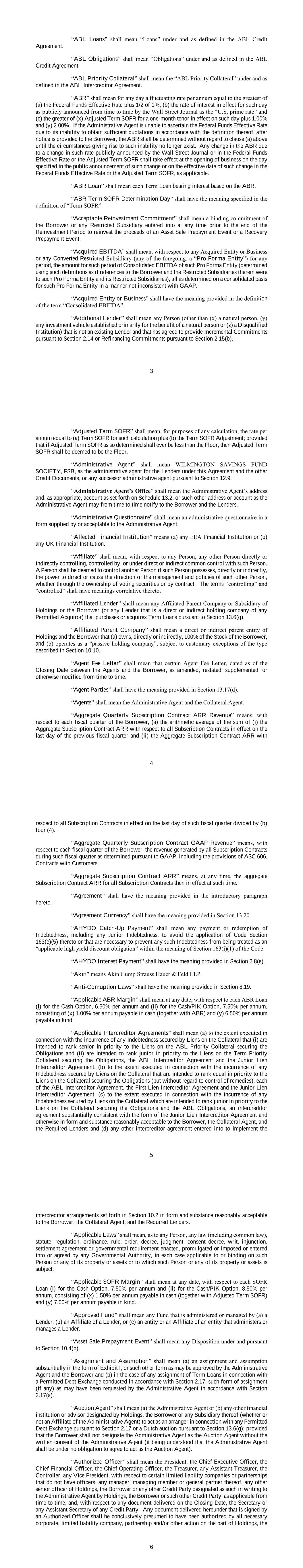 3 “ABL Loans” shall mean “Loans” under and as defined in the ABL Credit Agreement. “ABL Obligations” shall mean “Obligations” under and as defined in the ABL Credit Agreement. “ABL Priority Collateral” shall mean the “ABL Priority Collateral” under and as defined in the ABL Intercreditor Agreement. “ABR” shall mean for any day a fluctuating rate per annum equal to the greatest of (a) the Federal Funds Effective Rate plus 1/2 of 1%, (b) the rate of interest in effect for such day as publicly announced from time to time by the Wall Street Journal as the “U.S. prime rate” and (c) the greater of (x) Adjusted Term SOFR for a one-month tenor in effect on such day plus 1.00% and (y) 2.00%. If the Administrative Agent is unable to ascertain the Federal Funds Effective Rate due to its inability to obtain sufficient quotations in accordance with the definition thereof, after notice is provided to the Borrower, the ABR shall be determined without regard to clause (a) above until the circumstances giving rise to such inability no longer exist. Any change in the ABR due to a change in such rate publicly announced by the Wall Street Journal or in the Federal Funds Effective Rate or the Adjusted Term SOFR shall take effect at the opening of business on the day specified in the public announcement of such change or on the effective date of such change in the Federal Funds Effective Rate or the Adjusted Term SOFR, as applicable. “ABR Loan” shall mean each Term Loan bearing interest based on the ABR. “ABR Term SOFR Determination Day” shall have the meaning specified in the definition of “Term SOFR”. “Acceptable Reinvestment Commitment” shall mean a binding commitment of the Borrower or any Restricted Subsidiary entered into at any time prior to the end of the Reinvestment Period to reinvest the proceeds of an Asset Sale Prepayment Event or a Recovery Prepayment Event. “Acquired EBITDA” shall mean, with respect to any Acquired Entity or Business or any Converted Restricted Subsidiary (any of the foregoing, a “Pro Forma Entity”) for any period, the amount for such period of Consolidated EBITDA of such Pro Forma Entity (determined using such definitions as if references to the Borrower and the Restricted Subsidiaries therein were to such Pro Forma Entity and its Restricted Subsidiaries), all as determined on a consolidated basis for such Pro Forma Entity in a manner not inconsistent with GAAP. “Acquired Entity or Business” shall have the meaning provided in the definition of the term “Consolidated EBITDA”. “Additional Lender” shall mean any Person (other than (x) a natural person, (y) any investment vehicle established primarily for the benefit of a natural person or (z) a Disqualified Institution) that is not an existing Lender and that has agreed to provide Incremental Commitments pursuant to Section 2.14 or Refinancing Commitments pursuant to Section 2.15(b). 4 “Adjusted Term SOFR” shall mean, for purposes of any calculation, the rate per annum equal to (a) Term SOFR for such calculation plus (b) the Term SOFR Adjustment; provided that if Adjusted Term SOFR as so determined shall ever be less than the Floor, then Adjusted Term SOFR shall be deemed to be the Floor. “Administrative Agent” shall mean WILMINGTON SAVINGS FUND SOCIETY, FSB, as the administrative agent for the Lenders under this Agreement and the other Credit Documents, or any successor administrative agent pursuant to Section 12.9. “Administrative Agent’s Office” shall mean the Administrative Agent’s address and, as appropriate, account as set forth on Schedule 13.2, or such other address or account as the Administrative Agent may from time to time notify to the Borrower and the Lenders. “Administrative Questionnaire” shall mean an administrative questionnaire in a form supplied by or acceptable to the Administrative Agent. “Affected Financial Institution” means (a) any EEA Financial Institution or (b) any UK Financial Institution. “Affiliate” shall mean, with respect to any Person, any other Person directly or indirectly controlling, controlled by, or under direct or indirect common control with such Person. A Person shall be deemed to control another Person if such Person possesses, directly or indirectly, the power to direct or cause the direction of the management and policies of such other Person, whether through the ownership of voting securities or by contract. The terms “controlling” and “controlled” shall have meanings correlative thereto. “Affiliated Lender” shall mean any Affiliated Parent Company or Subsidiary of Holdings or the Borrower (or any Lender that is a direct or indirect holding company of any Permitted Acquiror) that purchases or acquires Term Loans pursuant to Section 13.6(g). “Affiliated Parent Company” shall mean a direct or indirect parent entity of Holdings and the Borrower that (a) owns, directly or indirectly, 100% of the Stock of the Borrower, and (b) operates as a “passive holding company”, subject to customary exceptions of the type described in Section 10.10. “Agent Fee Letter” shall mean that certain Agent Fee Letter, dated as of the Closing Date between the Agents and the Borrower, as amended, restated, supplemented, or otherwise modified from time to time. “Agent Parties” shall have the meaning provided in Section 13.17(d). “Agents” shall mean the Administrative Agent and the Collateral Agent. “Aggregate Quarterly Subscription Contract ARR Revenue” means, with respect to each fiscal quarter of the Borrower, (a) the arithmetic average of the sum of (i) the Aggregate Subscription Contract ARR with respect to all Subscription Contracts in effect on the last day of the previous fiscal quarter and (ii) the Aggregate Subscription Contract ARR with 5 respect to all Subscription Contracts in effect on the last day of such fiscal quarter divided by (b) four (4). “Aggregate Quarterly Su