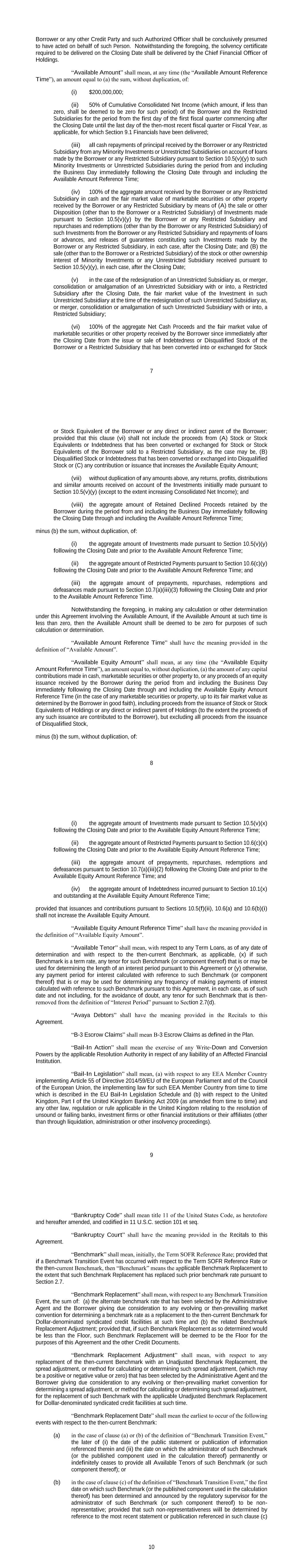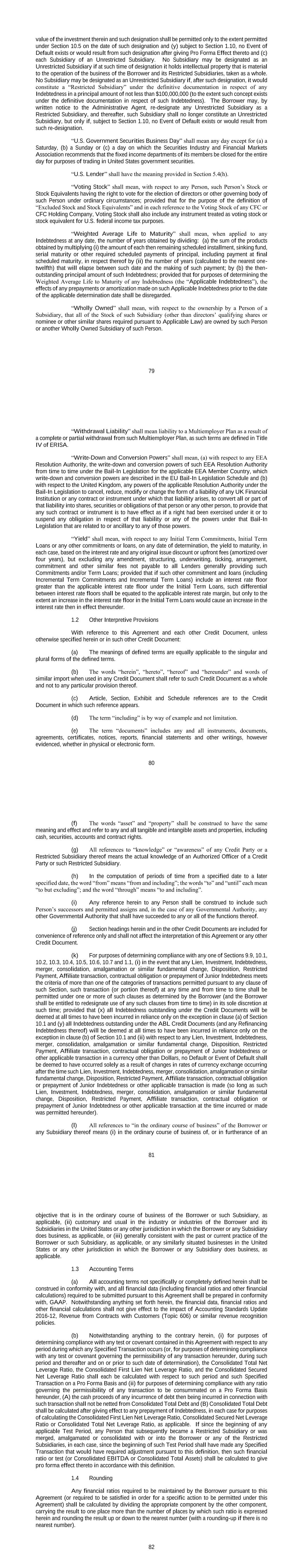 79 value of the investment therein and such designation shall be permitted only to the extent permitted under Section 10.5 on the date of such designation and (y) subject to Section 1.10, no Event of Default exists or would result from such designation after giving Pro Forma Effect thereto and (c) each Subsidiary of an Unrestricted Subsidiary. No Subsidiary may be designated as an Unrestricted Subsidiary if at such time of designation it holds intellectual property that is material to the operation of the business of the Borrower and its Restricted Subsidiaries, taken as a whole. No Subsidiary may be designated as an Unrestricted Subsidiary if, after such designation, it would constitute a “Restricted Subsidiary” under the definitive documentation in respect of any Indebtedness in a principal amount of not less than $100,000,000 (to the extent such concept exists under the definitive documentation in respect of such Indebtedness). The Borrower may, by written notice to the Administrative Agent, re-designate any Unrestricted Subsidiary as a Restricted Subsidiary, and thereafter, such Subsidiary shall no longer constitute an Unrestricted Subsidiary, but only if, subject to Section 1.10, no Event of Default exists or would result from such re-designation. “U.S. Government Securities Business Day” shall mean any day except for (a) a Saturday, (b) a Sunday or (c) a day on which the Securities Industry and Financial Markets Association recommends that the fixed income departments of its members be closed for the entire day for purposes of trading in United States government securities. “U.S. Lender” shall have the meaning provided in Section 5.4(h). “Voting Stock” shall mean, with respect to any Person, such Person’s Stock or Stock Equivalents having the right to vote for the election of directors or other governing body of such Person under ordinary circumstances; provided that for the purpose of the definition of “Excluded Stock and Stock Equivalents” and in each reference to the Voting Stock of any CFC or CFC Holding Company, Voting Stock shall also include any instrument treated as voting stock or stock equivalent for U.S. federal income tax purposes. “Weighted Average Life to Maturity” shall mean, when applied to any Indebtedness at any date, the number of years obtained by dividing: (a) the sum of the products obtained by multiplying (i) the amount of each then remaining scheduled installment, sinking fund, serial maturity or other required scheduled payments of principal, including payment at final scheduled maturity, in respect thereof by (ii) the number of years (calculated to the nearest one- twelfth) that will elapse between such date and the making of such payment; by (b) the then- outstanding principal amount of such Indebtedness; provided that for purposes of determining the Weighted Average Life to Maturity of any Indebtedness (the “Applicable Indebtedness”), the effects of any prepayments or amortization made on such Applicable Indebtedness prior to the date of the applicable determination date shall be disregarded. “Wholly Owned” shall mean, with respect to the ownership by a Person of a Subsidiary, that all of the Stock of such Subsidiary (other than directors’ qualifying shares or nominee or other similar shares required pursuant to Applicable Law) are owned by such Person or another Wholly Owned Subsidiary of such Person. 80 “Withdrawal Liability” shall mean liability to a Multiemployer Plan as a result of a complete or partial withdrawal from such Multiemployer Plan, as such terms are defined in Title IV of ERISA. “Write-Down and Conversion Powers” shall mean, (a) with respect to any EEA Resolution Authority, the write-down and conversion powers of such EEA Resolution Authority from time to time under the Bail-In Legislation for the applicable EEA Member Country, which write-down and conversion powers are described in the EU Bail-In Legislation Schedule and (b) with respect to the United Kingdom, any powers of the applicable Resolution Authority under the Bail-In Legislation to cancel, reduce, modify or change the form of a liability of any UK Financial Institution or any contract or instrument under which that liability arises, to convert all or part of that liability into shares, securities or obligations of that person or any other person, to provide that any such contract or instrument is to have effect as if a right had been exercised under it or to suspend any obligation in respect of that liability or any of the powers under that Bail-In Legislation that are related to or ancillary to any of those powers. “Yield” shall mean, with respect to any Initial Term Commitments, Initial Term Loans or any other commitments or loans, on any date of determination, the yield to maturity, in each case, based on the interest rate and any original issue discount or upfront fees (amortized over four years), but excluding any amendment, structuring, underwriting, ticking, arrangement, commitment and other similar fees not payable to all Lenders generally providing such Commitments and/or Term Loans; provided that if such other commitment and loans (including Incremental Term Commitments and Incremental Term Loans) include an interest rate floor greater than the applicable interest rate floor under the Initial Term Loans, such differential between interest rate floors shall be equated to the applicable interest rate margin, but only to the extent an increase in the interest rate floor in the Initial Term Loans would cause an increase in the interest rate then in effect thereunder. 1.2 Other Interpretive Provisions With reference to this Agreement and each other Credit Document, unless otherwise specified herein or in such other Credit Document: (a) The meanings of defined terms are equally applicable to the singular and plural forms of the defined terms. (b) The words “herein”, “hereto”, “hereof” and “hereunder” and words