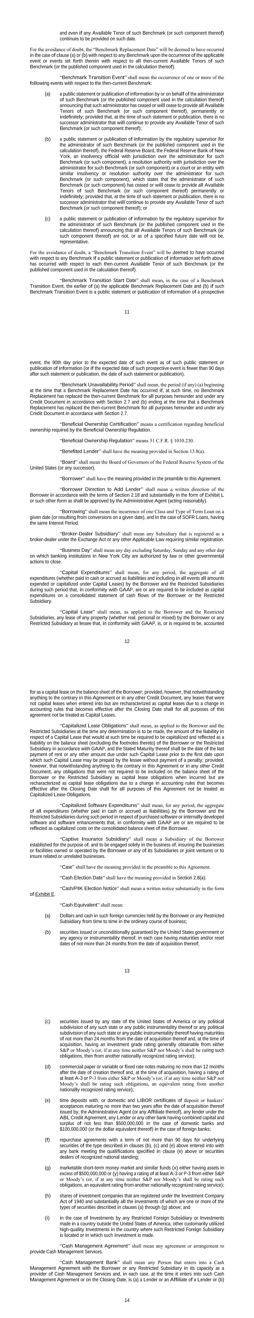 83 1.5 References to Agreements, Laws, Etc. Unless otherwise expressly provided herein, (a) references to organizational documents, agreements (including the Credit Documents) and other Contractual Requirements shall be deemed to include all subsequent amendments, restatements, amendment and restatements, extensions, supplements and other modifications thereto, but only to the extent that such amendments, restatements, amendment and restatements, extensions, supplements and other modifications are permitted or not prohibited by any Credit Document and (b) references to any Applicable Law shall include all statutory and regulatory provisions consolidating, amending, replacing, supplementing or interpreting such Applicable Law. 1.6 Times of Day Unless otherwise specified, all references herein to times of day shall be references to New York City time (daylight or standard, as applicable). 1.7 Timing of Payment or Performance When the payment of any obligation or the performance of any covenant, duty or obligation is stated to be due or performance required on a day which is not a Business Day, the date of such payment (other than as described in the definition of Interest Period) or performance shall extend to the immediately succeeding Business Day. 1.8 Currency Equivalents Generally In determining whether any Indebtedness, Investment, Lien, Disposition, Restricted Payment or any other amount under a “fixed amount” basket denominated in Dollars may be incurred in a currency other than Dollars, such amount shall be determined based on the currency exchange rate determined at the time of such incurrence (or, in the case of any revolving Indebtedness or any amount committed to be made, at the time it is first committed); provided that no Default or Event of Default shall be deemed to have occurred solely as a result of changes in rates of exchange occurring after the time such Indebtedness, Investment, Lien, Disposition, Restricted Payment or such other amount is incurred or made; provided, further that for purpose of determining Consolidated Net Income, Consolidated EBITDA, Consolidated Total Debt or any other amount or ratio determined based on Consolidated Net Income, Consolidated EBITDA or Consolidated Total Debt, amounts in currencies other than Dollars shall be translated into Dollars at the currency exchange rates used in preparing the most recently delivered Section 9.1 Financials. 1.9 Classification of Loans and Borrowings For purposes of this Agreement, Term Loans may be classified and referred to by Class (e.g., an “Initial Term Loan”) or by Type (e.g., a “SOFR Loan”) or by Class and Type (e.g., a “SOFR Initial Term Loan”). Borrowings also may be classified and referred to by Class (e.g., an “Initial Term Loan Borrowing”) or by Type (e.g., a “SOFR Borrowing”) or by Class and Type (e.g., a “SOFR Initial Term Loan Borrowing”). 84 1.10 Unrestricted Escrow Subsidiary Any Indebtedness permitted to be incurred hereunder (including any Incremental Facilities and Refinancing Facilities) may be incurred, at the option of the Borrower, by a newly created and newly designated Unrestricted Subsidiary (an “Unrestricted Escrow Subsidiary”) with no assets other than the cash proceeds of such incurred Indebtedness plus, subject to compliance with Section 10.5, any cash and Cash Equivalents contributed to such Unrestricted Escrow Subsidiary as deposit of interest expenses and fees, additional cash collateral or for other purposes, which Unrestricted Escrow Subsidiary will then merge with and into the Borrower or any of the Restricted Subsidiaries with the Borrower or such Restricted Subsidiary surviving the merger and assuming all obligations of the Unrestricted Escrow Subsidiary. So long as such Indebtedness would have been permitted to be incurred directly by the Borrower or any Restricted Subsidiary upon the incurrence of such Indebtedness by the Unrestricted Escrow Subsidiary, or, with respect to any Indebtedness incurred in connection with a Limited Condition Transaction, at the option of the Borrower, at the time the LCT Election is made, the creation, designation and re- designation of the Unrestricted Escrow Subsidiary and the merger of the Unrestricted Escrow Subsidiary into the Borrower or any Restricted Subsidiary shall not be subject to any additional condition, including any condition that no Default or Event of Default shall have occurred and be continuing at such time. 1.11 Limited Condition Transactions In connection with any action being taken in connection with a Limited Condition Transaction, for purposes of (i) determining compliance with any provision of this Agreement which requires the calculation of any financial ratio or test or (ii) testing availability under baskets set forth in this Agreement (including baskets measured as a percentage of Consolidated EBITDA or Consolidated Total Assets), in each case, at the option of the Borrower (the Borrower’s election to exercise such option in connection with any Limited Condition Transaction, an “LCT Election”; provided that such election may be revoked by the Borrower at any time prior to the consummation or abandonment of the Limited Condition Transaction in question), the date of determination of whether any such action is permitted hereunder shall be deemed to be the date the definitive agreement for such Limited Condition Transaction is entered into (the “LCT Test Date”), and if, after giving Pro Forma Effect to the Limited Condition Transaction, the Borrower or any of its Restricted Subsidiaries would have been permitted to take such action on the relevant LCT Test Date in compliance with such ratio, test or basket, such ratio, test or basket shall be deemed to have been complied with. For the avoidance of doubt, if the Borrower has made an LCT Election and, following the LCT Test Date, any of the ratios, tests or baskets for which compliance was determined or tested as of the LCT T