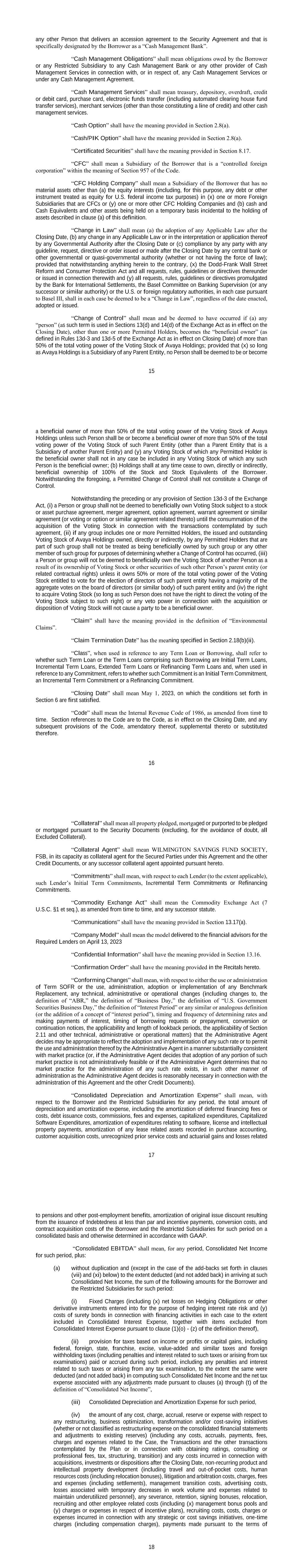 15 any other Person that delivers an accession agreement to the Security Agreement and that is specifically designated by the Borrower as a “Cash Management Bank”. “Cash Management Obligations” shall mean obligations owed by the Borrower or any Restricted Subsidiary to any Cash Management Bank or any other provider of Cash Management Services in connection with, or in respect of, any Cash Management Services or under any Cash Management Agreement. “Cash Management Services” shall mean treasury, depository, overdraft, credit or debit card, purchase card, electronic funds transfer (including automated clearing house fund transfer services), merchant services (other than those constituting a line of credit) and other cash management services. “Cash Option” shall have the meaning provided in Section 2.8(a). “Cash/PIK Option” shall have the meaning provided in Section 2.8(a). “Certificated Securities” shall have the meaning provided in Section 8.17. “CFC” shall mean a Subsidiary of the Borrower that is a “controlled foreign corporation” within the meaning of Section 957 of the Code. “CFC Holding Company” shall mean a Subsidiary of the Borrower that has no material assets other than (a) the equity interests (including, for this purpose, any debt or other instrument treated as equity for U.S. federal income tax purposes) in (x) one or more Foreign Subsidiaries that are CFCs or (y) one or more other CFC Holding Companies and (b) cash and Cash Equivalents and other assets being held on a temporary basis incidental to the holding of assets described in clause (a) of this definition. “Change in Law” shall mean (a) the adoption of any Applicable Law after the Closing Date, (b) any change in any Applicable Law or in the interpretation or application thereof by any Governmental Authority after the Closing Date or (c) compliance by any party with any guideline, request, directive or order issued or made after the Closing Date by any central bank or other governmental or quasi-governmental authority (whether or not having the force of law); provided that notwithstanding anything herein to the contrary, (x) the Dodd-Frank Wall Street Reform and Consumer Protection Act and all requests, rules, guidelines or directives thereunder or issued in connection therewith and (y) all requests, rules, guidelines or directives promulgated by the Bank for International Settlements, the Basel Committee on Banking Supervision (or any successor or similar authority) or the U.S. or foreign regulatory authorities, in each case pursuant to Basel III, shall in each case be deemed to be a “Change in Law”, regardless of the date enacted, adopted or issued. “Change of Control” shall mean and be deemed to have occurred if (a) any “person” (as such term is used in Sections 13(d) and 14(d) of the Exchange Act as in effect on the Closing Date), other than one or more Permitted Holders, becomes the “beneficial owner” (as defined in Rules 13d-3 and 13d-5 of the Exchange Act as in effect on Closing Date) of more than 50% of the total voting power of the Voting Stock of Avaya Holdings; provided that (x) so long as Avaya Holdings is a Subsidiary of any Parent Entity, no Person shall be deemed to be or become 16 a beneficial owner of more than 50% of the total voting power of the Voting Stock of Avaya Holdings unless such Person shall be or become a beneficial owner of more than 50% of the total voting power of the Voting Stock of such Parent Entity (other than a Parent Entity that is a Subsidiary of another Parent Entity) and (y) any Voting Stock of which any Permitted Holder is the beneficial owner shall not in any case be included in any Voting Stock of which any such Person is the beneficial owner; (b) Holdings shall at any time cease to own, directly or indirectly, beneficial ownership of 100% of the Stock and Stock Equivalents of the Borrower. Notwithstanding the foregoing, a Permitted Change of Control shall not constitute a Change of Control. Notwithstanding the preceding or any provision of Section 13d-3 of the Exchange Act, (i) a Person or group shall not be deemed to beneficially own Voting Stock subject to a stock or asset purchase agreement, merger agreement, option agreement, warrant agreement or similar agreement (or voting or option or similar agreement related thereto) until the consummation of the acquisition of the Voting Stock in connection with the transactions contemplated by such agreement, (ii) if any group includes one or more Permitted Holders, the issued and outstanding Voting Stock of Avaya Holdings owned, directly or indirectly, by any Permitted Holders that are part of such group shall not be treated as being beneficially owned by such group or any other member of such group for purposes of determining whether a Change of Control has occurred, (iii) a Person or group will not be deemed to beneficially own the Voting Stock of another Person as a result of its ownership of Voting Stock or other securities of such other Person’s parent entity (or related contractual rights) unless it owns 50% or more of the total voting power of the Voting Stock entitled to vote for the election of directors of such parent entity having a majority of the aggregate votes on the board of directors (or similar body) of such parent entity and (iv) the right to acquire Voting Stock (so long as such Person does not have the right to direct the voting of the Voting Stock subject to such right) or any veto power in connection with the acquisition or disposition of Voting Stock will not cause a party to be a beneficial owner. “Claim” shall have the meaning provided in the definition of “Environmental Claims”. “Claim Termination Date” has the meaning specified in Section 2.18(b)(ii). “Class”, when used in reference to any Term Loan or Borrowing, shall refer to whether such Term Loan or the Term Loans comprising such Borrowing are Initial Term Loans, Incremental Ter