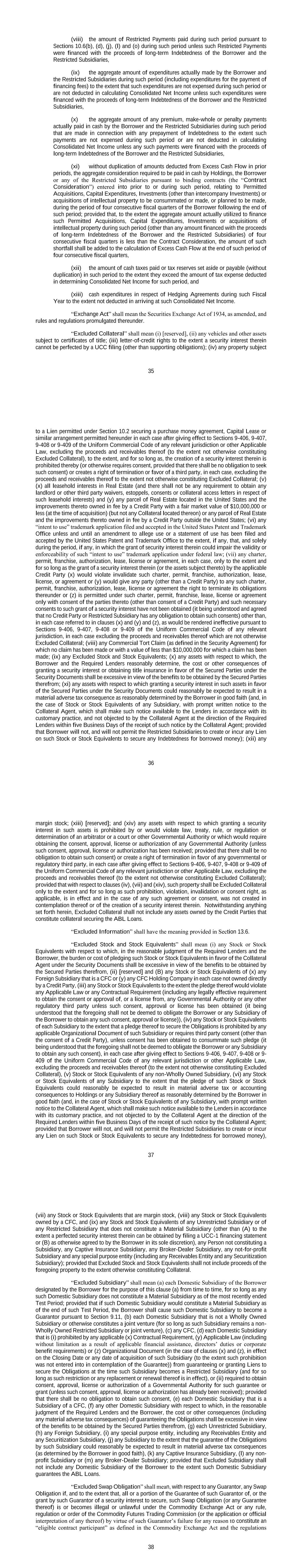 35 (viii) the amount of Restricted Payments paid during such period pursuant to Sections 10.6(b), (d), (j), (l) and (o) during such period unless such Restricted Payments were financed with the proceeds of long-term Indebtedness of the Borrower and the Restricted Subsidiaries, (ix) the aggregate amount of expenditures actually made by the Borrower and the Restricted Subsidiaries during such period (including expenditures for the payment of financing fees) to the extent that such expenditures are not expensed during such period or are not deducted in calculating Consolidated Net Income unless such expenditures were financed with the proceeds of long-term Indebtedness of the Borrower and the Restricted Subsidiaries, (x) the aggregate amount of any premium, make-whole or penalty payments actually paid in cash by the Borrower and the Restricted Subsidiaries during such period that are made in connection with any prepayment of Indebtedness to the extent such payments are not expensed during such period or are not deducted in calculating Consolidated Net Income unless any such payments were financed with the proceeds of long-term Indebtedness of the Borrower and the Restricted Subsidiaries, (xi) without duplication of amounts deducted from Excess Cash Flow in prior periods, the aggregate consideration required to be paid in cash by Holdings, the Borrower or any of the Restricted Subsidiaries pursuant to binding contracts (the “Contract Consideration”) entered into prior to or during such period, relating to Permitted Acquisitions, Capital Expenditures, Investments (other than intercompany Investments) or acquisitions of intellectual property to be consummated or made, or planned to be made, during the period of four consecutive fiscal quarters of the Borrower following the end of such period; provided that, to the extent the aggregate amount actually utilized to finance such Permitted Acquisitions, Capital Expenditures, Investments or acquisitions of intellectual property during such period (other than any amount financed with the proceeds of long-term Indebtedness of the Borrower and the Restricted Subsidiaries) of four consecutive fiscal quarters is less than the Contract Consideration, the amount of such shortfall shall be added to the calculation of Excess Cash Flow at the end of such period of four consecutive fiscal quarters, (xii) the amount of cash taxes paid or tax reserves set aside or payable (without duplication) in such period to the extent they exceed the amount of tax expense deducted in determining Consolidated Net Income for such period, and (xiii) cash expenditures in respect of Hedging Agreements during such Fiscal Year to the extent not deducted in arriving at such Consolidated Net Income. “Exchange Act” shall mean the Securities Exchange Act of 1934, as amended, and rules and regulations promulgated thereunder. “Excluded Collateral” shall mean (i) [reserved], (ii) any vehicles and other assets subject to certificates of title; (iii) letter-of-credit rights to the extent a security interest therein cannot be perfected by a UCC filing (other than supporting obligations); (iv) any property subject 36 to a Lien permitted under Section 10.2 securing a purchase money agreement, Capital Lease or similar arrangement permitted hereunder in each case after giving effect to Sections 9-406, 9-407, 9-408 or 9-409 of the Uniform Commercial Code of any relevant jurisdiction or other Applicable Law, excluding the proceeds and receivables thereof (to the extent not otherwise constituting Excluded Collateral), to the extent, and for so long as, the creation of a security interest therein is prohibited thereby (or otherwise requires consent, provided that there shall be no obligation to seek such consent) or creates a right of termination or favor of a third party, in each case, excluding the proceeds and receivables thereof to the extent not otherwise constituting Excluded Collateral; (v) (x) all leasehold interests in Real Estate (and there shall not be any requirement to obtain any landlord or other third party waivers, estoppels, consents or collateral access letters in respect of such leasehold interests) and (y) any parcel of Real Estate located in the United States and the improvements thereto owned in fee by a Credit Party with a fair market value of $10,000,000 or less (at the time of acquisition) (but not any Collateral located thereon) or any parcel of Real Estate and the improvements thereto owned in fee by a Credit Party outside the United States; (vi) any “intent to use” trademark application filed and accepted in the United States Patent and Trademark Office unless and until an amendment to allege use or a statement of use has been filed and accepted by the United States Patent and Trademark Office to the extent, if any, that, and solely during the period, if any, in which the grant of security interest therein could impair the validity or enforceability of such “intent to use” trademark application under federal law; (vii) any charter, permit, franchise, authorization, lease, license or agreement, in each case, only to the extent and for so long as the grant of a security interest therein (or the assets subject thereto) by the applicable Credit Party (x) would violate invalidate such charter, permit, franchise, authorization, lease, license, or agreement or (y) would give any party (other than a Credit Party) to any such charter, permit, franchise, authorization, lease, license or agreement the right to terminate its obligations thereunder or (z) is permitted under such charter, permit, franchise, lease, license or agreement only with consent of the parties thereto (other than consent of a Credit Party) and such necessary consents to such grant of a security interest have not been obtained (it being understood and agreed that no Credit Party or Restricted Subsidiary has any obligation to obtain such consents) other than, in each case referred to in clauses