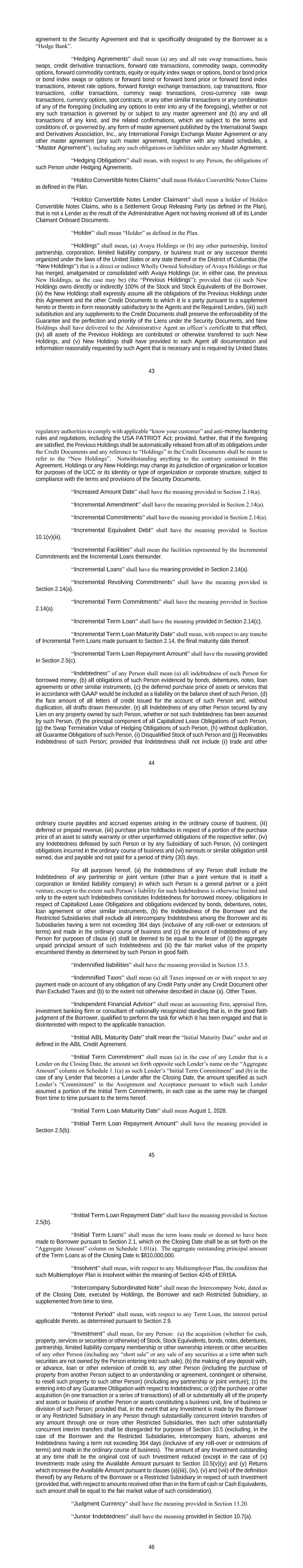 43 agreement to the Security Agreement and that is specifically designated by the Borrower as a “Hedge Bank”. “Hedging Agreements” shall mean (a) any and all rate swap transactions, basis swaps, credit derivative transactions, forward rate transactions, commodity swaps, commodity options, forward commodity contracts, equity or equity index swaps or options, bond or bond price or bond index swaps or options or forward bond or forward bond price or forward bond index transactions, interest rate options, forward foreign exchange transactions, cap transactions, floor transactions, collar transactions, currency swap transactions, cross-currency rate swap transactions, currency options, spot contracts, or any other similar transactions or any combination of any of the foregoing (including any options to enter into any of the foregoing), whether or not any such transaction is governed by or subject to any master agreement and (b) any and all transactions of any kind, and the related confirmations, which are subject to the terms and conditions of, or governed by, any form of master agreement published by the International Swaps and Derivatives Association, Inc., any International Foreign Exchange Master Agreement or any other master agreement (any such master agreement, together with any related schedules, a “Master Agreement”), including any such obligations or liabilities under any Master Agreement. “Hedging Obligations” shall mean, with respect to any Person, the obligations of such Person under Hedging Agreements. “Holdco Convertible Notes Claims” shall mean Holdco Convertible Notes Claims as defined in the Plan. “Holdco Convertible Notes Lender Claimant” shall mean a holder of Holdco Convertible Notes Claims, who is a Settlement Group Releasing Party (as defined in the Plan), that is not a Lender as the result of the Administrative Agent not having received all of its Lender Claimant Onboard Documents. “Holder” shall mean “Holder” as defined in the Plan. “Holdings” shall mean, (a) Avaya Holdings or (b) any other partnership, limited partnership, corporation, limited liability company, or business trust or any successor thereto organized under the laws of the United States or any state thereof or the District of Columbia (the “New Holdings”) that is a direct or indirect Wholly Owned Subsidiary of Avaya Holdings or that has merged, amalgamated or consolidated with Avaya Holdings (or, in either case, the previous New Holdings, as the case may be) (the “Previous Holdings”); provided that (i) such New Holdings owns directly or indirectly 100% of the Stock and Stock Equivalents of the Borrower, (ii) the New Holdings shall expressly assume all the obligations of the Previous Holdings under this Agreement and the other Credit Documents to which it is a party pursuant to a supplement hereto or thereto in form reasonably satisfactory to the Agents and the Required Lenders, (iii) such substitution and any supplements to the Credit Documents shall preserve the enforceability of the Guarantee and the perfection and priority of the Liens under the Security Documents, and New Holdings shall have delivered to the Administrative Agent an officer’s certificate to that effect, (iv) all assets of the Previous Holdings are contributed or otherwise transferred to such New Holdings, and (v) New Holdings shall have provided to each Agent all documentation and information reasonably requested by such Agent that is necessary and is required by United States 44 regulatory authorities to comply with applicable “know your customer” and anti-money laundering rules and regulations, including the USA PATRIOT Act; provided, further, that if the foregoing are satisfied, the Previous Holdings shall be automatically released from all of its obligations under the Credit Documents and any reference to “Holdings” in the Credit Documents shall be meant to refer to the “New Holdings”. Notwithstanding anything to the contrary contained in this Agreement, Holdings or any New Holdings may change its jurisdiction of organization or location for purposes of the UCC or its identity or type of organization or corporate structure, subject to compliance with the terms and provisions of the Security Documents. “Increased Amount Date” shall have the meaning provided in Section 2.14(a). “Incremental Amendment” shall have the meaning provided in Section 2.14(a). “Incremental Commitments” shall have the meaning provided in Section 2.14(a). “Incremental Equivalent Debt” shall have the meaning provided in Section 10.1(v)(ii). “Incremental Facilities” shall mean the facilities represented by the Incremental Commitments and the Incremental Loans thereunder. “Incremental Loans” shall have the meaning provided in Section 2.14(a). “Incremental Revolving Commitments” shall have the meaning provided in Section 2.14(a). “Incremental Term Commitments” shall have the meaning provided in Section 2.14(a). “Incremental Term Loan” shall have the meaning provided in Section 2.14(c). “Incremental Term Loan Maturity Date” shall mean, with respect to any tranche of Incremental Term Loans made pursuant to Section 2.14, the final maturity date thereof. “Incremental Term Loan Repayment Amount” shall have the meaning provided in Section 2.5(c). “Indebtedness” of any Person shall mean (a) all indebtedness of such Person for borrowed money, (b) all obligations of such Person evidenced by bonds, debentures, notes, loan agreements or other similar instruments, (c) the deferred purchase price of assets or services that in accordance with GAAP would be included as a liability on the balance sheet of such Person, (d) the face amount of all letters of credit issued for the account of such Person and, without duplication, all drafts drawn thereunder, (e) all Indebtedness of any other Person secured by any Lien on any property owned by such Person, whether or not such Indeb