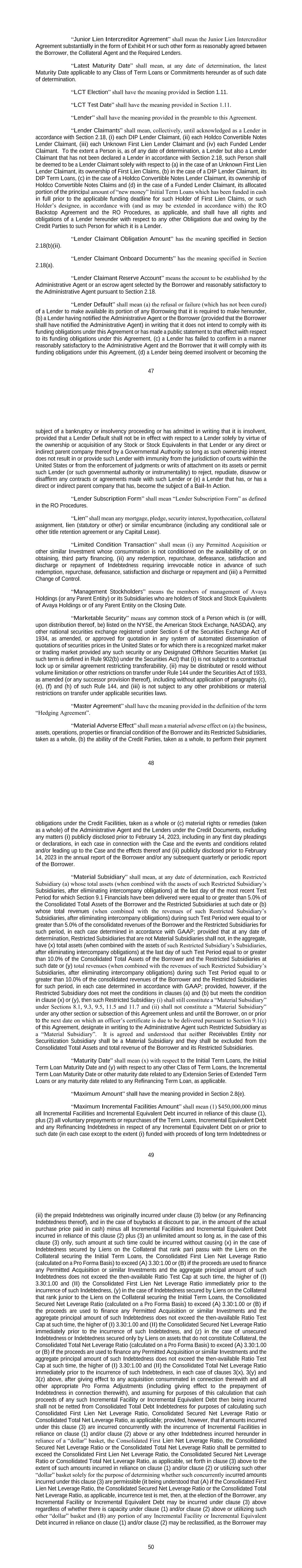 47 “Junior Lien Intercreditor Agreement” shall mean the Junior Lien Intercreditor Agreement substantially in the form of Exhibit H or such other form as reasonably agreed between the Borrower, the Collateral Agent and the Required Lenders. “Latest Maturity Date” shall mean, at any date of determination, the latest Maturity Date applicable to any Class of Term Loans or Commitments hereunder as of such date of determination. “LCT Election” shall have the meaning provided in Section 1.11. “LCT Test Date” shall have the meaning provided in Section 1.11. “Lender” shall have the meaning provided in the preamble to this Agreement. “Lender Claimants” shall mean, collectively, until acknowledged as a Lender in accordance with Section 2.18, (i) each DIP Lender Claimant, (ii) each Holdco Convertible Notes Lender Claimant, (iii) each Unknown First Lien Lender Claimant and (iv) each Funded Lender Claimant. To the extent a Person is, as of any date of determination, a Lender but also a Lender Claimant that has not been declared a Lender in accordance with Section 2.18, such Person shall be deemed to be a Lender Claimant solely with respect to (a) in the case of an Unknown First Lien Lender Claimant, its ownership of First Lien Claims, (b) in the case of a DIP Lender Claimant, its DIP Term Loans, (c) in the case of a Holdco Convertible Notes Lender Claimant, its ownership of Holdco Convertible Notes Claims and (d) in the case of a Funded Lender Claimant, its allocated portion of the principal amount of “new money” Initial Term Loans which has been funded in cash in full prior to the applicable funding deadline for such Holder of First Lien Claims, or such Holder’s designee, in accordance with (and as may be extended in accordance with) the RO Backstop Agreement and the RO Procedures, as applicable, and shall have all rights and obligations of a Lender hereunder with respect to any other Obligations due and owing by the Credit Parties to such Person for which it is a Lender. “Lender Claimant Obligation Amount” has the meaning specified in Section 2.18(b)(ii). “Lender Claimant Onboard Documents” has the meaning specified in Section 2.18(a). “Lender Claimant Reserve Account” means the account to be established by the Administrative Agent or an escrow agent selected by the Borrower and reasonably satisfactory to the Administrative Agent pursuant to Section 2.18. “Lender Default” shall mean (a) the refusal or failure (which has not been cured) of a Lender to make available its portion of any Borrowing that it is required to make hereunder, (b) a Lender having notified the Administrative Agent or the Borrower (provided that the Borrower shall have notified the Administrative Agent) in writing that it does not intend to comply with its funding obligations under this Agreement or has made a public statement to that effect with respect to its funding obligations under this Agreement, (c) a Lender has failed to confirm in a manner reasonably satisfactory to the Administrative Agent and the Borrower that it will comply with its funding obligations under this Agreement, (d) a Lender being deemed insolvent or becoming the 48 subject of a bankruptcy or insolvency proceeding or has admitted in writing that it is insolvent, provided that a Lender Default shall not be in effect with respect to a Lender solely by virtue of the ownership or acquisition of any Stock or Stock Equivalents in that Lender or any direct or indirect parent company thereof by a Governmental Authority so long as such ownership interest does not result in or provide such Lender with immunity from the jurisdiction of courts within the United States or from the enforcement of judgments or writs of attachment on its assets or permit such Lender (or such governmental authority or instrumentality) to reject, repudiate, disavow or disaffirm any contracts or agreements made with such Lender or (e) a Lender that has, or has a direct or indirect parent company that has, become the subject of a Bail-In Action. “Lender Subscription Form” shall mean “Lender Subscription Form” as defined in the RO Procedures. “Lien” shall mean any mortgage, pledge, security interest, hypothecation, collateral assignment, lien (statutory or other) or similar encumbrance (including any conditional sale or other title retention agreement or any Capital Lease). “Limited Condition Transaction” shall mean (i) any Permitted Acquisition or other similar Investment whose consummation is not conditioned on the availability of, or on obtaining, third party financing, (ii) any redemption, repurchase, defeasance, satisfaction and discharge or repayment of Indebtedness requiring irrevocable notice in advance of such redemption, repurchase, defeasance, satisfaction and discharge or repayment and (iii) a Permitted Change of Control. “Management Stockholders” means the members of management of Avaya Holdings (or any Parent Entity) or its Subsidiaries who are holders of Stock and Stock Equivalents of Avaya Holdings or of any Parent Entity on the Closing Date. “Marketable Security” means any common stock of a Person which is (or will, upon distribution thereof, be) listed on the NYSE, the American Stock Exchange, NASDAQ, any other national securities exchange registered under Section 6 of the Securities Exchange Act of 1934, as amended, or approved for quotation in any system of automated dissemination of quotations of securities prices in the United States or for which there is a recognized market maker or trading market provided any such security or any Designated Offshore Securities Market (as such term is defined in Rule 902(b) under the Securities Act) that (i) is not subject to a contractual lock up or similar agreement restricting transferability, (ii) may be distributed or resold without volume limitation or other restrictions on transfer under Rule 144 under the Securities Act of 1933, as amended (or any successor pro