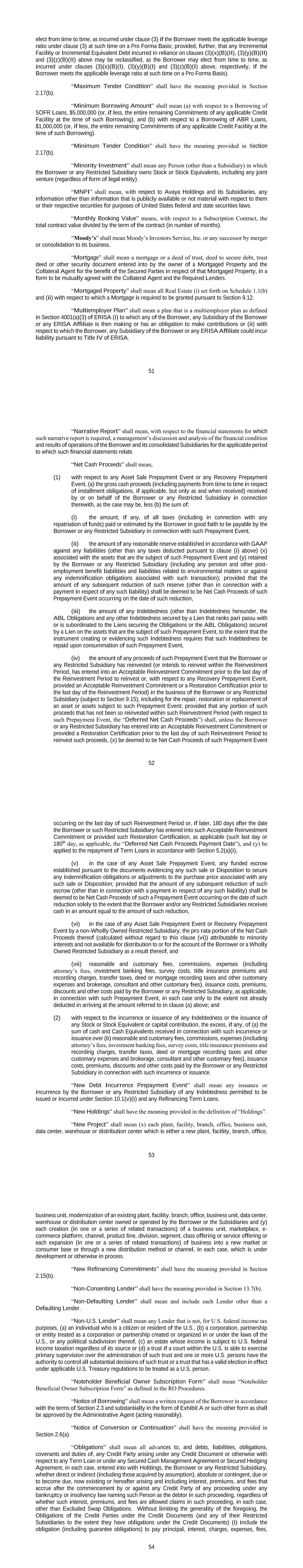 71 “Returns” shall mean, with respect to any Investment, any dividend, distribution, interest, fees, premium, return of capital, repayment of principal, income, profits (from a Disposition or otherwise) and other amounts received or realized in respect of such Investment. “Rights Offering” shall mean “Rights Offering” as defined in the Plan. “RO Backstop Agreement” shall mean “RO Backstop Agreement” as defined in the Plan. “RO Backstop Commitment” shall mean “RO Backstop Commitment” as defined in the Plan. “RO Procedures” shall mean “RO Procedures” as defined in the Plan. “S&P” shall mean Standard & Poor’s Financial Services LLC or any successor by merger or consolidation to its business. “Sanctions” shall have the meaning provided in Section 8.19. “Sanctions Laws” shall have the meaning provided in Section 8.19. “SEC” shall mean the Securities and Exchange Commission or any successor thereto. “Section 9.1 Financials” shall mean the financial statements delivered, or required to be delivered, pursuant to Section 9.1(a) or (b), together with the accompanying officer’s certificate delivered, or required to be delivered, pursuant to Section 9.1(c). “Section 2.15(a) Additional Amendment” shall have the meaning provided in Section 2.15(a)(iii). “Secured Cash Management Agreement” shall mean any Cash Management Agreement that is entered into by and between the Borrower or any Restricted Subsidiary and any Cash Management Bank. “Secured Hedging Agreement” shall mean any Hedging Agreement that is entered into by and between the Borrower or any Restricted Subsidiary and any Hedge Bank. “Secured Parties” shall mean the Administrative Agent, the Collateral Agent, each Lender, each Hedge Bank, each Cash Management Bank and each sub-agent pursuant to Section 12 appointed by the Administrative Agent with respect to matters relating to the Credit Facilities or appointed by the Collateral Agent with respect to matters relating to any Security Document. “Securities Act” shall mean the Securities Act of 1933, as amended, and the rules and regulations promulgated thereunder. “Securitization Asset” shall mean (a) any accounts receivable, royalty or other revenue streams and other rights to payment or related assets and the proceeds thereof, in each 72 case, subject to a Securitization Facility and (b) all collateral securing such receivable or asset, all contracts and contract rights, guaranties or other obligations in respect of such receivable or asset, lockbox accounts and records with respect to such account or asset and any other assets customarily transferred (or in respect of which security interests are customarily granted), together with accounts or assets in a securitization financing and which in the case of clause (a) and (b) above are sold, conveyed, assigned or otherwise transferred or pledged in connection with a Qualified Securitization Financing. “Securitization Facility” shall mean any transaction or series of securitization financings that may be entered into by the Borrower or any Restricted Subsidiary pursuant to which the Borrower or any such Restricted Subsidiary may sell, convey or otherwise transfer, or may grant a security interest in, Securitization Assets to either (a) a Person that is not the Borrower or a Restricted Subsidiary or (b) a Securitization Subsidiary that in turn sells such Securitization Assets to a Person that is not the Borrower or a Restricted Subsidiary, or may grant a security interest in, any Securitization Assets of the Borrower or any of its Subsidiaries. “Securitization Repurchase Obligation” shall mean any obligation of a seller (or any guaranty of such obligation) of (i) Receivables Facility Assets under a Permitted Receivables Financing to repurchase Receivables Facility Assets or (ii) Securitization Assets in a Qualified Securitization Financing to repurchase Securitization Assets, in either case, arising as a result of a breach of a representation, warranty or covenant or otherwise, including, without limitation, as a result of a receivable or portion thereof becoming subject to any asserted defense, dispute, offset or counterclaim of any kind as a result of any action taken by, any failure to take action by or any other event relating to the seller. “Securitization Subsidiary” shall mean any Subsidiary of the Borrower in each case formed for the purpose of, and that solely engages in, one or more Qualified Securitization Financings and other activities reasonably related thereto or another Person formed for the purposes of engaging in a Qualified Securitization Financing in which the Borrower or any Restricted Subsidiary makes an Investment and to which the Borrower or such Restricted Subsidiary transfers Securitization Assets and related assets. “Security Agreement” shall mean the Term Loan Security Agreement, dated as of the Closing Date, in substantially the form attached hereto as Exhibit D (as the same may be amended, restated, amended and restated, supplemented or otherwise modified or replaced from time to time), entered into by the Borrower, the other grantors party thereto and the Collateral Agent for the benefit of the Secured Parties. “Security Documents” shall mean, collectively, (a) the Security Agreement, (b) the Mortgages, (c) all Applicable Intercreditor Agreements and (d) each intellectual property security agreement and each other security agreement or other instrument or document executed and delivered pursuant to Section 9.11 or 9.12 or pursuant to any other such Security Documents. “Series” shall have the meaning provided in Section 2.14(a). “Similar Business” shall mean any business conducted or proposed to be conducted by the Borrower and the Restricted Subsidiaries, taken as a whole, on the Closing Date 73 or any other business activities which are reasonable extensions thereof or otherwise similar, incidental, coroll