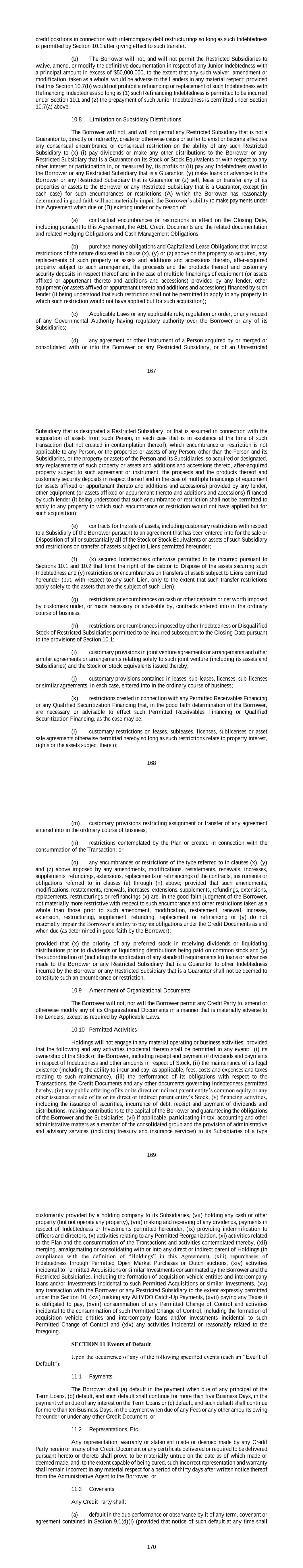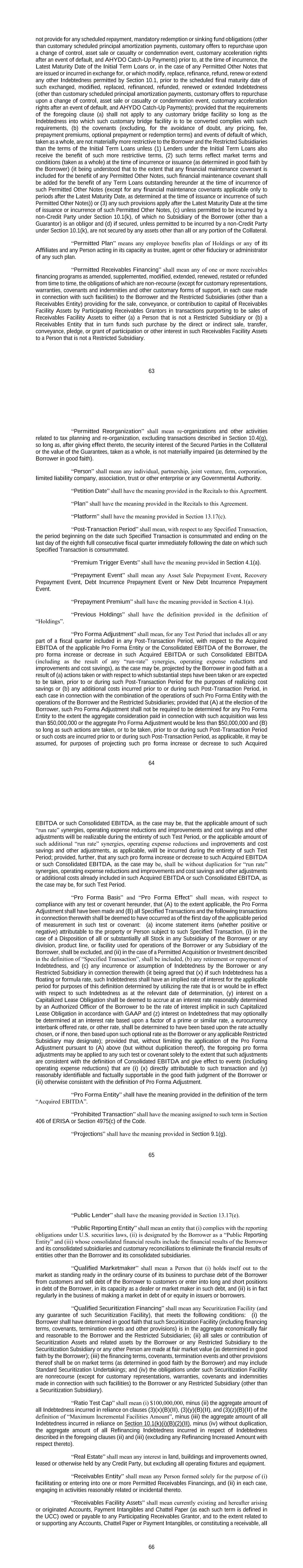 63 not provide for any scheduled repayment, mandatory redemption or sinking fund obligations (other than customary scheduled principal amortization payments, customary offers to repurchase upon a change of control, asset sale or casualty or condemnation event, customary acceleration rights after an event of default, and AHYDO Catch-Up Payments) prior to, at the time of incurrence, the Latest Maturity Date of the Initial Term Loans or, in the case of any Permitted Other Notes that are issued or incurred in exchange for, or which modify, replace, refinance, refund, renew or extend any other Indebtedness permitted by Section 10.1, prior to the scheduled final maturity date of such exchanged, modified, replaced, refinanced, refunded, renewed or extended Indebtedness (other than customary scheduled principal amortization payments, customary offers to repurchase upon a change of control, asset sale or casualty or condemnation event, customary acceleration rights after an event of default, and AHYDO Catch-Up Payments); provided that the requirements of the foregoing clause (a) shall not apply to any customary bridge facility so long as the Indebtedness into which such customary bridge facility is to be converted complies with such requirements, (b) the covenants (excluding, for the avoidance of doubt, any pricing, fee, prepayment premiums, optional prepayment or redemption terms) and events of default of which, taken as a whole, are not materially more restrictive to the Borrower and the Restricted Subsidiaries than the terms of the Initial Term Loans unless (1) Lenders under the Initial Term Loans also receive the benefit of such more restrictive terms, (2) such terms reflect market terms and conditions (taken as a whole) at the time of incurrence or issuance (as determined in good faith by the Borrower) (it being understood that to the extent that any financial maintenance covenant is included for the benefit of any Permitted Other Notes, such financial maintenance covenant shall be added for the benefit of any Term Loans outstanding hereunder at the time of incurrence of such Permitted Other Notes (except for any financial maintenance covenants applicable only to periods after the Latest Maturity Date, as determined at the time of issuance or incurrence of such Permitted Other Notes)) or (3) any such provisions apply after the Latest Maturity Date at the time of issuance or incurrence of such Permitted Other Notes, (c) unless permitted to be incurred by a non-Credit Party under Section 10.1(k), of which no Subsidiary of the Borrower (other than a Guarantor) is an obligor and (d) if secured, unless permitted to be incurred by a non-Credit Party under Section 10.1(k), are not secured by any assets other than all or any portion of the Collateral. “Permitted Plan” means any employee benefits plan of Holdings or any of its Affiliates and any Person acting in its capacity as trustee, agent or other fiduciary or administrator of any such plan. “Permitted Receivables Financing” shall mean any of one or more receivables financing programs as amended, supplemented, modified, extended, renewed, restated or refunded from time to time, the obligations of which are non-recourse (except for customary representations, warranties, covenants and indemnities and other customary forms of support, in each case made in connection with such facilities) to the Borrower and the Restricted Subsidiaries (other than a Receivables Entity) providing for the sale, conveyance, or contribution to capital of Receivables Facility Assets by Participating Receivables Grantors in transactions purporting to be sales of Receivables Facility Assets to either (a) a Person that is not a Restricted Subsidiary or (b) a Receivables Entity that in turn funds such purchase by the direct or indirect sale, transfer, conveyance, pledge, or grant of participation or other interest in such Receivables Facility Assets to a Person that is not a Restricted Subsidiary. 64 “Permitted Reorganization” shall mean re-organizations and other activities related to tax planning and re-organization, excluding transactions described in Section 10.4(g), so long as, after giving effect thereto, the security interest of the Secured Parties in the Collateral or the value of the Guarantees, taken as a whole, is not materially impaired (as determined by the Borrower in good faith). “Person” shall mean any individual, partnership, joint venture, firm, corporation, limited liability company, association, trust or other enterprise or any Governmental Authority. “Petition Date” shall have the meaning provided in the Recitals to this Agreement. “Plan” shall have the meaning provided in the Recitals to this Agreement. “Platform” shall have the meaning provided in Section 13.17(c). “Post-Transaction Period” shall mean, with respect to any Specified Transaction, the period beginning on the date such Specified Transaction is consummated and ending on the last day of the eighth full consecutive fiscal quarter immediately following the date on which such Specified Transaction is consummated. “Premium Trigger Events” shall have the meaning provided in Section 4.1(a). “Prepayment Event” shall mean any Asset Sale Prepayment Event, Recovery Prepayment Event, Debt Incurrence Prepayment Event or New Debt Incurrence Prepayment Event. “Prepayment Premium” shall have the meaning provided in Section 4.1(a). “Previous Holdings” shall have the definition provided in the definition of “Holdings”. “Pro Forma Adjustment” shall mean, for any Test Period that includes all or any part of a fiscal quarter included in any Post-Transaction Period, with respect to the Acquired EBITDA of the applicable Pro Forma Entity or the Consolidated EBITDA of the Borrower, the pro forma increase or decrease in such Acquired EBITDA or such Consolidated EBITDA (including as the result of any “run-rate” synergies, operating expense reductions and impr