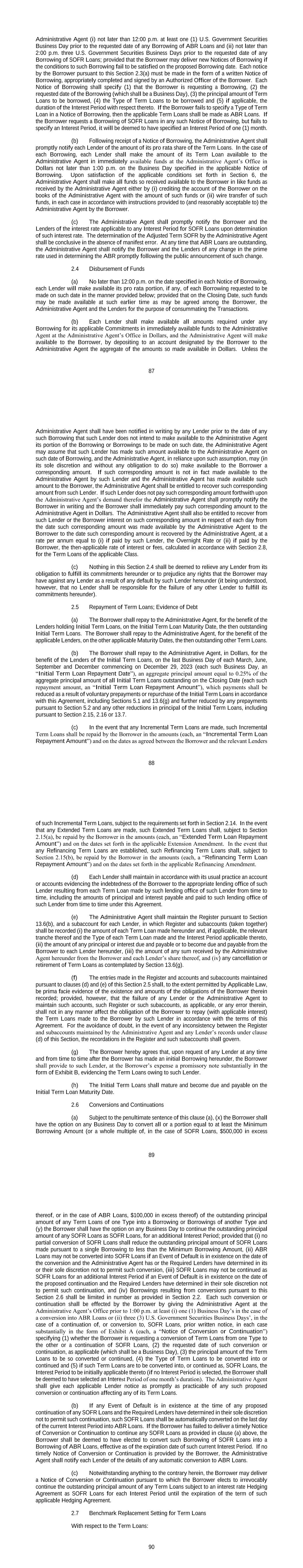 87 Administrative Agent (i) not later than 12:00 p.m. at least one (1) U.S. Government Securities Business Day prior to the requested date of any Borrowing of ABR Loans and (ii) not later than 2:00 p.m. three U.S. Government Securities Business Days prior to the requested date of any Borrowing of SOFR Loans; provided that the Borrower may deliver new Notices of Borrowing if the conditions to such Borrowing fail to be satisfied on the proposed Borrowing date. Each notice by the Borrower pursuant to this Section 2.3(a) must be made in the form of a written Notice of Borrowing, appropriately completed and signed by an Authorized Officer of the Borrower. Each Notice of Borrowing shall specify (1) that the Borrower is requesting a Borrowing, (2) the requested date of the Borrowing (which shall be a Business Day), (3) the principal amount of Term Loans to be borrowed, (4) the Type of Term Loans to be borrowed and (5) if applicable, the duration of the Interest Period with respect thereto. If the Borrower fails to specify a Type of Term Loan in a Notice of Borrowing, then the applicable Term Loans shall be made as ABR Loans. If the Borrower requests a Borrowing of SOFR Loans in any such Notice of Borrowing, but fails to specify an Interest Period, it will be deemed to have specified an Interest Period of one (1) month. (b) Following receipt of a Notice of Borrowing, the Administrative Agent shall promptly notify each Lender of the amount of its pro rata share of the Term Loans. In the case of each Borrowing, each Lender shall make the amount of its Term Loan available to the Administrative Agent in immediately available funds at the Administrative Agent’s Office in Dollars not later than 1:00 p.m. on the Business Day specified in the applicable Notice of Borrowing. Upon satisfaction of the applicable conditions set forth in Section 6, the Administrative Agent shall make all funds so received available to the Borrower in like funds as received by the Administrative Agent either by (i) crediting the account of the Borrower on the books of the Administrative Agent with the amount of such funds or (ii) wire transfer of such funds, in each case in accordance with instructions provided to (and reasonably acceptable to) the Administrative Agent by the Borrower. (c) The Administrative Agent shall promptly notify the Borrower and the Lenders of the interest rate applicable to any Interest Period for SOFR Loans upon determination of such interest rate. The determination of the Adjusted Term SOFR by the Administrative Agent shall be conclusive in the absence of manifest error. At any time that ABR Loans are outstanding, the Administrative Agent shall notify the Borrower and the Lenders of any change in the prime rate used in determining the ABR promptly following the public announcement of such change. 2.4 Disbursement of Funds (a) No later than 12:00 p.m. on the date specified in each Notice of Borrowing, each Lender will make available its pro rata portion, if any, of each Borrowing requested to be made on such date in the manner provided below; provided that on the Closing Date, such funds may be made available at such earlier time as may be agreed among the Borrower, the Administrative Agent and the Lenders for the purpose of consummating the Transactions. (b) Each Lender shall make available all amounts required under any Borrowing for its applicable Commitments in immediately available funds to the Administrative Agent at the Administrative Agent’s Office in Dollars, and the Administrative Agent will make available to the Borrower, by depositing to an account designated by the Borrower to the Administrative Agent the aggregate of the amounts so made available in Dollars. Unless the 88 Administrative Agent shall have been notified in writing by any Lender prior to the date of any such Borrowing that such Lender does not intend to make available to the Administrative Agent its portion of the Borrowing or Borrowings to be made on such date, the Administrative Agent may assume that such Lender has made such amount available to the Administrative Agent on such date of Borrowing, and the Administrative Agent, in reliance upon such assumption, may (in its sole discretion and without any obligation to do so) make available to the Borrower a corresponding amount. If such corresponding amount is not in fact made available to the Administrative Agent by such Lender and the Administrative Agent has made available such amount to the Borrower, the Administrative Agent shall be entitled to recover such corresponding amount from such Lender. If such Lender does not pay such corresponding amount forthwith upon the Administrative Agent’s demand therefor the Administrative Agent shall promptly notify the Borrower in writing and the Borrower shall immediately pay such corresponding amount to the Administrative Agent in Dollars. The Administrative Agent shall also be entitled to recover from such Lender or the Borrower interest on such corresponding amount in respect of each day from the date such corresponding amount was made available by the Administrative Agent to the Borrower to the date such corresponding amount is recovered by the Administrative Agent, at a rate per annum equal to (i) if paid by such Lender, the Overnight Rate or (ii) if paid by the Borrower, the then-applicable rate of interest or fees, calculated in accordance with Section 2.8, for the Term Loans of the applicable Class. (c) Nothing in this Section 2.4 shall be deemed to relieve any Lender from its obligation to fulfill its commitments hereunder or to prejudice any rights that the Borrower may have against any Lender as a result of any default by such Lender hereunder (it being understood, however, that no Lender shall be responsible for the failure of any other Lender to fulfill its commitments hereunder). 2.5 Repayment of Term Loans; Evidence of Debt (a) The Borrower shall repay to the Administrative Agent, for the benefit of the Lenders