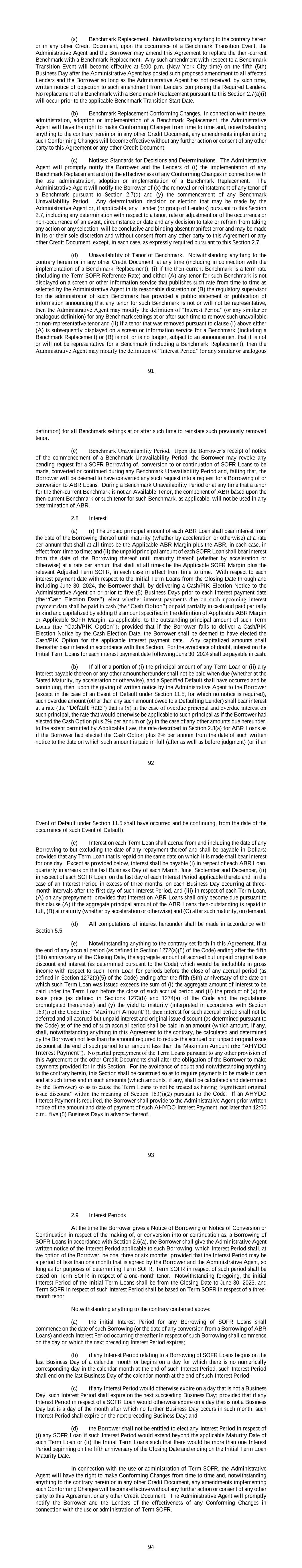 91 (a) Benchmark Replacement. Notwithstanding anything to the contrary herein or in any other Credit Document, upon the occurrence of a Benchmark Transition Event, the Administrative Agent and the Borrower may amend this Agreement to replace the then-current Benchmark with a Benchmark Replacement. Any such amendment with respect to a Benchmark Transition Event will become effective at 5:00 p.m. (New York City time) on the fifth (5th) Business Day after the Administrative Agent has posted such proposed amendment to all affected Lenders and the Borrower so long as the Administrative Agent has not received, by such time, written notice of objection to such amendment from Lenders comprising the Required Lenders. No replacement of a Benchmark with a Benchmark Replacement pursuant to this Section 2.7(a)(i) will occur prior to the applicable Benchmark Transition Start Date. (b) Benchmark Replacement Conforming Changes. In connection with the use, administration, adoption or implementation of a Benchmark Replacement, the Administrative Agent will have the right to make Conforming Changes from time to time and, notwithstanding anything to the contrary herein or in any other Credit Document, any amendments implementing such Conforming Changes will become effective without any further action or consent of any other party to this Agreement or any other Credit Document. (c) Notices; Standards for Decisions and Determinations. The Administrative Agent will promptly notify the Borrower and the Lenders of (i) the implementation of any Benchmark Replacement and (ii) the effectiveness of any Conforming Changes in connection with the use, administration, adoption or implementation of a Benchmark Replacement. The Administrative Agent will notify the Borrower of (x) the removal or reinstatement of any tenor of a Benchmark pursuant to Section 2.7(d) and (y) the commencement of any Benchmark Unavailability Period. Any determination, decision or election that may be made by the Administrative Agent or, if applicable, any Lender (or group of Lenders) pursuant to this Section 2.7, including any determination with respect to a tenor, rate or adjustment or of the occurrence or non-occurrence of an event, circumstance or date and any decision to take or refrain from taking any action or any selection, will be conclusive and binding absent manifest error and may be made in its or their sole discretion and without consent from any other party to this Agreement or any other Credit Document, except, in each case, as expressly required pursuant to this Section 2.7. (d) Unavailability of Tenor of Benchmark. Notwithstanding anything to the contrary herein or in any other Credit Document, at any time (including in connection with the implementation of a Benchmark Replacement), (i) if the then-current Benchmark is a term rate (including the Term SOFR Reference Rate) and either (A) any tenor for such Benchmark is not displayed on a screen or other information service that publishes such rate from time to time as selected by the Administrative Agent in its reasonable discretion or (B) the regulatory supervisor for the administrator of such Benchmark has provided a public statement or publication of information announcing that any tenor for such Benchmark is not or will not be representative, then the Administrative Agent may modify the definition of “Interest Period” (or any similar or analogous definition) for any Benchmark settings at or after such time to remove such unavailable or non-representative tenor and (ii) if a tenor that was removed pursuant to clause (i) above either (A) is subsequently displayed on a screen or information service for a Benchmark (including a Benchmark Replacement) or (B) is not, or is no longer, subject to an announcement that it is not or will not be representative for a Benchmark (including a Benchmark Replacement), then the Administrative Agent may modify the definition of “Interest Period” (or any similar or analogous 92 definition) for all Benchmark settings at or after such time to reinstate such previously removed tenor. (e) Benchmark Unavailability Period. Upon the Borrower’s receipt of notice of the commencement of a Benchmark Unavailability Period, the Borrower may revoke any pending request for a SOFR Borrowing of, conversion to or continuation of SOFR Loans to be made, converted or continued during any Benchmark Unavailability Period and, failing that, the Borrower will be deemed to have converted any such request into a request for a Borrowing of or conversion to ABR Loans. During a Benchmark Unavailability Period or at any time that a tenor for the then-current Benchmark is not an Available Tenor, the component of ABR based upon the then-current Benchmark or such tenor for such Benchmark, as applicable, will not be used in any determination of ABR. 2.8 Interest (a) (i) The unpaid principal amount of each ABR Loan shall bear interest from the date of the Borrowing thereof until maturity (whether by acceleration or otherwise) at a rate per annum that shall at all times be the Applicable ABR Margin plus the ABR, in each case, in effect from time to time; and (ii) the unpaid principal amount of each SOFR Loan shall bear interest from the date of the Borrowing thereof until maturity thereof (whether by acceleration or otherwise) at a rate per annum that shall at all times be the Applicable SOFR Margin plus the relevant Adjusted Term SOFR, in each case in effect from time to time. With respect to each interest payment date with respect to the Initial Term Loans from the Closing Date through and including June 30, 2024, the Borrower shall, by delivering a Cash/PIK Election Notice to the Administrative Agent on or prior to five (5) Business Days prior to each interest payment date (the “Cash Election Date”), elect whether interest payments due on such upcoming interest payment date shall be paid in cash (the “Cash Option”) or paid partially in cash and paid partially in k