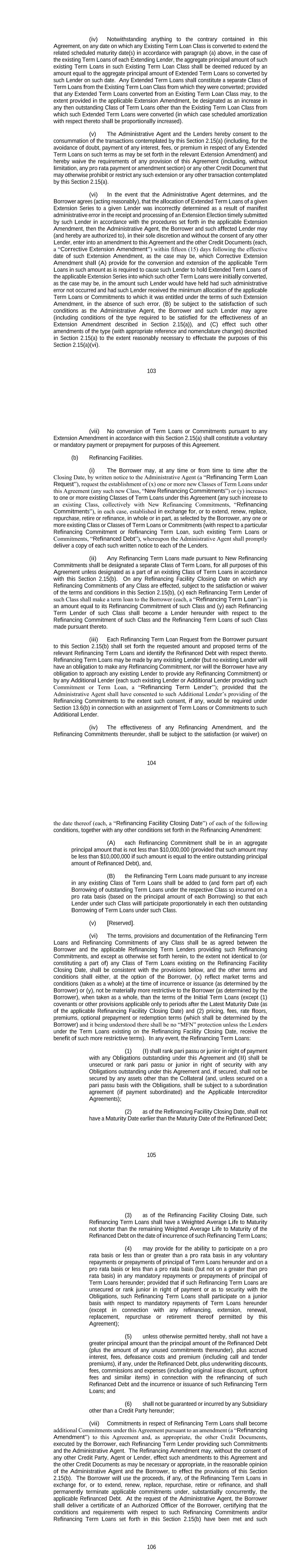 103 (iv) Notwithstanding anything to the contrary contained in this Agreement, on any date on which any Existing Term Loan Class is converted to extend the related scheduled maturity date(s) in accordance with paragraph (a) above, in the case of the existing Term Loans of each Extending Lender, the aggregate principal amount of such existing Term Loans in such Existing Term Loan Class shall be deemed reduced by an amount equal to the aggregate principal amount of Extended Term Loans so converted by such Lender on such date. Any Extended Term Loans shall constitute a separate Class of Term Loans from the Existing Term Loan Class from which they were converted; provided that any Extended Term Loans converted from an Existing Term Loan Class may, to the extent provided in the applicable Extension Amendment, be designated as an increase in any then outstanding Class of Term Loans other than the Existing Term Loan Class from which such Extended Term Loans were converted (in which case scheduled amortization with respect thereto shall be proportionally increased). (v) The Administrative Agent and the Lenders hereby consent to the consummation of the transactions contemplated by this Section 2.15(a) (including, for the avoidance of doubt, payment of any interest, fees, or premium in respect of any Extended Term Loans on such terms as may be set forth in the relevant Extension Amendment) and hereby waive the requirements of any provision of this Agreement (including, without limitation, any pro rata payment or amendment section) or any other Credit Document that may otherwise prohibit or restrict any such extension or any other transaction contemplated by this Section 2.15(a). (vi) In the event that the Administrative Agent determines, and the Borrower agrees (acting reasonably), that the allocation of Extended Term Loans of a given Extension Series to a given Lender was incorrectly determined as a result of manifest administrative error in the receipt and processing of an Extension Election timely submitted by such Lender in accordance with the procedures set forth in the applicable Extension Amendment, then the Administrative Agent, the Borrower and such affected Lender may (and hereby are authorized to), in their sole discretion and without the consent of any other Lender, enter into an amendment to this Agreement and the other Credit Documents (each, a “Corrective Extension Amendment”) within fifteen (15) days following the effective date of such Extension Amendment, as the case may be, which Corrective Extension Amendment shall (A) provide for the conversion and extension of the applicable Term Loans in such amount as is required to cause such Lender to hold Extended Term Loans of the applicable Extension Series into which such other Term Loans were initially converted, as the case may be, in the amount such Lender would have held had such administrative error not occurred and had such Lender received the minimum allocation of the applicable Term Loans or Commitments to which it was entitled under the terms of such Extension Amendment, in the absence of such error, (B) be subject to the satisfaction of such conditions as the Administrative Agent, the Borrower and such Lender may agree (including conditions of the type required to be satisfied for the effectiveness of an Extension Amendment described in Section 2.15(a)), and (C) effect such other amendments of the type (with appropriate reference and nomenclature changes) described in Section 2.15(a) to the extent reasonably necessary to effectuate the purposes of this Section 2.15(a)(vi). 104 (vii) No conversion of Term Loans or Commitments pursuant to any Extension Amendment in accordance with this Section 2.15(a) shall constitute a voluntary or mandatory payment or prepayment for purposes of this Agreement. (b) Refinancing Facilities. (i) The Borrower may, at any time or from time to time after the Closing Date, by written notice to the Administrative Agent (a “Refinancing Term Loan Request”), request the establishment of (x) one or more new Classes of Term Loans under this Agreement (any such new Class, “New Refinancing Commitments”) or (y) increases to one or more existing Classes of Term Loans under this Agreement (any such increase to an existing Class, collectively with New Refinancing Commitments, “Refinancing Commitments”), in each case, established in exchange for, or to extend, renew, replace, repurchase, retire or refinance, in whole or in part, as selected by the Borrower, any one or more existing Class or Classes of Term Loans or Commitments (with respect to a particular Refinancing Commitment or Refinancing Term Loan, such existing Term Loans or Commitments, “Refinanced Debt”), whereupon the Administrative Agent shall promptly deliver a copy of each such written notice to each of the Lenders. (ii) Any Refinancing Term Loans made pursuant to New Refinancing Commitments shall be designated a separate Class of Term Loans, for all purposes of this Agreement unless designated as a part of an existing Class of Term Loans in accordance with this Section 2.15(b). On any Refinancing Facility Closing Date on which any Refinancing Commitments of any Class are effected, subject to the satisfaction or waiver of the terms and conditions in this Section 2.15(b), (x) each Refinancing Term Lender of such Class shall make a term loan to the Borrower (each, a “Refinancing Term Loan”) in an amount equal to its Refinancing Commitment of such Class and (y) each Refinancing Term Lender of such Class shall become a Lender hereunder with respect to the Refinancing Commitment of such Class and the Refinancing Term Loans of such Class made pursuant thereto. (iii) Each Refinancing Term Loan Request from the Borrower pursuant to this Section 2.15(b) shall set forth the requested amount and proposed terms of the relevant Refinancing Term Loans and identify the Refinanced Debt with respect thereto. Refinancing Term Loans may be made