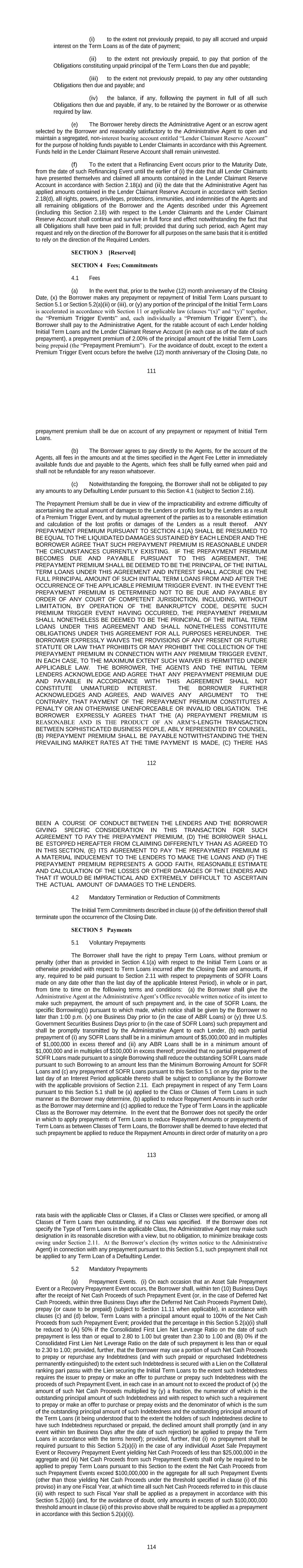 111 (i) to the extent not previously prepaid, to pay all accrued and unpaid interest on the Term Loans as of the date of payment; (ii) to the extent not previously prepaid, to pay that portion of the Obligations constituting unpaid principal of the Term Loans then due and payable; (iii) to the extent not previously prepaid, to pay any other outstanding Obligations then due and payable; and (iv) the balance, if any, following the payment in full of all such Obligations then due and payable, if any, to be retained by the Borrower or as otherwise required by law. (e) The Borrower hereby directs the Administrative Agent or an escrow agent selected by the Borrower and reasonably satisfactory to the Administrative Agent to open and maintain a segregated, non-interest bearing account entitled “Lender Claimant Reserve Account” for the purpose of holding funds payable to Lender Claimants in accordance with this Agreement. Funds held in the Lender Claimant Reserve Account shall remain uninvested. (f) To the extent that a Refinancing Event occurs prior to the Maturity Date, from the date of such Refinancing Event until the earlier of (i) the date that all Lender Claimants have presented themselves and claimed all amounts contained in the Lender Claimant Reserve Account in accordance with Section 2.18(a) and (ii) the date that the Administrative Agent has applied amounts contained in the Lender Claimant Reserve Account in accordance with Section 2.18(d), all rights, powers, privileges, protections, immunities, and indemnities of the Agents and all remaining obligations of the Borrower and the Agents described under this Agreement (including this Section 2.18) with respect to the Lender Claimants and the Lender Claimant Reserve Account shall continue and survive in full force and effect notwithstanding the fact that all Obligations shall have been paid in full; provided that during such period, each Agent may request and rely on the direction of the Borrower for all purposes on the same basis that it is entitled to rely on the direction of the Required Lenders. SECTION 3 [Reserved] SECTION 4 Fees; Commitments 4.1 Fees (a) In the event that, prior to the twelve (12) month anniversary of the Closing Date, (x) the Borrower makes any prepayment or repayment of Initial Term Loans pursuant to Section 5.1 or Section 5.2(a)(ii) or (iii), or (y) any portion of the principal of the Initial Term Loans is accelerated in accordance with Section 11 or applicable law (clauses “(x)” and “(y)” together, the “Premium Trigger Events” and, each individually a “Premium Trigger Event”), the Borrower shall pay to the Administrative Agent, for the ratable account of each Lender holding Initial Term Loans and the Lender Claimant Reserve Account (in each case as of the date of such prepayment), a prepayment premium of 2.00% of the principal amount of the Initial Term Loans being prepaid (the “Prepayment Premium”). For the avoidance of doubt, except to the extent a Premium Trigger Event occurs before the twelve (12) month anniversary of the Closing Date, no 112 prepayment premium shall be due on account of any prepayment or repayment of Initial Term Loans. (b) The Borrower agrees to pay directly to the Agents, for the account of the Agents, all fees in the amounts and at the times specified in the Agent Fee Letter in immediately available funds due and payable to the Agents, which fees shall be fully earned when paid and shall not be refundable for any reason whatsoever. (c) Notwithstanding the foregoing, the Borrower shall not be obligated to pay any amounts to any Defaulting Lender pursuant to this Section 4.1 (subject to Section 2.16). The Prepayment Premium shall be due in view of the impracticability and extreme difficulty of ascertaining the actual amount of damages to the Lenders or profits lost by the Lenders as a result of a Premium Trigger Event, and by mutual agreement of the parties as to a reasonable estimation and calculation of the lost profits or damages of the Lenders as a result thereof. ANY PREPAYMENT PREMIUM PURSUANT TO SECTION 4.1(A) SHALL BE PRESUMED TO BE EQUAL TO THE LIQUIDATED DAMAGES SUSTAINED BY EACH LENDER AND THE BORROWER AGREE THAT SUCH PREPAYMENT PREMIUM IS REASONABLE UNDER THE CIRCUMSTANCES CURRENTLY EXISTING. IF THE PREPAYMENT PREMIUM BECOMES DUE AND PAYABLE PURSUANT TO THIS AGREEMENT, THE PREPAYMENT PREMIUM SHALL BE DEEMED TO BE THE PRINCIPAL OF THE INITIAL TERM LOANS UNDER THIS AGREEMENT AND INTEREST SHALL ACCRUE ON THE FULL PRINCIPAL AMOUNT OF SUCH INITIAL TERM LOANS FROM AND AFTER THE OCCURRENCE OF THE APPLICABLE PREMIUM TRIGGER EVENT. IN THE EVENT THE PREPAYMENT PREMIUM IS DETERMINED NOT TO BE DUE AND PAYABLE BY ORDER OF ANY COURT OF COMPETENT JURISDICTION, INCLUDING, WITHOUT LIMITATION, BY OPERATION OF THE BANKRUPTCY CODE, DESPITE SUCH PREMIUM TRIGGER EVENT HAVING OCCURRED, THE PREPAYMENT PREMIUM SHALL NONETHELESS BE DEEMED TO BE THE PRINCIPAL OF THE INITIAL TERM LOANS UNDER THIS AGREEMENT AND SHALL NONETHELESS CONSTITUTE OBLIGATIONS UNDER THIS AGREEMENT FOR ALL PURPOSES HEREUNDER. THE BORROWER EXPRESSLY WAIVES THE PROVISIONS OF ANY PRESENT OR FUTURE STATUTE OR LAW THAT PROHIBITS OR MAY PROHIBIT THE COLLECTION OF THE PREPAYMENT PREMIUM IN CONNECTION WITH ANY PREMIUM TRIGGER EVENT, IN EACH CASE, TO THE MAXIMUM EXTENT SUCH WAIVER IS PERMITTED UNDER APPLICABLE LAW. THE BORROWER, THE AGENTS AND THE INITIAL TERM LENDERS ACKNOWLEDGE AND AGREE THAT ANY PREPAYMENT PREMIUM DUE AND PAYABLE IN ACCORDANCE WITH THIS AGREEMENT SHALL NOT CONSTITUTE UNMATURED INTEREST. THE BORROWER FURTHER ACKNOWLEDGES AND AGREES, AND WAIVES ANY ARGUMENT TO THE CONTRARY, THAT PAYMENT OF THE PREPAYMENT PREMIUM CONSTITUTES A PENALTY OR AN OTHERWISE UNENFORCEABLE OR INVALID OBLIGATION. THE BORROWER EXPRESSLY AGREES THAT THE (A) PREPAYMENT PREMIUM IS REASONABLE AND IS THE PRODUCT OF AN ARM’S-LENGTH TRANSACTION BETWEEN SOPHISTICATED BUSINESS PEOPLE, ABLY REPRESENTED BY COUNSEL, (B) PREPAYMENT PREMIUM