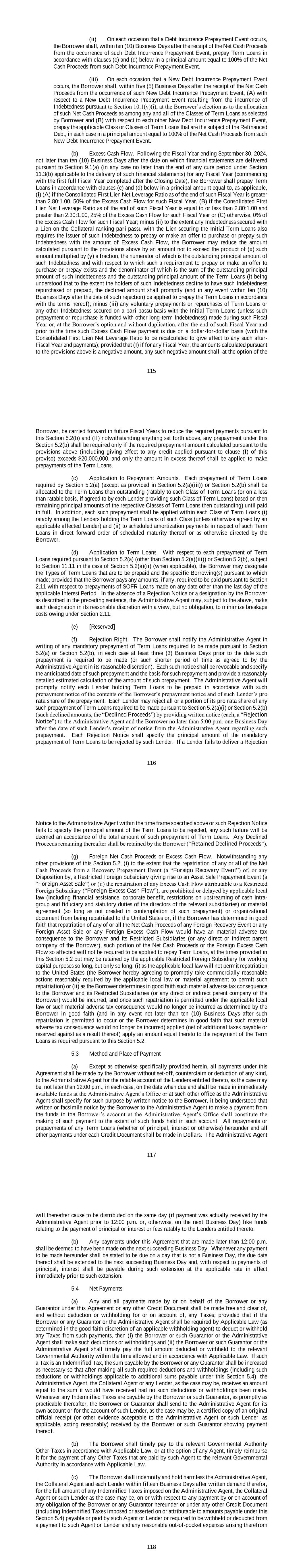 115 (ii) On each occasion that a Debt Incurrence Prepayment Event occurs, the Borrower shall, within ten (10) Business Days after the receipt of the Net Cash Proceeds from the occurrence of such Debt Incurrence Prepayment Event, prepay Term Loans in accordance with clauses (c) and (d) below in a principal amount equal to 100% of the Net Cash Proceeds from such Debt Incurrence Prepayment Event. (iii) On each occasion that a New Debt Incurrence Prepayment Event occurs, the Borrower shall, within five (5) Business Days after the receipt of the Net Cash Proceeds from the occurrence of such New Debt Incurrence Prepayment Event, (A) with respect to a New Debt Incurrence Prepayment Event resulting from the incurrence of Indebtedness pursuant to Section 10.1(v)(i), at the Borrower’s election as to the allocation of such Net Cash Proceeds as among any and all of the Classes of Term Loans as selected by Borrower and (B) with respect to each other New Debt Incurrence Prepayment Event, prepay the applicable Class or Classes of Term Loans that are the subject of the Refinanced Debt, in each case in a principal amount equal to 100% of the Net Cash Proceeds from such New Debt Incurrence Prepayment Event. (b) Excess Cash Flow. Following the Fiscal Year ending September 30, 2024, not later than ten (10) Business Days after the date on which financial statements are delivered pursuant to Section 9.1(a) (in any case no later than the end of any cure period under Section 11.3(b) applicable to the delivery of such financial statements) for any Fiscal Year (commencing with the first full Fiscal Year completed after the Closing Date), the Borrower shall prepay Term Loans in accordance with clauses (c) and (d) below in a principal amount equal to, as applicable, (i) (A) if the Consolidated First Lien Net Leverage Ratio as of the end of such Fiscal Year is greater than 2.80:1.00, 50% of the Excess Cash Flow for such Fiscal Year, (B) if the Consolidated First Lien Net Leverage Ratio as of the end of such Fiscal Year is equal to or less than 2.80:1.00 and greater than 2.30:1.00, 25% of the Excess Cash Flow for such Fiscal Year or (C) otherwise, 0% of the Excess Cash Flow for such Fiscal Year; minus (ii) to the extent any Indebtedness secured with a Lien on the Collateral ranking pari passu with the Lien securing the Initial Term Loans also requires the issuer of such Indebtedness to prepay or make an offer to purchase or prepay such Indebtedness with the amount of Excess Cash Flow, the Borrower may reduce the amount calculated pursuant to the provisions above by an amount not to exceed the product of (x) such amount multiplied by (y) a fraction, the numerator of which is the outstanding principal amount of such Indebtedness and with respect to which such a requirement to prepay or make an offer to purchase or prepay exists and the denominator of which is the sum of the outstanding principal amount of such Indebtedness and the outstanding principal amount of the Term Loans (it being understood that to the extent the holders of such Indebtedness decline to have such Indebtedness repurchased or prepaid, the declined amount shall promptly (and in any event within ten (10) Business Days after the date of such rejection) be applied to prepay the Term Loans in accordance with the terms hereof); minus (iii) any voluntary prepayments or repurchases of Term Loans or any other Indebtedness secured on a pari passu basis with the Initial Term Loans (unless such prepayment or repurchase is funded with other long-term Indebtedness) made during such Fiscal Year or, at the Borrower’s option and without duplication, after the end of such Fiscal Year and prior to the time such Excess Cash Flow payment is due on a dollar-for-dollar basis (with the Consolidated First Lien Net Leverage Ratio to be recalculated to give effect to any such after- Fiscal Year end payments); provided that (I) if for any Fiscal Year, the amounts calculated pursuant to the provisions above is a negative amount, any such negative amount shall, at the option of the 116 Borrower, be carried forward in future Fiscal Years to reduce the required payments pursuant to this Section 5.2(b) and (II) notwithstanding anything set forth above, any prepayment under this Section 5.2(b) shall be required only if the required prepayment amount calculated pursuant to the provisions above (including giving effect to any credit applied pursuant to clause (I) of this proviso) exceeds $20,000,000, and only the amount in excess thereof shall be applied to make prepayments of the Term Loans. (c) Application to Repayment Amounts. Each prepayment of Term Loans required by Section 5.2(a) (except as provided in Section 5.2(a)(iii)) or Section 5.2(b) shall be allocated to the Term Loans then outstanding (ratably to each Class of Term Loans (or on a less than ratable basis, if agreed to by each Lender providing such Class of Term Loans) based on then remaining principal amounts of the respective Classes of Term Loans then outstanding) until paid in full. In addition, each such prepayment shall be applied within each Class of Term Loans (i) ratably among the Lenders holding the Term Loans of such Class (unless otherwise agreed by an applicable affected Lender) and (ii) to scheduled amortization payments in respect of such Term Loans in direct forward order of scheduled maturity thereof or as otherwise directed by the Borrower. (d) Application to Term Loans. With respect to each prepayment of Term Loans required pursuant to Section 5.2(a) (other than Section 5.2(a)(iii)) or Section 5.2(b), subject to Section 11.11 in the case of Section 5.2(a)(ii) (when applicable), the Borrower may designate the Types of Term Loans that are to be prepaid and the specific Borrowing(s) pursuant to which made; provided that the Borrower pays any amounts, if any, required to be paid pursuant to Section 2.11 with respect to prepayments of SOFR Loans made on any date other than the last day of the applicable