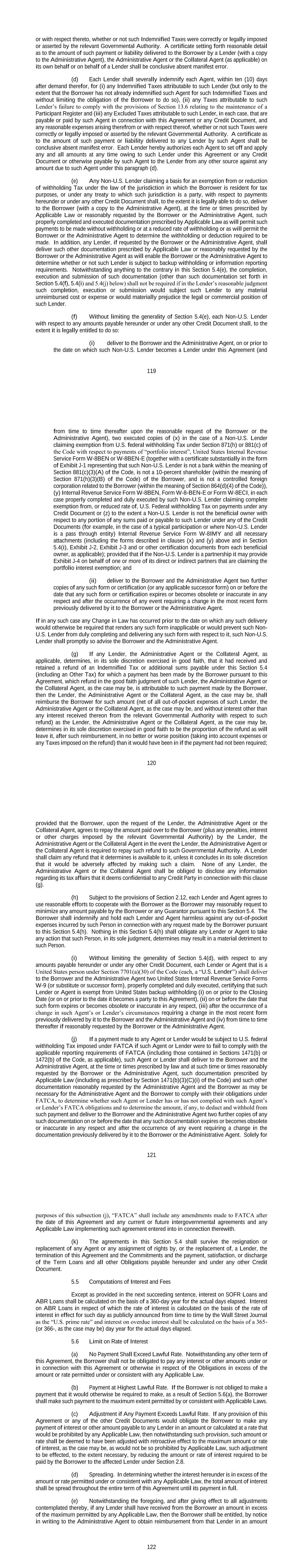 119 or with respect thereto, whether or not such Indemnified Taxes were correctly or legally imposed or asserted by the relevant Governmental Authority. A certificate setting forth reasonable detail as to the amount of such payment or liability delivered to the Borrower by a Lender (with a copy to the Administrative Agent), the Administrative Agent or the Collateral Agent (as applicable) on its own behalf or on behalf of a Lender shall be conclusive absent manifest error. (d) Each Lender shall severally indemnify each Agent, within ten (10) days after demand therefor, for (i) any Indemnified Taxes attributable to such Lender (but only to the extent that the Borrower has not already indemnified such Agent for such Indemnified Taxes and without limiting the obligation of the Borrower to do so), (ii) any Taxes attributable to such Lender’s failure to comply with the provisions of Section 13.6 relating to the maintenance of a Participant Register and (iii) any Excluded Taxes attributable to such Lender, in each case, that are payable or paid by such Agent in connection with this Agreement or any Credit Document, and any reasonable expenses arising therefrom or with respect thereof, whether or not such Taxes were correctly or legally imposed or asserted by the relevant Governmental Authority. A certificate as to the amount of such payment or liability delivered to any Lender by such Agent shall be conclusive absent manifest error. Each Lender hereby authorizes each Agent to set off and apply any and all amounts at any time owing to such Lender under this Agreement or any Credit Document or otherwise payable by such Agent to the Lender from any other source against any amount due to such Agent under this paragraph (d). (e) Any Non-U.S. Lender claiming a basis for an exemption from or reduction of withholding Tax under the law of the jurisdiction in which the Borrower is resident for tax purposes, or under any treaty to which such jurisdiction is a party, with respect to payments hereunder or under any other Credit Document shall, to the extent it is legally able to do so, deliver to the Borrower (with a copy to the Administrative Agent), at the time or times prescribed by Applicable Law or reasonably requested by the Borrower or the Administrative Agent, such properly completed and executed documentation prescribed by Applicable Law as will permit such payments to be made without withholding or at a reduced rate of withholding or as will permit the Borrower or the Administrative Agent to determine the withholding or deduction required to be made. In addition, any Lender, if requested by the Borrower or the Administrative Agent, shall deliver such other documentation prescribed by Applicable Law or reasonably requested by the Borrower or the Administrative Agent as will enable the Borrower or the Administrative Agent to determine whether or not such Lender is subject to backup withholding or information reporting requirements. Notwithstanding anything to the contrary in this Section 5.4(e), the completion, execution and submission of such documentation (other than such documentation set forth in Section 5.4(f), 5.4(i) and 5.4(j) below) shall not be required if in the Lender’s reasonable judgment such completion, execution or submission would subject such Lender to any material unreimbursed cost or expense or would materially prejudice the legal or commercial position of such Lender. (f) Without limiting the generality of Section 5.4(e), each Non-U.S. Lender with respect to any amounts payable hereunder or under any other Credit Document shall, to the extent it is legally entitled to do so: (i) deliver to the Borrower and the Administrative Agent, on or prior to the date on which such Non-U.S. Lender becomes a Lender under this Agreement (and 120 from time to time thereafter upon the reasonable request of the Borrower or the Administrative Agent), two executed copies of (x) in the case of a Non-U.S. Lender claiming exemption from U.S. federal withholding Tax under Section 871(h) or 881(c) of the Code with respect to payments of “portfolio interest”, United States Internal Revenue Service Form W-8BEN or W-8BEN-E (together with a certificate substantially in the form of Exhibit J-1 representing that such Non-U.S. Lender is not a bank within the meaning of Section 881(c)(3)(A) of the Code, is not a 10-percent shareholder (within the meaning of Section 871(h)(3)(B) of the Code) of the Borrower, and is not a controlled foreign corporation related to the Borrower (within the meaning of Section 864(d)(4) of the Code)), (y) Internal Revenue Service Form W-8BEN, Form W-8-BEN-E or Form W-8ECI, in each case properly completed and duly executed by such Non-U.S. Lender claiming complete exemption from, or reduced rate of, U.S. Federal withholding Tax on payments under any Credit Document or (z) to the extent a Non-U.S. Lender is not the beneficial owner with respect to any portion of any sums paid or payable to such Lender under any of the Credit Documents (for example, in the case of a typical participation or where Non-U.S. Lender is a pass through entity) Internal Revenue Service Form W-8IMY and all necessary attachments (including the forms described in clauses (x) and (y) above and in Section 5.4(i), Exhibit J-2, Exhibit J-3 and or other certification documents from each beneficial owner, as applicable); provided that if the Non-U.S. Lender is a partnership it may provide Exhibit J-4 on behalf of one or more of its direct or indirect partners that are claiming the portfolio interest exemption; and (ii) deliver to the Borrower and the Administrative Agent two further copies of any such form or certification (or any applicable successor form) on or before the date that any such form or certification expires or becomes obsolete or inaccurate in any respect and after the occurrence of any event requiring a change in the most recent form previously delivered by it to the Borrower or the Administrativ