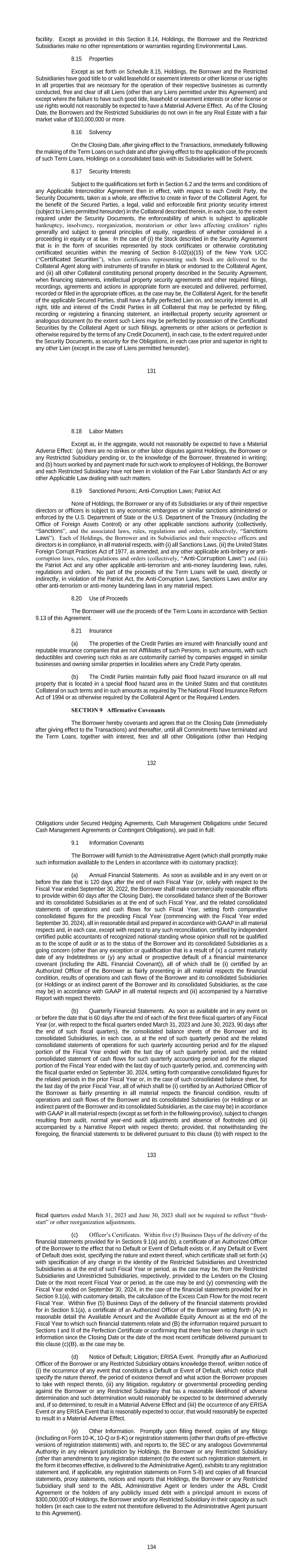 131 facility. Except as provided in this Section 8.14, Holdings, the Borrower and the Restricted Subsidiaries make no other representations or warranties regarding Environmental Laws. 8.15 Properties Except as set forth on Schedule 8.15, Holdings, the Borrower and the Restricted Subsidiaries have good title to or valid leasehold or easement interests or other license or use rights in all properties that are necessary for the operation of their respective businesses as currently conducted, free and clear of all Liens (other than any Liens permitted under this Agreement) and except where the failure to have such good title, leasehold or easement interests or other license or use rights would not reasonably be expected to have a Material Adverse Effect. As of the Closing Date, the Borrowers and the Restricted Subsidiaries do not own in fee any Real Estate with a fair market value of $10,000,000 or more. 8.16 Solvency On the Closing Date, after giving effect to the Transactions, immediately following the making of the Term Loans on such date and after giving effect to the application of the proceeds of such Term Loans, Holdings on a consolidated basis with its Subsidiaries will be Solvent. 8.17 Security Interests Subject to the qualifications set forth in Section 6.2 and the terms and conditions of any Applicable Intercreditor Agreement then in effect, with respect to each Credit Party, the Security Documents, taken as a whole, are effective to create in favor of the Collateral Agent, for the benefit of the Secured Parties, a legal, valid and enforceable first priority security interest (subject to Liens permitted hereunder) in the Collateral described therein, in each case, to the extent required under the Security Documents, the enforceability of which is subject to applicable bankruptcy, insolvency, reorganization, moratorium or other laws affecting creditors’ rights generally and subject to general principles of equity, regardless of whether considered in a proceeding in equity or at law. In the case of (i) the Stock described in the Security Agreement that is in the form of securities represented by stock certificates or otherwise constituting certificated securities within the meaning of Section 8-102(a)(15) of the New York UCC (“Certificated Securities”), when certificates representing such Stock are delivered to the Collateral Agent along with instruments of transfer in blank or endorsed to the Collateral Agent, and (ii) all other Collateral constituting personal property described in the Security Agreement, when financing statements, intellectual property security agreements and other required filings, recordings, agreements and actions in appropriate form are executed and delivered, performed, recorded or filed in the appropriate offices, as the case may be, the Collateral Agent, for the benefit of the applicable Secured Parties, shall have a fully perfected Lien on, and security interest in, all right, title and interest of the Credit Parties in all Collateral that may be perfected by filing, recording or registering a financing statement, an intellectual property security agreement or analogous document (to the extent such Liens may be perfected by possession of the Certificated Securities by the Collateral Agent or such filings, agreements or other actions or perfection is otherwise required by the terms of any Credit Document), in each case, to the extent required under the Security Documents, as security for the Obligations, in each case prior and superior in right to any other Lien (except in the case of Liens permitted hereunder). 132 8.18 Labor Matters Except as, in the aggregate, would not reasonably be expected to have a Material Adverse Effect: (a) there are no strikes or other labor disputes against Holdings, the Borrower or any Restricted Subsidiary pending or, to the knowledge of the Borrower, threatened in writing; and (b) hours worked by and payment made for such work to employees of Holdings, the Borrower and each Restricted Subsidiary have not been in violation of the Fair Labor Standards Act or any other Applicable Law dealing with such matters. 8.19 Sanctioned Persons; Anti-Corruption Laws; Patriot Act None of Holdings, the Borrower or any of its Subsidiaries or any of their respective directors or officers is subject to any economic embargoes or similar sanctions administered or enforced by the U.S. Department of State or the U.S. Department of the Treasury (including the Office of Foreign Assets Control) or any other applicable sanctions authority (collectively, “Sanctions”, and the associated laws, rules, regulations and orders, collectively, “Sanctions Laws”). Each of Holdings, the Borrower and its Subsidiaries and their respective officers and directors is in compliance, in all material respects, with (i) all Sanctions Laws, (ii) the United States Foreign Corrupt Practices Act of 1977, as amended, and any other applicable anti-bribery or anti- corruption laws, rules, regulations and orders (collectively, “Anti-Corruption Laws”) and (iii) the Patriot Act and any other applicable anti-terrorism and anti-money laundering laws, rules, regulations and orders. No part of the proceeds of the Term Loans will be used, directly or indirectly, in violation of the Patriot Act, the Anti-Corruption Laws, Sanctions Laws and/or any other anti-terrorism or anti-money laundering laws in any material respect. 8.20 Use of Proceeds The Borrower will use the proceeds of the Term Loans in accordance with Section 9.13 of this Agreement. 8.21 Insurance (a) The properties of the Credit Parties are insured with financially sound and reputable insurance companies that are not Affiliates of such Persons, in such amounts, with such deductibles and covering such risks as are customarily carried by companies engaged in similar businesses and owning similar properties in localities where any Credit Party operates. (b) The Credit Parties maintain fully paid flood hazard in