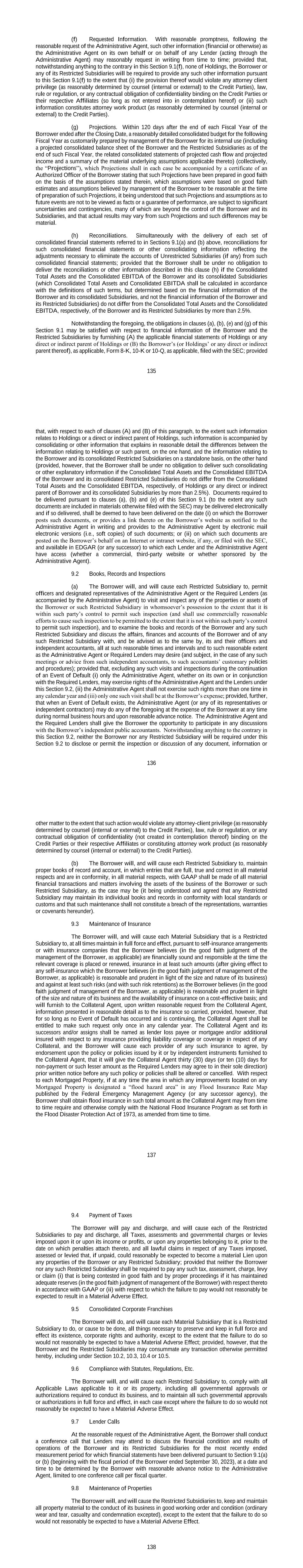 135 (f) Requested Information. With reasonable promptness, following the reasonable request of the Administrative Agent, such other information (financial or otherwise) as the Administrative Agent on its own behalf or on behalf of any Lender (acting through the Administrative Agent) may reasonably request in writing from time to time; provided that, notwithstanding anything to the contrary in this Section 9.1(f), none of Holdings, the Borrower or any of its Restricted Subsidiaries will be required to provide any such other information pursuant to this Section 9.1(f) to the extent that (i) the provision thereof would violate any attorney client privilege (as reasonably determined by counsel (internal or external) to the Credit Parties), law, rule or regulation, or any contractual obligation of confidentiality binding on the Credit Parties or their respective Affiliates (so long as not entered into in contemplation hereof) or (ii) such information constitutes attorney work product (as reasonably determined by counsel (internal or external) to the Credit Parties). (g) Projections. Within 120 days after the end of each Fiscal Year of the Borrower ended after the Closing Date, a reasonably detailed consolidated budget for the following Fiscal Year as customarily prepared by management of the Borrower for its internal use (including a projected consolidated balance sheet of the Borrower and the Restricted Subsidiaries as of the end of such Fiscal Year, the related consolidated statements of projected cash flow and projected income and a summary of the material underlying assumptions applicable thereto) (collectively, the “Projections”), which Projections shall in each case be accompanied by a certificate of an Authorized Officer of the Borrower stating that such Projections have been prepared in good faith on the basis of the assumptions stated therein, which assumptions were based on good faith estimates and assumptions believed by management of the Borrower to be reasonable at the time of preparation of such Projections, it being understood that such Projections and assumptions as to future events are not to be viewed as facts or a guarantee of performance, are subject to significant uncertainties and contingencies, many of which are beyond the control of the Borrower and its Subsidiaries, and that actual results may vary from such Projections and such differences may be material. (h) Reconciliations. Simultaneously with the delivery of each set of consolidated financial statements referred to in Sections 9.1(a) and (b) above, reconciliations for such consolidated financial statements or other consolidating information reflecting the adjustments necessary to eliminate the accounts of Unrestricted Subsidiaries (if any) from such consolidated financial statements; provided that the Borrower shall be under no obligation to deliver the reconciliations or other information described in this clause (h) if the Consolidated Total Assets and the Consolidated EBITDA of the Borrower and its consolidated Subsidiaries (which Consolidated Total Assets and Consolidated EBITDA shall be calculated in accordance with the definitions of such terms, but determined based on the financial information of the Borrower and its consolidated Subsidiaries, and not the financial information of the Borrower and its Restricted Subsidiaries) do not differ from the Consolidated Total Assets and the Consolidated EBITDA, respectively, of the Borrower and its Restricted Subsidiaries by more than 2.5%. Notwithstanding the foregoing, the obligations in clauses (a), (b), (e) and (g) of this Section 9.1 may be satisfied with respect to financial information of the Borrower and the Restricted Subsidiaries by furnishing (A) the applicable financial statements of Holdings or any direct or indirect parent of Holdings or (B) the Borrower’s (or Holdings’ or any direct or indirect parent thereof), as applicable, Form 8-K, 10-K or 10-Q, as applicable, filed with the SEC; provided 136 that, with respect to each of clauses (A) and (B) of this paragraph, to the extent such information relates to Holdings or a direct or indirect parent of Holdings, such information is accompanied by consolidating or other information that explains in reasonable detail the differences between the information relating to Holdings or such parent, on the one hand, and the information relating to the Borrower and its consolidated Restricted Subsidiaries on a standalone basis, on the other hand (provided, however, that the Borrower shall be under no obligation to deliver such consolidating or other explanatory information if the Consolidated Total Assets and the Consolidated EBITDA of the Borrower and its consolidated Restricted Subsidiaries do not differ from the Consolidated Total Assets and the Consolidated EBITDA, respectively, of Holdings or any direct or indirect parent of Borrower and its consolidated Subsidiaries by more than 2.5%). Documents required to be delivered pursuant to clauses (a), (b) and (e) of this Section 9.1 (to the extent any such documents are included in materials otherwise filed with the SEC) may be delivered electronically and if so delivered, shall be deemed to have been delivered on the date (i) on which the Borrower posts such documents, or provides a link thereto on the Borrower’s website as notified to the Administrative Agent in writing and provides to the Administrative Agent by electronic mail electronic versions (i.e., soft copies) of such documents; or (ii) on which such documents are posted on the Borrower’s behalf on an Internet or intranet website, if any, or filed with the SEC, and available in EDGAR (or any successor) to which each Lender and the Administrative Agent have access (whether a commercial, third-party website or whether sponsored by the Administrative Agent). 9.2 Books, Records and Inspections (a) The Borrower will, and will cause each Restricted Subsidiary to, permit officers and designated represe