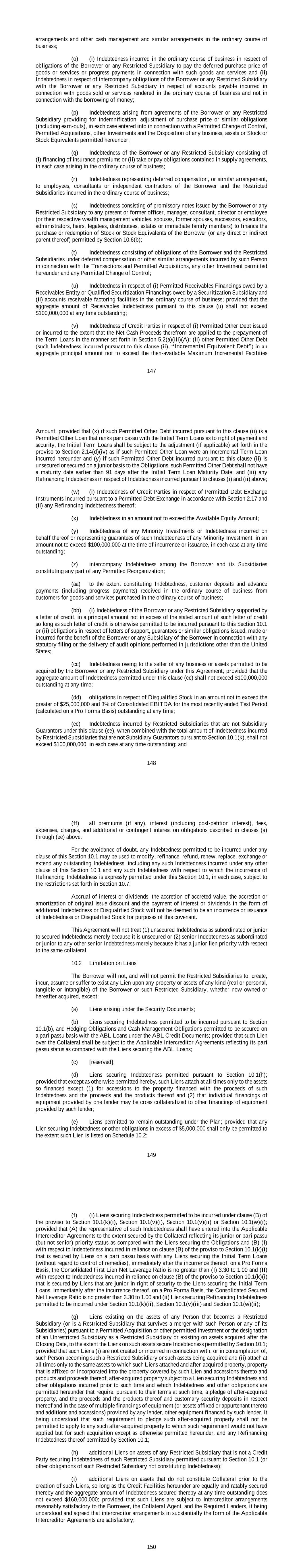 143 States government offices with respect to intellectual property as expressly required herein and under the other Credit Documents, (C) delivery to the Collateral Agent, for its possession, of all Collateral consisting of material intercompany notes, stock certificates of the Borrower and its Restricted Subsidiaries or (D) Mortgages required to be delivered pursuant to this Section 9.12, (ii) to enter into any control agreement with respect to any deposit account, securities account or commodities account or contract (other than for which control agreements are required to be obtained or for which the ABL Collateral Agent has obtained control, in each case, to the extent required by the ABL Credit Documents; provided that in such case, the ABL Collateral Agent will act as the agent for perfection on behalf of the Secured Parties without causing the Collateral Agent or the Administrative Agent to become a party to such control agreements), (iii) to take any action in any non-U.S. jurisdiction or pursuant to the requirements of the laws of any non-U.S. jurisdiction in order to create any security interests or to perfect any security interests, including with respect to any intellectual property registered outside of the United States (it being understood that there shall be no security agreements or pledge agreements governed by the laws of any non- U.S. jurisdiction), (iv) except as expressly set forth above, to take any other action with respect to any Collateral to perfect through control agreements or to otherwise perfect by “control”, (v) to provide any notice to obtain the consent of governmental authorities under the Federal Assignment of Claims Act (or any state equivalent thereof) or (vi) register, apply to register, or escrow any intellectual property or software. 9.13 Use of Proceeds The Borrower will use the proceeds of the Initial Term Loans to consummate the Plan, for working capital, general corporate purposes, and certain fees and expenses associated with the closing of the Transactions. The Borrower will use the proceeds of other Term Loans or Commitments for purposes as agreed with the Lenders thereof. 9.14 Maintenance of Ratings The Borrower will use commercially reasonable efforts to obtain and maintain (but not maintain any specific rating) a public corporate family and/or corporate credit rating, as applicable, and public ratings in respect of the Initial Term Loans provided pursuant to this Agreement, in each case, from each of S&P and Moody’s within 90 days after the Closing Date or as soon as reasonably practicable thereafter. 9.15 Changes in Business The Borrower and the Restricted Subsidiaries, taken as a whole, will not fundamentally and substantively alter the character of their business, taken as a whole, from the business conducted by the Borrower and the Restricted Subsidiaries, taken as a whole, on the Closing Date and other business activities which are extensions thereof or otherwise similar, incidental, complementary, synergistic, reasonably related or ancillary to any of the foregoing (and non-core incidental businesses acquired in connection with any Permitted Acquisition or permitted Investment), in each case as determined by the Borrower in good faith. 144 9.16 Post-Closing Obligations (a) The Borrower hereby agrees to deliver, or cause to be delivered, to the Administrative Agent, in form and substance reasonably satisfactory to the Administrative Agent and the Required Lenders, the items described on Schedule 9.16 hereof, if any, on or before the dates specified with respect to such items, or such later dates as may be agreed to by, or as may be waived by, the Required Lenders in their sole discretion. (b) All representations and warranties contained in this Agreement and the other Credit Documents shall be deemed modified to the extent necessary to effect the foregoing (and to permit the taking of the actions described above within the time periods required above and in Schedule 9.16, rather than as elsewhere provided in the Credit Documents); provided that to the extent any representation and warranty would not be true because the foregoing actions were not taken on the Closing Date or, following the Closing Date, prior to the date by which such action is required to be taken by Section 9.16(a), the respective representation and warranty shall be required to be true and correct in all material respects (except that any representation and warranty that is qualified as to “materiality” or “Material Adverse Effect” shall be true and correct in all respects) at the time the respective action is taken (or was required to be taken) in accordance with the foregoing provisions of this Section 9.16 (and Schedule 9.16). SECTION 10 Negative Covenants The Borrower hereby covenants and agrees that on the Closing Date (immediately after giving effect to the Transactions) and thereafter, until all Commitments and all Term Loans, together with interest, fees and all other Obligations (other than Hedging Obligations under Secured Hedging Agreements, Cash Management Obligations under Secured Cash Management Agreement or Contingent Obligations), are paid in full: 10.1 Limitation on Indebtedness The Borrower will not, and will not permit the Restricted Subsidiaries to, create, incur, assume or suffer to exist any Indebtedness. Notwithstanding the foregoing, the limitations set forth in the immediately preceding sentence shall not apply to any of the following: (a) Indebtedness arising under the Credit Documents (including any Indebtedness incurred as permitted by Sections 2.14, 2.15 and 13.1); (b) Indebtedness under the ABL Credit Documents and any Refinancing Indebtedness thereof, in an aggregate principal amount not to exceed the sum of (i) $300,000,000 plus (ii) solely in the case of any such Refinancing Indebtedness, the Refinancing Increased Amount with respect thereto; (c) [reserved]; (d) subject to compliance with Section 10.5, Indebtedness o