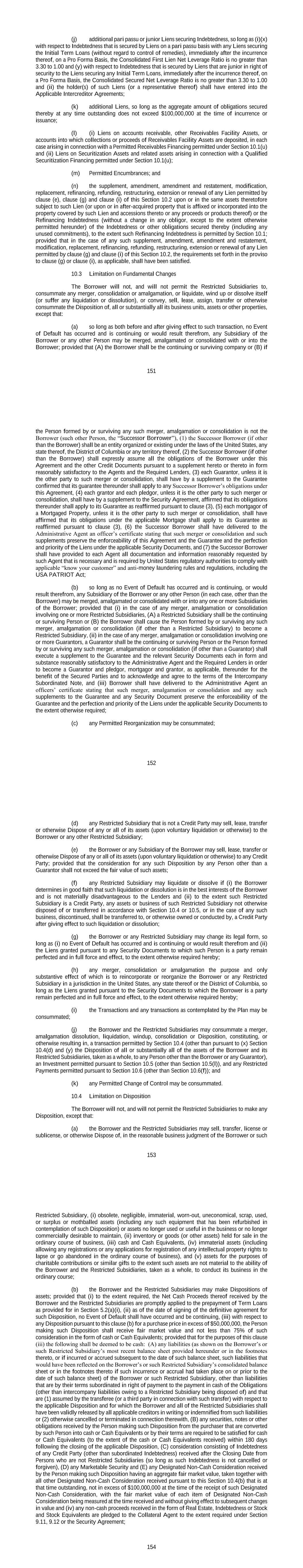 151 (j) additional pari passu or junior Liens securing Indebtedness, so long as (i)(x) with respect to Indebtedness that is secured by Liens on a pari passu basis with any Liens securing the Initial Term Loans (without regard to control of remedies), immediately after the incurrence thereof, on a Pro Forma Basis, the Consolidated First Lien Net Leverage Ratio is no greater than 3.30 to 1.00 and (y) with respect to Indebtedness that is secured by Liens that are junior in right of security to the Liens securing any Initial Term Loans, immediately after the incurrence thereof, on a Pro Forma Basis, the Consolidated Secured Net Leverage Ratio is no greater than 3.30 to 1.00 and (ii) the holder(s) of such Liens (or a representative thereof) shall have entered into the Applicable Intercreditor Agreements; (k) additional Liens, so long as the aggregate amount of obligations secured thereby at any time outstanding does not exceed $100,000,000 at the time of incurrence or issuance; (l) (i) Liens on accounts receivable, other Receivables Facility Assets, or accounts into which collections or proceeds of Receivables Facility Assets are deposited, in each case arising in connection with a Permitted Receivables Financing permitted under Section 10.1(u) and (ii) Liens on Securitization Assets and related assets arising in connection with a Qualified Securitization Financing permitted under Section 10.1(u); (m) Permitted Encumbrances; and (n) the supplement, amendment, amendment and restatement, modification, replacement, refinancing, refunding, restructuring, extension or renewal of any Lien permitted by clause (e), clause (g) and clause (i) of this Section 10.2 upon or in the same assets theretofore subject to such Lien (or upon or in after-acquired property that is affixed or incorporated into the property covered by such Lien and accessions thereto or any proceeds or products thereof) or the Refinancing Indebtedness (without a change in any obligor, except to the extent otherwise permitted hereunder) of the Indebtedness or other obligations secured thereby (including any unused commitments), to the extent such Refinancing Indebtedness is permitted by Section 10.1; provided that in the case of any such supplement, amendment, amendment and restatement, modification, replacement, refinancing, refunding, restructuring, extension or renewal of any Lien permitted by clause (g) and clause (i) of this Section 10.2, the requirements set forth in the proviso to clause (g) or clause (i), as applicable, shall have been satisfied. 10.3 Limitation on Fundamental Changes The Borrower will not, and will not permit the Restricted Subsidiaries to, consummate any merger, consolidation or amalgamation, or liquidate, wind up or dissolve itself (or suffer any liquidation or dissolution), or convey, sell, lease, assign, transfer or otherwise consummate the Disposition of, all or substantially all its business units, assets or other properties, except that: (a) so long as both before and after giving effect to such transaction, no Event of Default has occurred and is continuing or would result therefrom, any Subsidiary of the Borrower or any other Person may be merged, amalgamated or consolidated with or into the Borrower; provided that (A) the Borrower shall be the continuing or surviving company or (B) if 152 the Person formed by or surviving any such merger, amalgamation or consolidation is not the Borrower (such other Person, the “Successor Borrower”), (1) the Successor Borrower (if other than the Borrower) shall be an entity organized or existing under the laws of the United States, any state thereof, the District of Columbia or any territory thereof, (2) the Successor Borrower (if other than the Borrower) shall expressly assume all the obligations of the Borrower under this Agreement and the other Credit Documents pursuant to a supplement hereto or thereto in form reasonably satisfactory to the Agents and the Required Lenders, (3) each Guarantor, unless it is the other party to such merger or consolidation, shall have by a supplement to the Guarantee confirmed that its guarantee thereunder shall apply to any Successor Borrower’s obligations under this Agreement, (4) each grantor and each pledgor, unless it is the other party to such merger or consolidation, shall have by a supplement to the Security Agreement, affirmed that its obligations thereunder shall apply to its Guarantee as reaffirmed pursuant to clause (3), (5) each mortgagor of a Mortgaged Property, unless it is the other party to such merger or consolidation, shall have affirmed that its obligations under the applicable Mortgage shall apply to its Guarantee as reaffirmed pursuant to clause (3), (6) the Successor Borrower shall have delivered to the Administrative Agent an officer’s certificate stating that such merger or consolidation and such supplements preserve the enforceability of this Agreement and the Guarantee and the perfection and priority of the Liens under the applicable Security Documents, and (7) the Successor Borrower shall have provided to each Agent all documentation and information reasonably requested by such Agent that is necessary and is required by United States regulatory authorities to comply with applicable “know your customer” and anti-money laundering rules and regulations, including the USA PATRIOT Act; (b) so long as no Event of Default has occurred and is continuing, or would result therefrom, any Subsidiary of the Borrower or any other Person (in each case, other than the Borrower) may be merged, amalgamated or consolidated with or into any one or more Subsidiaries of the Borrower; provided that (i) in the case of any merger, amalgamation or consolidation involving one or more Restricted Subsidiaries, (A) a Restricted Subsidiary shall be the continuing or surviving Person or (B) the Borrower shall cause the Person formed by or surviving any such merger, amalgamation or consolidation (if other than a Restricted Su