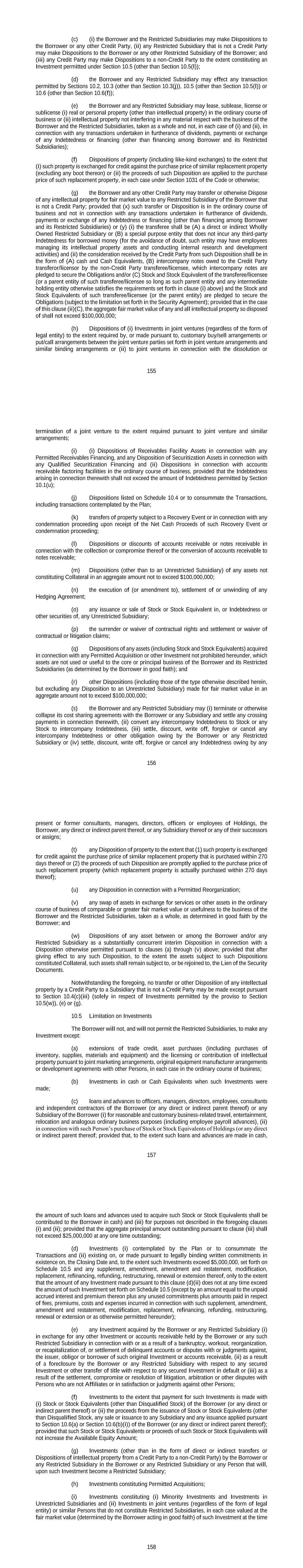 155 (c) (i) the Borrower and the Restricted Subsidiaries may make Dispositions to the Borrower or any other Credit Party, (ii) any Restricted Subsidiary that is not a Credit Party may make Dispositions to the Borrower or any other Restricted Subsidiary of the Borrower; and (iii) any Credit Party may make Dispositions to a non-Credit Party to the extent constituting an Investment permitted under Section 10.5 (other than Section 10.5(l)); (d) the Borrower and any Restricted Subsidiary may effect any transaction permitted by Sections 10.2, 10.3 (other than Section 10.3(j)), 10.5 (other than Section 10.5(l)) or 10.6 (other than Section 10.6(f)); (e) the Borrower and any Restricted Subsidiary may lease, sublease, license or sublicense (i) real or personal property (other than intellectual property) in the ordinary course of business or (ii) intellectual property not interfering in any material respect with the business of the Borrower and the Restricted Subsidiaries, taken as a whole and not, in each case of (i) and (ii), in connection with any transactions undertaken in furtherance of dividends, payments or exchange of any Indebtedness or financing (other than financing among Borrower and its Restricted Subsidiaries); (f) Dispositions of property (including like-kind exchanges) to the extent that (i) such property is exchanged for credit against the purchase price of similar replacement property (excluding any boot thereon) or (ii) the proceeds of such Disposition are applied to the purchase price of such replacement property, in each case under Section 1031 of the Code or otherwise; (g) the Borrower and any other Credit Party may transfer or otherwise Dispose of any intellectual property for fair market value to any Restricted Subsidiary of the Borrower that is not a Credit Party; provided that (x) such transfer or Disposition is in the ordinary course of business and not in connection with any transactions undertaken in furtherance of dividends, payments or exchange of any Indebtedness or financing (other than financing among Borrower and its Restricted Subsidiaries) or (y) (i) the transferee shall be (A) a direct or indirect Wholly Owned Restricted Subsidiary or (B) a special purpose entity that does not incur any third-party Indebtedness for borrowed money (for the avoidance of doubt, such entity may have employees managing its intellectual property assets and conducting internal research and development activities) and (ii) the consideration received by the Credit Party from such Disposition shall be in the form of (A) cash and Cash Equivalents, (B) intercompany notes owed to the Credit Party transferor/licensor by the non-Credit Party transferee/licensee, which intercompany notes are pledged to secure the Obligations and/or (C) Stock and Stock Equivalent of the transferee/licensee (or a parent entity of such transferee/licensee so long as such parent entity and any intermediate holding entity otherwise satisfies the requirements set forth in clause (i) above) and the Stock and Stock Equivalents of such transferee/licensee (or the parent entity) are pledged to secure the Obligations (subject to the limitation set forth in the Security Agreement); provided that in the case of this clause (ii)(C), the aggregate fair market value of any and all intellectual property so disposed of shall not exceed $100,000,000; (h) Dispositions of (i) Investments in joint ventures (regardless of the form of legal entity) to the extent required by, or made pursuant to, customary buy/sell arrangements or put/call arrangements between the joint venture parties set forth in joint venture arrangements and similar binding arrangements or (ii) to joint ventures in connection with the dissolution or 156 termination of a joint venture to the extent required pursuant to joint venture and similar arrangements; (i) (i) Dispositions of Receivables Facility Assets in connection with any Permitted Receivables Financing, and any Disposition of Securitization Assets in connection with any Qualified Securitization Financing and (ii) Dispositions in connection with accounts receivable factoring facilities in the ordinary course of business, provided that the Indebtedness arising in connection therewith shall not exceed the amount of Indebtedness permitted by Section 10.1(u); (j) Dispositions listed on Schedule 10.4 or to consummate the Transactions, including transactions contemplated by the Plan; (k) transfers of property subject to a Recovery Event or in connection with any condemnation proceeding upon receipt of the Net Cash Proceeds of such Recovery Event or condemnation proceeding; (l) Dispositions or discounts of accounts receivable or notes receivable in connection with the collection or compromise thereof or the conversion of accounts receivable to notes receivable; (m) Dispositions (other than to an Unrestricted Subsidiary) of any assets not constituting Collateral in an aggregate amount not to exceed $100,000,000; (n) the execution of (or amendment to), settlement of or unwinding of any Hedging Agreement; (o) any issuance or sale of Stock or Stock Equivalent in, or Indebtedness or other securities of, any Unrestricted Subsidiary; (p) the surrender or waiver of contractual rights and settlement or waiver of contractual or litigation claims; (q) Dispositions of any assets (including Stock and Stock Equivalents) acquired in connection with any Permitted Acquisition or other Investment not prohibited hereunder, which assets are not used or useful to the core or principal business of the Borrower and its Restricted Subsidiaries (as determined by the Borrower in good faith); and (r) other Dispositions (including those of the type otherwise described herein, but excluding any Disposition to an Unrestricted Subsidiary) made for fair market value in an aggregate amount not to exceed $100,000,000; (s) the Borrower and any Restricted Subsidiary may (i) terminate or otherwise collapse its cost sharing agreements with the Borro