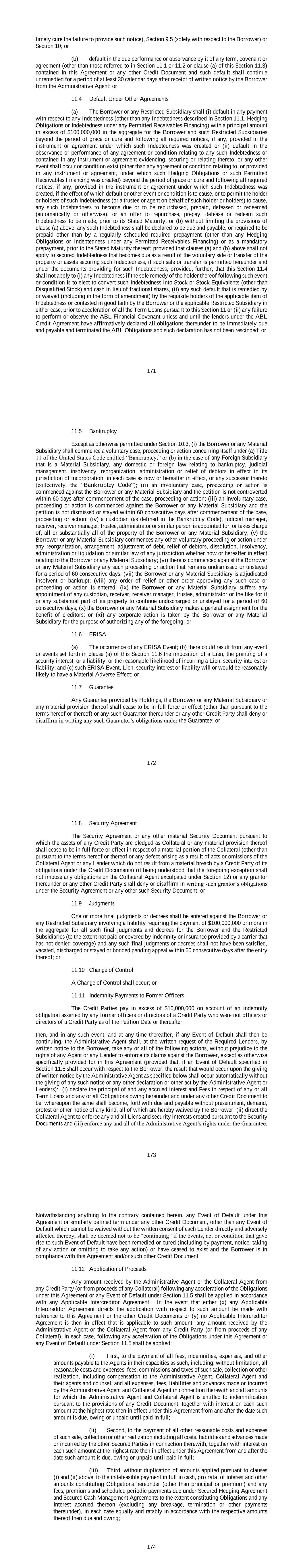 171 timely cure the failure to provide such notice), Section 9.5 (solely with respect to the Borrower) or Section 10; or (b) default in the due performance or observance by it of any term, covenant or agreement (other than those referred to in Section 11.1 or 11.2 or clause (a) of this Section 11.3) contained in this Agreement or any other Credit Document and such default shall continue unremedied for a period of at least 30 calendar days after receipt of written notice by the Borrower from the Administrative Agent; or 11.4 Default Under Other Agreements (a) The Borrower or any Restricted Subsidiary shall (i) default in any payment with respect to any Indebtedness (other than any Indebtedness described in Section 11.1, Hedging Obligations or Indebtedness under any Permitted Receivables Financing) with a principal amount in excess of $100,000,000 in the aggregate for the Borrower and such Restricted Subsidiaries beyond the period of grace or cure and following all required notices, if any, provided in the instrument or agreement under which such Indebtedness was created or (ii) default in the observance or performance of any agreement or condition relating to any such Indebtedness or contained in any instrument or agreement evidencing, securing or relating thereto, or any other event shall occur or condition exist (other than any agreement or condition relating to, or provided in any instrument or agreement, under which such Hedging Obligations or such Permitted Receivables Financing was created) beyond the period of grace or cure and following all required notices, if any, provided in the instrument or agreement under which such Indebtedness was created, if the effect of which default or other event or condition is to cause, or to permit the holder or holders of such Indebtedness (or a trustee or agent on behalf of such holder or holders) to cause, any such Indebtedness to become due or to be repurchased, prepaid, defeased or redeemed (automatically or otherwise), or an offer to repurchase, prepay, defease or redeem such Indebtedness to be made, prior to its Stated Maturity; or (b) without limiting the provisions of clause (a) above, any such Indebtedness shall be declared to be due and payable, or required to be prepaid other than by a regularly scheduled required prepayment (other than any Hedging Obligations or Indebtedness under any Permitted Receivables Financing) or as a mandatory prepayment, prior to the Stated Maturity thereof; provided that clauses (a) and (b) above shall not apply to secured Indebtedness that becomes due as a result of the voluntary sale or transfer of the property or assets securing such Indebtedness, if such sale or transfer is permitted hereunder and under the documents providing for such Indebtedness; provided, further, that this Section 11.4 shall not apply to (i) any Indebtedness if the sole remedy of the holder thereof following such event or condition is to elect to convert such Indebtedness into Stock or Stock Equivalents (other than Disqualified Stock) and cash in lieu of fractional shares, (ii) any such default that is remedied by or waived (including in the form of amendment) by the requisite holders of the applicable item of Indebtedness or contested in good faith by the Borrower or the applicable Restricted Subsidiary in either case, prior to acceleration of all the Term Loans pursuant to this Section 11 or (ii) any failure to perform or observe the ABL Financial Covenant unless and until the lenders under the ABL Credit Agreement have affirmatively declared all obligations thereunder to be immediately due and payable and terminated the ABL Obligations and such declaration has not been rescinded; or 172 11.5 Bankruptcy Except as otherwise permitted under Section 10.3, (i) the Borrower or any Material Subsidiary shall commence a voluntary case, proceeding or action concerning itself under (a) Title 11 of the United States Code entitled “Bankruptcy,” or (b) in the case of any Foreign Subsidiary that is a Material Subsidiary, any domestic or foreign law relating to bankruptcy, judicial management, insolvency, reorganization, administration or relief of debtors in effect in its jurisdiction of incorporation, in each case as now or hereafter in effect, or any successor thereto (collectively, the “Bankruptcy Code”); (ii) an involuntary case, proceeding or action is commenced against the Borrower or any Material Subsidiary and the petition is not controverted within 60 days after commencement of the case, proceeding or action; (iii) an involuntary case, proceeding or action is commenced against the Borrower or any Material Subsidiary and the petition is not dismissed or stayed within 60 consecutive days after commencement of the case, proceeding or action; (iv) a custodian (as defined in the Bankruptcy Code), judicial manager, receiver, receiver manager, trustee, administrator or similar person is appointed for, or takes charge of, all or substantially all of the property of the Borrower or any Material Subsidiary; (v) the Borrower or any Material Subsidiary commences any other voluntary proceeding or action under any reorganization, arrangement, adjustment of debt, relief of debtors, dissolution, insolvency, administration or liquidation or similar law of any jurisdiction whether now or hereafter in effect relating to the Borrower or any Material Subsidiary; (vi) there is commenced against the Borrower or any Material Subsidiary any such proceeding or action that remains undismissed or unstayed for a period of 60 consecutive days; (vii) the Borrower or any Material Subsidiary is adjudicated insolvent or bankrupt; (viii) any order of relief or other order approving any such case or proceeding or action is entered; (ix) the Borrower or any Material Subsidiary suffers any appointment of any custodian, receiver, receiver manager, trustee, administrator or the like for it or any substantial part of its property to continue undischarged or unstayed fo