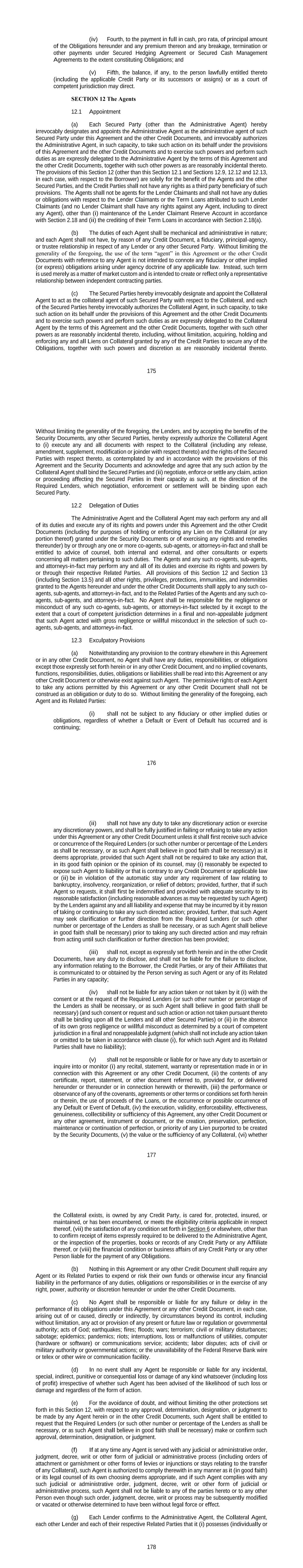 175 (iv) Fourth, to the payment in full in cash, pro rata, of principal amount of the Obligations hereunder and any premium thereon and any breakage, termination or other payments under Secured Hedging Agreement or Secured Cash Management Agreements to the extent constituting Obligations; and (v) Fifth, the balance, if any, to the person lawfully entitled thereto (including the applicable Credit Party or its successors or assigns) or as a court of competent jurisdiction may direct. SECTION 12 The Agents 12.1 Appointment (a) Each Secured Party (other than the Administrative Agent) hereby irrevocably designates and appoints the Administrative Agent as the administrative agent of such Secured Party under this Agreement and the other Credit Documents, and irrevocably authorizes the Administrative Agent, in such capacity, to take such action on its behalf under the provisions of this Agreement and the other Credit Documents and to exercise such powers and perform such duties as are expressly delegated to the Administrative Agent by the terms of this Agreement and the other Credit Documents, together with such other powers as are reasonably incidental thereto. The provisions of this Section 12 (other than this Section 12.1 and Sections 12.9, 12.12 and 12.13, in each case, with respect to the Borrower) are solely for the benefit of the Agents and the other Secured Parties, and the Credit Parties shall not have any rights as a third party beneficiary of such provisions. The Agents shall not be agents for the Lender Claimants and shall not have any duties or obligations with respect to the Lender Claimants or the Term Loans attributed to such Lender Claimants (and no Lender Claimant shall have any rights against any Agent, including to direct any Agent), other than (i) maintenance of the Lender Claimant Reserve Account in accordance with Section 2.18 and (ii) the crediting of their Term Loans in accordance with Section 2.18(a). (b) The duties of each Agent shall be mechanical and administrative in nature; and each Agent shall not have, by reason of any Credit Document, a fiduciary, principal-agency, or trustee relationship in respect of any Lender or any other Secured Party. Without limiting the generality of the foregoing, the use of the term “agent” in this Agreement or the other Credit Documents with reference to any Agent is not intended to connote any fiduciary or other implied (or express) obligations arising under agency doctrine of any applicable law. Instead, such term is used merely as a matter of market custom and is intended to create or reflect only a representative relationship between independent contracting parties. (c) The Secured Parties hereby irrevocably designate and appoint the Collateral Agent to act as the collateral agent of such Secured Party with respect to the Collateral, and each of the Secured Parties hereby irrevocably authorizes the Collateral Agent, in such capacity, to take such action on its behalf under the provisions of this Agreement and the other Credit Documents and to exercise such powers and perform such duties as are expressly delegated to the Collateral Agent by the terms of this Agreement and the other Credit Documents, together with such other powers as are reasonably incidental thereto, including, without limitation, acquiring, holding and enforcing any and all Liens on Collateral granted by any of the Credit Parties to secure any of the Obligations, together with such powers and discretion as are reasonably incidental thereto. 176 Without limiting the generality of the foregoing, the Lenders, and by accepting the benefits of the Security Documents, any other Secured Parties, hereby expressly authorize the Collateral Agent to (i) execute any and all documents with respect to the Collateral (including any release, amendment, supplement, modification or joinder with respect thereto) and the rights of the Secured Parties with respect thereto, as contemplated by and in accordance with the provisions of this Agreement and the Security Documents and acknowledge and agree that any such action by the Collateral Agent shall bind the Secured Parties and (ii) negotiate, enforce or settle any claim, action or proceeding affecting the Secured Parties in their capacity as such, at the direction of the Required Lenders, which negotiation, enforcement or settlement will be binding upon each Secured Party. 12.2 Delegation of Duties The Administrative Agent and the Collateral Agent may each perform any and all of its duties and execute any of its rights and powers under this Agreement and the other Credit Documents (including for purposes of holding or enforcing any Lien on the Collateral (or any portion thereof) granted under the Security Documents or of exercising any rights and remedies thereunder) by or through any one or more co-agents, sub-agents, or attorneys-in-fact and shall be entitled to advice of counsel, both internal and external, and other consultants or experts concerning all matters pertaining to such duties. The Agents and any such co-agents, sub-agents, and attorneys-in-fact may perform any and all of its duties and exercise its rights and powers by or through their respective Related Parties. All provisions of this Section 12 and Section 13 (including Section 13.5) and all other rights, privileges, protections, immunities, and indemnities granted to the Agents hereunder and under the other Credit Documents shall apply to any such co- agents, sub-agents, and attorneys-in-fact, and to the Related Parties of the Agents and any such co- agents, sub-agents, and attorneys-in-fact. No Agent shall be responsible for the negligence or misconduct of any such co-agents, sub-agents, or attorneys-in-fact selected by it except to the extent that a court of competent jurisdiction determines in a final and non-appealable judgment that such Agent acted with gross negligence or willful misconduct in the selection of such co- agents, sub-agents, and attorneys-in-