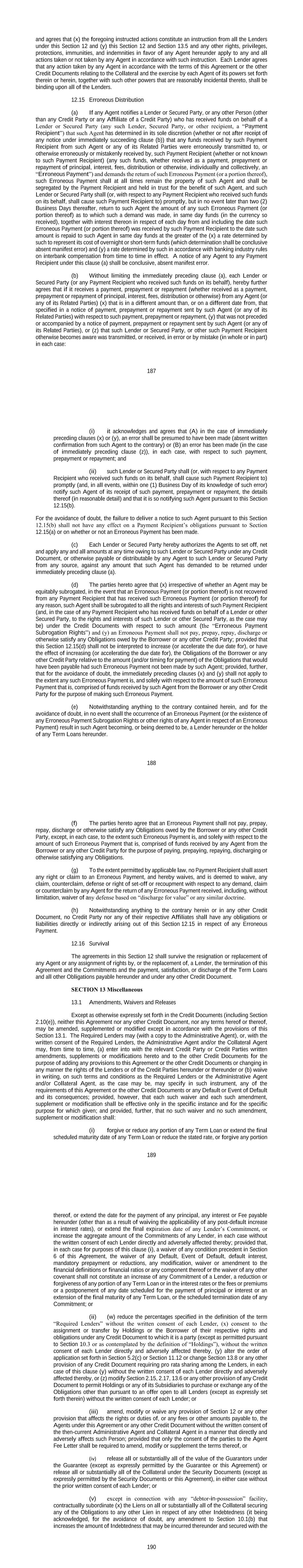 187 and agrees that (x) the foregoing instructed actions constitute an instruction from all the Lenders under this Section 12 and (y) this Section 12 and Section 13.5 and any other rights, privileges, protections, immunities, and indemnities in favor of any Agent hereunder apply to any and all actions taken or not taken by any Agent in accordance with such instruction. Each Lender agrees that any action taken by any Agent in accordance with the terms of this Agreement or the other Credit Documents relating to the Collateral and the exercise by each Agent of its powers set forth therein or herein, together with such other powers that are reasonably incidental thereto, shall be binding upon all of the Lenders. 12.15 Erroneous Distribution (a) If any Agent notifies a Lender or Secured Party, or any other Person (other than any Credit Party or any Affiliate of a Credit Party) who has received funds on behalf of a Lender or Secured Party (any such Lender, Secured Party, or other recipient, a “Payment Recipient”) that such Agent has determined in its sole discretion (whether or not after receipt of any notice under immediately succeeding clause (b)) that any funds received by such Payment Recipient from such Agent or any of its Related Parties were erroneously transmitted to, or otherwise erroneously or mistakenly received by, such Payment Recipient (whether or not known to such Payment Recipient) (any such funds, whether received as a payment, prepayment or repayment of principal, interest, fees, distribution or otherwise, individually and collectively, an “Erroneous Payment”) and demands the return of such Erroneous Payment (or a portion thereof), such Erroneous Payment shall at all times remain the property of such Agent and shall be segregated by the Payment Recipient and held in trust for the benefit of such Agent, and such Lender or Secured Party shall (or, with respect to any Payment Recipient who received such funds on its behalf, shall cause such Payment Recipient to) promptly, but in no event later than two (2) Business Days thereafter, return to such Agent the amount of any such Erroneous Payment (or portion thereof) as to which such a demand was made, in same day funds (in the currency so received), together with interest thereon in respect of each day from and including the date such Erroneous Payment (or portion thereof) was received by such Payment Recipient to the date such amount is repaid to such Agent in same day funds at the greater of the (x) a rate determined by such to represent its cost of overnight or short-term funds (which determination shall be conclusive absent manifest error) and (y) a rate determined by such in accordance with banking industry rules on interbank compensation from time to time in effect. A notice of any Agent to any Payment Recipient under this clause (a) shall be conclusive, absent manifest error. (b) Without limiting the immediately preceding clause (a), each Lender or Secured Party (or any Payment Recipient who received such funds on its behalf), hereby further agrees that if it receives a payment, prepayment or repayment (whether received as a payment, prepayment or repayment of principal, interest, fees, distribution or otherwise) from any Agent (or any of its Related Parties) (x) that is in a different amount than, or on a different date from, that specified in a notice of payment, prepayment or repayment sent by such Agent (or any of its Related Parties) with respect to such payment, prepayment or repayment, (y) that was not preceded or accompanied by a notice of payment, prepayment or repayment sent by such Agent (or any of its Related Parties), or (z) that such Lender or Secured Party, or other such Payment Recipient otherwise becomes aware was transmitted, or received, in error or by mistake (in whole or in part) in each case: 188 (i) it acknowledges and agrees that (A) in the case of immediately preceding clauses (x) or (y), an error shall be presumed to have been made (absent written confirmation from such Agent to the contrary) or (B) an error has been made (in the case of immediately preceding clause (z)), in each case, with respect to such payment, prepayment or repayment; and (ii) such Lender or Secured Party shall (or, with respect to any Payment Recipient who received such funds on its behalf, shall cause such Payment Recipient to) promptly (and, in all events, within one (1) Business Day of its knowledge of such error) notify such Agent of its receipt of such payment, prepayment or repayment, the details thereof (in reasonable detail) and that it is so notifying such Agent pursuant to this Section 12.15(b). For the avoidance of doubt, the failure to deliver a notice to such Agent pursuant to this Section 12.15(b) shall not have any effect on a Payment Recipient’s obligations pursuant to Section 12.15(a) or on whether or not an Erroneous Payment has been made. (c) Each Lender or Secured Party hereby authorizes the Agents to set off, net and apply any and all amounts at any time owing to such Lender or Secured Party under any Credit Document, or otherwise payable or distributable by any Agent to such Lender or Secured Party from any source, against any amount that such Agent has demanded to be returned under immediately preceding clause (a). (d) The parties hereto agree that (x) irrespective of whether an Agent may be equitably subrogated, in the event that an Erroneous Payment (or portion thereof) is not recovered from any Payment Recipient that has received such Erroneous Payment (or portion thereof) for any reason, such Agent shall be subrogated to all the rights and interests of such Payment Recipient (and, in the case of any Payment Recipient who has received funds on behalf of a Lender or other Secured Party, to the rights and interests of such Lender or other Secured Party, as the case may be) under the Credit Documents with respect to such amount (the “Erroneous Payment Subrogation Rights”) and (y) an Erroneo