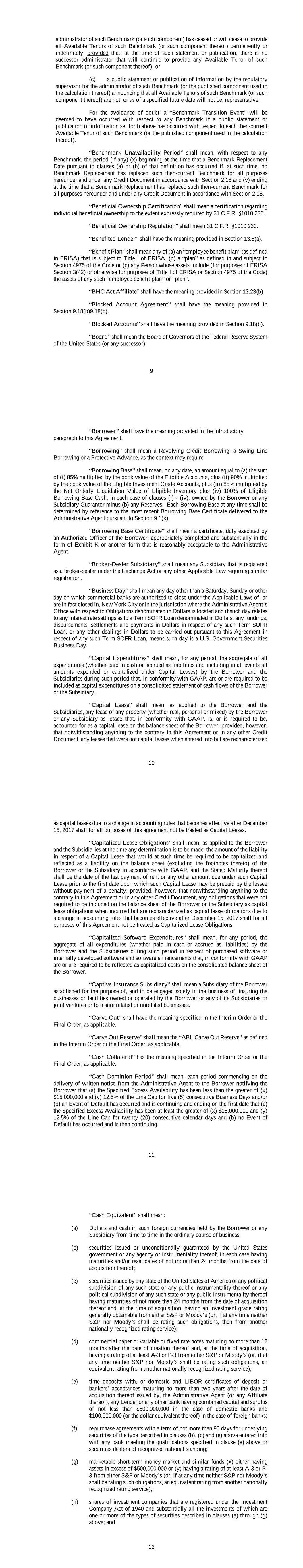 9 administrator of such Benchmark (or such component) has ceased or will cease to provide all Available Tenors of such Benchmark (or such component thereof) permanently or indefinitely, provided that, at the time of such statement or publication, there is no successor administrator that will continue to provide any Available Tenor of such Benchmark (or such component thereof); or (c) a public statement or publication of information by the regulatory supervisor for the administrator of such Benchmark (or the published component used in the calculation thereof) announcing that all Available Tenors of such Benchmark (or such component thereof) are not, or as of a specified future date will not be, representative. For the avoidance of doubt, a “Benchmark Transition Event” will be deemed to have occurred with respect to any Benchmark if a public statement or publication of information set forth above has occurred with respect to each then-current Available Tenor of such Benchmark (or the published component used in the calculation thereof). “Benchmark Unavailability Period” shall mean, with respect to any Benchmark, the period (if any) (x) beginning at the time that a Benchmark Replacement Date pursuant to clauses (a) or (b) of that definition has occurred if, at such time, no Benchmark Replacement has replaced such then-current Benchmark for all purposes hereunder and under any Credit Document in accordance with Section 2.18 and (y) ending at the time that a Benchmark Replacement has replaced such then-current Benchmark for all purposes hereunder and under any Credit Document in accordance with Section 2.18. “Beneficial Ownership Certification” shall mean a certification regarding individual beneficial ownership to the extent expressly required by 31 C.F.R. §1010.230. “Beneficial Ownership Regulation” shall mean 31 C.F.R. §1010.230. “Benefited Lender” shall have the meaning provided in Section 13.8(a). “Benefit Plan” shall mean any of (a) an “employee benefit plan” (as defined in ERISA) that is subject to Title I of ERISA, (b) a “plan” as defined in and subject to Section 4975 of the Code or (c) any Person whose assets include (for purposes of ERISA Section 3(42) or otherwise for purposes of Title I of ERISA or Section 4975 of the Code) the assets of any such “employee benefit plan” or “plan”. “BHC Act Affiliate” shall have the meaning provided in Section 13.23(b). “Blocked Account Agreement” shall have the meaning provided in Section 9.18(b)9.18(b). “Blocked Accounts” shall have the meaning provided in Section 9.18(b). “Board” shall mean the Board of Governors of the Federal Reserve System of the United States (or any successor). 10 “Borrower” shall have the meaning provided in the introductory paragraph to this Agreement. “Borrowing” shall mean a Revolving Credit Borrowing, a Swing Line Borrowing or a Protective Advance, as the context may require. “Borrowing Base” shall mean, on any date, an amount equal to (a) the sum of (i) 85% multiplied by the book value of the Eligible Accounts, plus (ii) 90% multiplied by the book value of the Eligible Investment Grade Accounts, plus (iii) 85% multiplied by the Net Orderly Liquidation Value of Eligible Inventory plus (iv) 100% of Eligible Borrowing Base Cash, in each case of clauses (i) - (iv), owned by the Borrower or any Subsidiary Guarantor minus (b) any Reserves. Each Borrowing Base at any time shall be determined by reference to the most recent Borrowing Base Certificate delivered to the Administrative Agent pursuant to Section 9.1(k). “Borrowing Base Certificate” shall mean a certificate, duly executed by an Authorized Officer of the Borrower, appropriately completed and substantially in the form of Exhibit K or another form that is reasonably acceptable to the Administrative Agent. “Broker-Dealer Subsidiary” shall mean any Subsidiary that is registered as a broker-dealer under the Exchange Act or any other Applicable Law requiring similar registration. “Business Day” shall mean any day other than a Saturday, Sunday or other day on which commercial banks are authorized to close under the Applicable Laws of, or are in fact closed in, New York City or in the jurisdiction where the Administrative Agent’s Office with respect to Obligations denominated in Dollars is located and if such day relates to any interest rate settings as to a Term SOFR Loan denominated in Dollars, any fundings, disbursements, settlements and payments in Dollars in respect of any such Term SOFR Loan, or any other dealings in Dollars to be carried out pursuant to this Agreement in respect of any such Term SOFR Loan, means such day is a U.S. Government Securities Business Day. “Capital Expenditures” shall mean, for any period, the aggregate of all expenditures (whether paid in cash or accrued as liabilities and including in all events all amounts expended or capitalized under Capital Leases) by the Borrower and the Subsidiaries during such period that, in conformity with GAAP, are or are required to be included as capital expenditures on a consolidated statement of cash flows of the Borrower or the Subsidiary. “Capital Lease” shall mean, as applied to the Borrower and the Subsidiaries, any lease of any property (whether real, personal or mixed) by the Borrower or any Subsidiary as lessee that, in conformity with GAAP, is, or is required to be, accounted for as a capital lease on the balance sheet of the Borrower; provided, however, that notwithstanding anything to the contrary in this Agreement or in any other Credit Document, any leases that were not capital leases when entered into but are recharacterized 11 as capital leases due to a change in accounting rules that becomes effective after December 15, 2017 shall for all purposes of this agreement not be treated as Capital Leases. “Capitalized Lease Obligations” shall mean, as applied to the Borrower and the Subsidiaries at the t