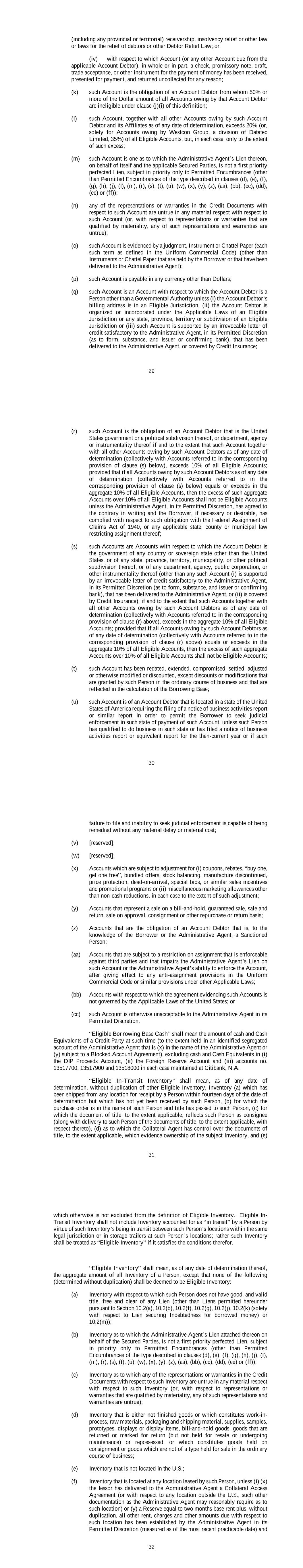 145 Dispositions to the Borrower or any other Subsidiary of the Borrower and (iii) any Credit Party may make Dispositions to a non-Credit Party to the extent permitted under Section 10.13; (d) the Borrower and any Subsidiary may effect any transaction permitted by Sections 10.2, 10.3 (other than Section 10.3(j)), 10.5 (other than Section 10.5(l)) or 10.6 (other than Section 10.6(f)); (e) the Borrower and any Subsidiary may lease, sublease, license (only on a non-exclusive basis, with respect to any intellectual property) or sublicense (only on a non- exclusive basis, with respect to any intellectual property) real, personal or intellectual property in the ordinary course of business; (f) Dispositions of property (including like-kind exchanges) to the extent that (i) such property is exchanged for credit against the purchase price of similar replacement property (excluding any boot thereon) or (ii) the proceeds of such Disposition are applied to the purchase price of such replacement property, in each case under Section 1031 of the Code or otherwise; (g) [reserved]; (h) Dispositions of (i) Investments in joint ventures (regardless of the form of legal entity) to the extent required by, or made pursuant to, customary buy/sell arrangements or put/call arrangements between the joint venture parties set forth in joint venture arrangements and similar binding arrangements or (ii) to joint ventures in connection with the dissolution or termination of a joint venture to the extent required pursuant to joint venture and similar arrangements; (i) [reserved]; (j) Dispositions listed on Schedule 10.4; (k) transfers of property subject to a Recovery Event or in connection with any condemnation proceeding upon receipt of the Net Cash Proceeds of such Recovery Event or condemnation proceeding; (l) Dispositions or discounts of accounts receivable or notes receivable in connection with the collection or compromise thereof or the conversion of accounts receivable to notes receivable; (m) [reserved]; (n) the execution of (or amendment to), settlement of or unwinding of any Hedging Agreement; (o) [reserved]; (p) the surrender or waiver of contractual rights and settlement or waiver of contractual or litigation claims, in each case, in the ordinary course of business; 146 (q) [reserved]; (r) [reserved]; (s) the Borrower and any Subsidiary may (i) terminate or otherwise collapse its cost sharing agreements with the Borrower or any Subsidiary and settle any crossing payments in connection therewith, (ii) convert any intercompany Indebtedness to Stock or any Stock to intercompany Indebtedness, (iii) settle, discount, write off, forgive or cancel any intercompany Indebtedness or other obligation owing by the Borrower or any Subsidiary or (iv) settle, discount, write off, forgive or cancel any Indebtedness owing by any present or former consultants, managers, directors, officers or employees of Holdings, the Borrower, any direct or indirect parent thereof, or any Subsidiary thereof or any of their successors or assigns; (t) any Disposition of property to the extent that (1) such property is exchanged for credit against the purchase price of similar replacement property that is purchased within 270 days thereof or (2) the proceeds of such Disposition are promptly applied to the purchase price of such replacement property (which replacement property is actually purchased within 270 days thereof); (u) [reserved]; (v) any swap of assets in exchange for services or other assets in the ordinary course of business of comparable or greater fair market value or usefulness to the business of the Borrower and the Subsidiaries, taken as a whole, as determined in good faith by the Borrower; and (w) Dispositions of any asset between or among the Borrower and/or any Subsidiary as a substantially concurrent interim Disposition in connection with a Disposition otherwise permitted pursuant to clauses (a) through (v) above; provided that after giving effect to any such Disposition, to the extent the assets subject to such Dispositions constituted Collateral, such assets shall remain subject to, or be rejoined to, the Lien of the Security Documents. Notwithstanding the foregoing, no transfer or other Disposition of any intellectual property by a Credit Party to any Person that is not a Credit Party may be made except pursuant to Section 10.4(e). Substantially simultaneously with the consummation of any Disposition (other than any Disposition permitted under Section 10.4(a)(ii)), if assets constituting more than 5% of the Borrowing Base are Disposed of in such Disposition, the Borrower shall deliver an updated Borrowing Base Certificate that gives pro forma effect to such Disposition, together with 147 calculations sufficient to demonstrate that the Availability Requirements shall be satisfied immediately after giving effect to such Disposition. 10.5 Limitation on Investments The Borrower will not, and will not permit the Subsidiaries, to make any Investment except: (a) extensions of trade credit, asset purchases (including purchases of inventory, supplies, materials and equipment) and the licensing or contribution of intellectual property pursuant to joint marketing arrangements, original equipment manufacturer arrangements or development agreements with other Persons, in each case in the ordinary course of business; (b) Investments in cash or Cash Equivalents when such Investments were made; (c) [reserved]; (d) Investments existing on, or made pursuant to legally binding written commitments in existence on, the Closing Date; (e) any Investment acquired by the Borrower or any Subsidiary (i) in exchange for any other Investment or accounts receivable held by the Borrower or any such Subsidiary in connection with or as a result of a bankruptcy, workout, reorganization, or recapitalization of, or settlement of delinquent accounts or disputes with or judgments against, the issuer, obligor or borrower of such original Investment or accou