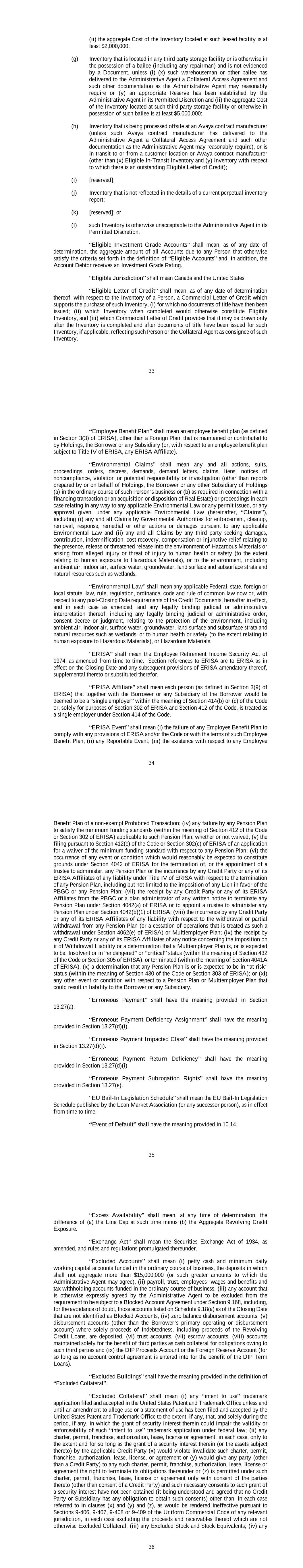 33 (ii) the aggregate Cost of the Inventory located at such leased facility is at least $2,000,000; (g) Inventory that is located in any third party storage facility or is otherwise in the possession of a bailee (including any repairman) and is not evidenced by a Document, unless (i) (x) such warehouseman or other bailee has delivered to the Administrative Agent a Collateral Access Agreement and such other documentation as the Administrative Agent may reasonably require or (y) an appropriate Reserve has been established by the Administrative Agent in its Permitted Discretion and (ii) the aggregate Cost of the Inventory located at such third party storage facility or otherwise in possession of such bailee is at least $5,000,000; (h) Inventory that is being processed offsite at an Avaya contract manufacturer (unless such Avaya contract manufacturer has delivered to the Administrative Agent a Collateral Access Agreement and such other documentation as the Administrative Agent may reasonably require), or is in-transit to or from a customer location or Avaya contract manufacturer (other than (x) Eligible In-Transit Inventory and (y) Inventory with respect to which there is an outstanding Eligible Letter of Credit); (i) [reserved]; (j) Inventory that is not reflected in the details of a current perpetual inventory report; (k) [reserved]; or (l) such Inventory is otherwise unacceptable to the Administrative Agent in its Permitted Discretion. “Eligible Investment Grade Accounts” shall mean, as of any date of determination, the aggregate amount of all Accounts due to any Person that otherwise satisfy the criteria set forth in the definition of “Eligible Accounts” and, in addition, the Account Debtor receives an Investment Grade Rating. “Eligible Jurisdiction” shall mean Canada and the United States. “Eligible Letter of Credit” shall mean, as of any date of determination thereof, with respect to the Inventory of a Person, a Commercial Letter of Credit which supports the purchase of such Inventory, (i) for which no documents of title have then been issued; (ii) which Inventory when completed would otherwise constitute Eligible Inventory, and (iii) which Commercial Letter of Credit provides that it may be drawn only after the Inventory is completed and after documents of title have been issued for such Inventory, if applicable, reflecting such Person or the Collateral Agent as consignee of such Inventory. 34 “Employee Benefit Plan” shall mean an employee benefit plan (as defined in Section 3(3) of ERISA), other than a Foreign Plan, that is maintained or contributed to by Holdings, the Borrower or any Subsidiary (or, with respect to an employee benefit plan subject to Title IV of ERISA, any ERISA Affiliate). “Environmental Claims” shall mean any and all actions, suits, proceedings, orders, decrees, demands, demand letters, claims, liens, notices of noncompliance, violation or potential responsibility or investigation (other than reports prepared by or on behalf of Holdings, the Borrower or any other Subsidiary of Holdings (a) in the ordinary course of such Person’s business or (b) as required in connection with a financing transaction or an acquisition or disposition of Real Estate) or proceedings in each case relating in any way to any applicable Environmental Law or any permit issued, or any approval given, under any applicable Environmental Law (hereinafter, “Claims”), including (i) any and all Claims by Governmental Authorities for enforcement, cleanup, removal, response, remedial or other actions or damages pursuant to any applicable Environmental Law and (ii) any and all Claims by any third party seeking damages, contribution, indemnification, cost recovery, compensation or injunctive relief relating to the presence, release or threatened release into the environment of Hazardous Materials or arising from alleged injury or threat of injury to human health or safety (to the extent relating to human exposure to Hazardous Materials), or to the environment, including ambient air, indoor air, surface water, groundwater, land surface and subsurface strata and natural resources such as wetlands. “Environmental Law” shall mean any applicable Federal, state, foreign or local statute, law, rule, regulation, ordinance, code and rule of common law now or, with respect to any post-Closing Date requirements of the Credit Documents, hereafter in effect, and in each case as amended, and any legally binding judicial or administrative interpretation thereof, including any legally binding judicial or administrative order, consent decree or judgment, relating to the protection of the environment, including ambient air, indoor air, surface water, groundwater, land surface and subsurface strata and natural resources such as wetlands, or to human health or safety (to the extent relating to human exposure to Hazardous Materials), or Hazardous Materials. “ERISA” shall mean the Employee Retirement Income Security Act of 1974, as amended from time to time. Section references to ERISA are to ERISA as in effect on the Closing Date and any subsequent provisions of ERISA amendatory thereof, supplemental thereto or substituted therefor. “ERISA Affiliate” shall mean each person (as defined in Section 3(9) of ERISA) that together with the Borrower or any Subsidiary of the Borrower would be deemed to be a “single employer” within the meaning of Section 414(b) or (c) of the Code or, solely for purposes of Section 302 of ERISA and Section 412 of the Code, is treated as a single employer under Section 414 of the Code. “ERISA Event” shall mean (i) the failure of any Employee Benefit Plan to comply with any provisions of ERISA and/or the Code or with the terms of such Employee Benefit Plan; (ii) any Reportable Event; (iii) the existence with respect to any Employee 35 Benefit Plan of a non-exempt Prohibited Transaction; (iv) any failure by any Pension Plan to satisfy the minimum fundi