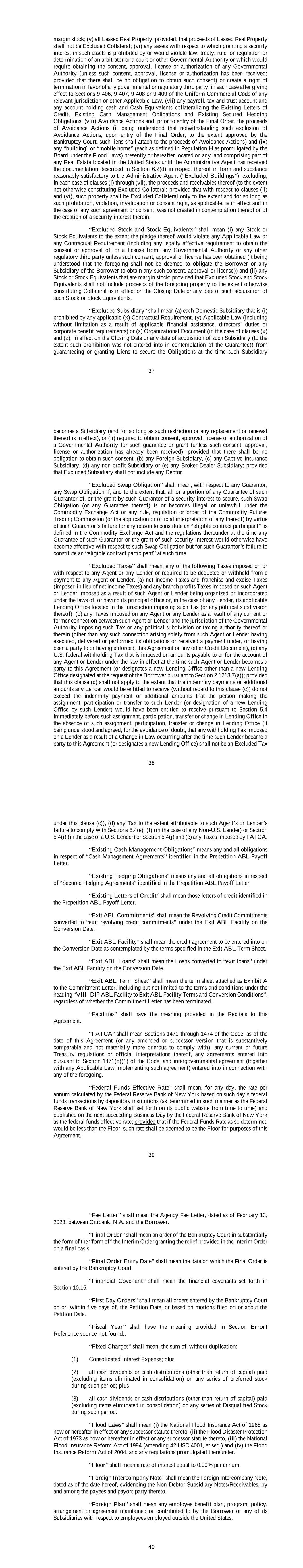 5 “Applicable Rate” shall mean a percentage per annum equal to (i) for Term SOFR Loans, 3.00%, (ii) for ABR Loans, 2.00% and (iii) for Letter of Credit Fees, 3.00%. “Applicable Time” shall mean, with respect to any payments in any Alternative Currency, the local time in the place of settlement for such Alternative Currency as may be determined by the Administrative Agent or the relevant L/C Issuer, as the case may be, to be necessary for timely settlement on the relevant date in accordance with normal banking procedures in the place of payment. “Appropriate Lender” shall mean, at any time, (a) with respect to Revolving Credit Loans, the Revolving Credit Lenders, (b) [reserved], (c) with respect to any Letter of Credit, (i) the relevant L/C Issuer and (ii) the Revolving Credit Lenders, (d) [reserved], (e) with respect to any Swing Line Loan, the Swing Line Lender and if any Swing Line Loans are outstanding pursuant to Section 3.2(a), the Revolving Credit Lenders, (f) [reserved] and (g) with respect to any Protective Advance, the Administrative Agent and the Revolving Credit Lenders. “Approved Budget” shall mean a projected statement of sources and uses of cash for the Borrower and the other Debtors on a weekly basis for the following 13 calendar weeks including the anticipated uses of the Facilities and the Term Facility for each week during such period, in substantially the form of Exhibit K hereto. As used herein, “Approved Budget” shall initially refer to the initial Approved Budget delivered in accordance with Section 6.9 and thereafter shall refer to the most recent Approved Budget delivered by the Borrower in accordance with Section 9.1(b), to the extent such Approved Budget is accepted by the Required Lenders. “Approved Fund” shall mean any Fund that is administered or managed by (a) a Lender, (b) an Affiliate of a Lender, or (c) an entity or an Affiliate of an entity that administers or manages a Lender. “Assignment and Assumption” shall mean an assignment and assumption substantially in the form of Exhibit I, or such other form as may be approved by the Administrative Agent and the Borrower. “Authorized Officer” shall mean the President, the Chief Executive Officer, the Chief Financial Officer, the Chief Operating Officer, the Chief Restructuring Officer, the Treasurer, any Assistant Treasurer, the Controller, any Vice President, with respect to certain limited liability companies or partnerships that do not have officers, any manager, managing member or general partner thereof, any other senior officer of Holdings, the Borrower or any other Credit Party designated as such in writing to the Administrative Agent by Holdings, the Borrower or such other Credit Party, as applicable from time to time, and, with respect to any document delivered on the Closing Date, the Secretary or any Assistant Secretary of any Credit Party. Any document delivered hereunder that is signed by an Authorized Officer shall be conclusively presumed to have been authorized by all necessary corporate, limited liability company, partnership and/or other action on the part of Holdings, the Borrower or any other Credit Party and such Authorized Officer shall be conclusively presumed to have acted on behalf of such Person. 6 “Auto-Renewal Letter of Credit” shall have the meaning provided in Section 3.1(b)(iii). “Availability Requirements” shall mean, at any time, that (a) the Revolving Credit Exposure of each Revolving Credit Lender shall not exceed its Revolving Credit Commitments, (b) [reserved] and (c) the Aggregate Revolving Credit Exposure shall not exceed the Line Cap. “Availability Reserves” shall mean, without duplication of any other reserves or items that are otherwise addressed or excluded through eligibility criteria, such reserves, subject to Section 2.17, as the Administrative Agent, in its Permitted Discretion, determines as being appropriate to reflect any impediments to the realization upon the Collateral consisting of Eligible Accounts or Eligible Inventory included in the Borrowing Base (including claims that the Administrative Agent determines will need to be satisfied in connection with the realization upon such Collateral). “Available Tenor” shall mean, as of any date of determination and with respect to the then-current Benchmark, (x) if such Benchmark is a term rate, any tenor for such Benchmark (or component thereof) that is or may be used for determining the length of an interest period pursuant to this Agreement or (y) otherwise, any payment period for interest calculated with reference to such Benchmark (or component thereof) that is or may be used for determining any frequency of making payments of interest calculated with reference to such Benchmark pursuant to this Agreement, in each case, as of such date and not including, for the avoidance of doubt, any tenor for such Benchmark that is then- removed from the definition of “Interest Period” pursuant to Section 2.18(d). “Avoidance Action” shall have the meaning specified in the Interim Order or the Final Order, as applicable. “Bail-In Action” shall mean the exercise of any Write-Down and Conversion Powers by the applicable Resolution Authority in respect of any liability of an Affected Financial Institution. “Bail-In Legislation” shall mean (a) with respect to any EEA Member Country implementing Article 55 of Directive 2014/59/EU of the European Parliament and of the Council of the European Union, the implementing law, regulation, rule or requirement for such EEA Member Country from time to time which is described in the EU Bail-In Legislation Schedule and (b) with respect to the United Kingdom, Part I of the United Kingdom Banking Act 2009 (as amended from time to time) and any other law, regulation or rule applicable in the United Kingdom relating to the resolution of unsound or failing banks, investment firms or other financial institutions or their affiliates (oth