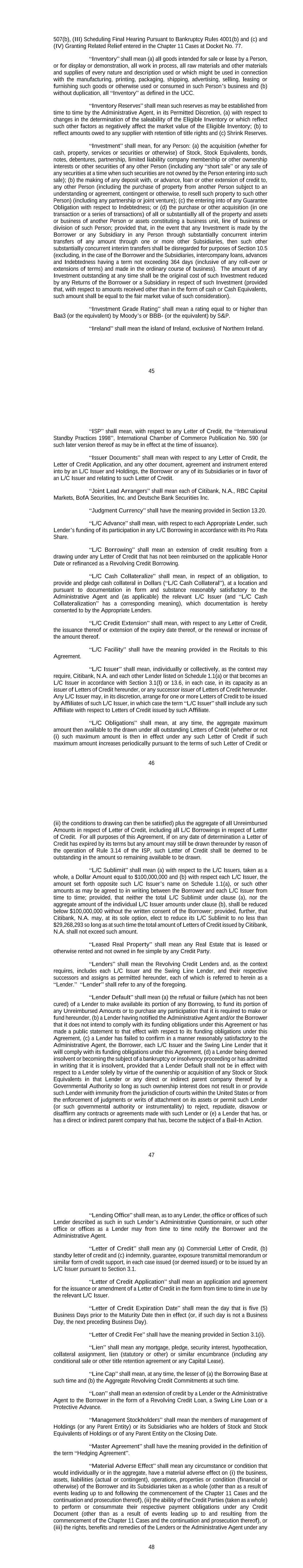 45 507(b), (III) Scheduling Final Hearing Pursuant to Bankruptcy Rules 4001(b) and (c) and (IV) Granting Related Relief entered in the Chapter 11 Cases at Docket No. 77. “Inventory” shall mean (a) all goods intended for sale or lease by a Person, or for display or demonstration, all work in process, all raw materials and other materials and supplies of every nature and description used or which might be used in connection with the manufacturing, printing, packaging, shipping, advertising, selling, leasing or furnishing such goods or otherwise used or consumed in such Person’s business and (b) without duplication, all “Inventory” as defined in the UCC. “Inventory Reserves” shall mean such reserves as may be established from time to time by the Administrative Agent, in its Permitted Discretion, (a) with respect to changes in the determination of the saleability of the Eligible Inventory or which reflect such other factors as negatively affect the market value of the Eligible Inventory; (b) to reflect amounts owed to any supplier with retention of title rights and (c) Shrink Reserves. “Investment” shall mean, for any Person: (a) the acquisition (whether for cash, property, services or securities or otherwise) of Stock, Stock Equivalents, bonds, notes, debentures, partnership, limited liability company membership or other ownership interests or other securities of any other Person (including any “short sale” or any sale of any securities at a time when such securities are not owned by the Person entering into such sale); (b) the making of any deposit with, or advance, loan or other extension of credit to, any other Person (including the purchase of property from another Person subject to an understanding or agreement, contingent or otherwise, to resell such property to such other Person) (including any partnership or joint venture); (c) the entering into of any Guarantee Obligation with respect to Indebtedness; or (d) the purchase or other acquisition (in one transaction or a series of transactions) of all or substantially all of the property and assets or business of another Person or assets constituting a business unit, line of business or division of such Person; provided that, in the event that any Investment is made by the Borrower or any Subsidiary in any Person through substantially concurrent interim transfers of any amount through one or more other Subsidiaries, then such other substantially concurrent interim transfers shall be disregarded for purposes of Section 10.5 (excluding, in the case of the Borrower and the Subsidiaries, intercompany loans, advances and Indebtedness having a term not exceeding 364 days (inclusive of any roll-over or extensions of terms) and made in the ordinary course of business). The amount of any Investment outstanding at any time shall be the original cost of such Investment reduced by any Returns of the Borrower or a Subsidiary in respect of such Investment (provided that, with respect to amounts received other than in the form of cash or Cash Equivalents, such amount shall be equal to the fair market value of such consideration). “Investment Grade Rating” shall mean a rating equal to or higher than Baa3 (or the equivalent) by Moody’s or BBB- (or the equivalent) by S&P. “Ireland” shall mean the island of Ireland, exclusive of Northern Ireland. 46 “ISP” shall mean, with respect to any Letter of Credit, the “International Standby Practices 1998”, International Chamber of Commerce Publication No. 590 (or such later version thereof as may be in effect at the time of issuance). “Issuer Documents” shall mean with respect to any Letter of Credit, the Letter of Credit Application, and any other document, agreement and instrument entered into by an L/C Issuer and Holdings, the Borrower or any of its Subsidiaries or in favor of an L/C Issuer and relating to such Letter of Credit. “Joint Lead Arrangers” shall mean each of Citibank, N.A., RBC Capital Markets, BofA Securities, Inc. and Deutsche Bank Securities Inc. “Judgment Currency” shall have the meaning provided in Section 13.20. “L/C Advance” shall mean, with respect to each Appropriate Lender, such Lender’s funding of its participation in any L/C Borrowing in accordance with its Pro Rata Share. “L/C Borrowing” shall mean an extension of credit resulting from a drawing under any Letter of Credit that has not been reimbursed on the applicable Honor Date or refinanced as a Revolving Credit Borrowing. “L/C Cash Collateralize” shall mean, in respect of an obligation, to provide and pledge cash collateral in Dollars (“L/C Cash Collateral”), at a location and pursuant to documentation in form and substance reasonably satisfactory to the Administrative Agent and (as applicable) the relevant L/C Issuer (and “L/C Cash Collateralization” has a corresponding meaning), which documentation is hereby consented to by the Appropriate Lenders. “L/C Credit Extension” shall mean, with respect to any Letter of Credit, the issuance thereof or extension of the expiry date thereof, or the renewal or increase of the amount thereof. “L/C Facility” shall have the meaning provided in the Recitals to this Agreement. “L/C Issuer” shall mean, individually or collectively, as the context may require, Citibank, N.A. and each other Lender listed on Schedule 1.1(a) or that becomes an L/C Issuer in accordance with Section 3.1(l) or 13.6, in each case, in its capacity as an issuer of Letters of Credit hereunder, or any successor issuer of Letters of Credit hereunder. Any L/C Issuer may, in its discretion, arrange for one or more Letters of Credit to be issued by Affiliates of such L/C Issuer, in which case the term “L/C Issuer” shall include any such Affiliate with respect to Letters of Credit issued by such Affiliate. “L/C Obligations” shall mean, at any time, the aggregate maximum amount then available to the drawn under all outstanding Letters of Cre