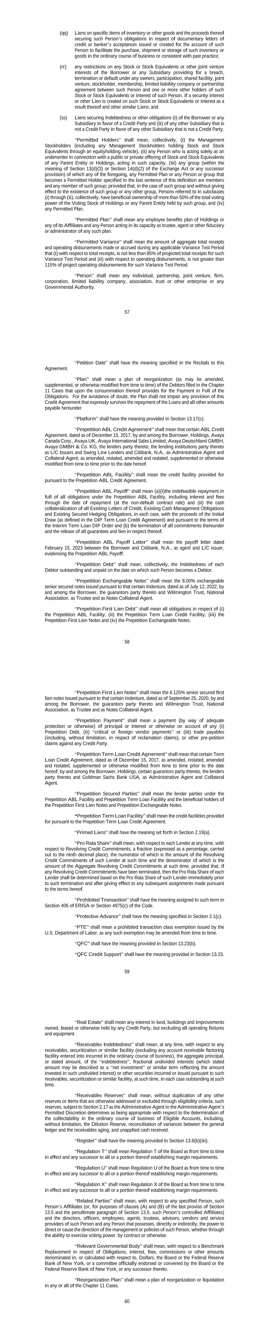 57 (qq) Liens on specific items of inventory or other goods and the proceeds thereof securing such Person’s obligations in respect of documentary letters of credit or banker’s acceptances issued or created for the account of such Person to facilitate the purchase, shipment or storage of such inventory or goods in the ordinary course of business or consistent with past practice; (rr) any restrictions on any Stock or Stock Equivalents or other joint venture interests of the Borrower or any Subsidiary providing for a breach, termination or default under any owners, participation, shared facility, joint venture, stockholder, membership, limited liability company or partnership agreement between such Person and one or more other holders of such Stock or Stock Equivalents or interest of such Person, if a security interest or other Lien is created on such Stock or Stock Equivalents or interest as a result thereof and other similar Liens; and (ss) Liens securing Indebtedness or other obligations (i) of the Borrower or any Subsidiary in favor of a Credit Party and (ii) of any other Subsidiary that is not a Credit Party in favor of any other Subsidiary that is not a Credit Party. “Permitted Holders” shall mean, collectively, (i) the Management Stockholders (including any Management Stockholders holding Stock and Stock Equivalents through an equityholding vehicle), (ii) any Person who is acting solely as an underwriter in connection with a public or private offering of Stock and Stock Equivalents of any Parent Entity or Holdings, acting in such capacity, (iii) any group (within the meaning of Section 13(d)(3) or Section 14(d)(2) of the Exchange Act or any successor provision) of which any of the foregoing, any Permitted Plan or any Person or group that becomes a Permitted Holder specified in the last sentence of this definition are members and any member of such group; provided that, in the case of such group and without giving effect to the existence of such group or any other group, Persons referred to in subclauses (i) through (ii), collectively, have beneficial ownership of more than 50% of the total voting power of the Voting Stock of Holdings or any Parent Entity held by such group, and (iv) any Permitted Plan. “Permitted Plan” shall mean any employee benefits plan of Holdings or any of its Affiliates and any Person acting in its capacity as trustee, agent or other fiduciary or administrator of any such plan. “Permitted Variance” shall mean the amount of aggregate total receipts and operating disbursements made or accrued during any applicable Variance Test Period that (i) with respect to total receipts, is not less than 85% of projected total receipts for such Variance Test Period and (ii) with respect to operating disbursements, is not greater than 115% of project operating disbursements for such Variance Test Period. “Person” shall mean any individual, partnership, joint venture, firm, corporation, limited liability company, association, trust or other enterprise or any Governmental Authority. 58 “Petition Date” shall have the meaning specified in the Recitals to this Agreement. “Plan” shall mean a plan of reorganization (as may be amended, supplemented, or otherwise modified from time to time) of the Debtors filed in the Chapter 11 Cases that upon the consummation thereof provides for the Payment in Full of the Obligations. For the avoidance of doubt, the Plan shall not impair any provision of this Credit Agreement that expressly survives the repayment of the Loans and all other amounts payable hereunder. “Platform” shall have the meaning provided in Section 13.17(c). “Prepetition ABL Credit Agreement” shall mean that certain ABL Credit Agreement, dated as of December 15, 2017, by and among the Borrower, Holdings, Avaya Canada Corp., Avaya UK, Avaya International Sales Limited, Avaya Deutschland GMBH, Avaya GMBH & Co. KG, the lenders party thereto, the lending institutions party thereto as L/C Issuers and Swing Line Lenders and Citibank, N.A., as Administrative Agent and Collateral Agent, as amended, restated, amended and restated, supplemented or otherwise modified from time to time prior to the date hereof. “Prepetition ABL Facility” shall mean the credit facility provided for pursuant to the Prepetition ABL Credit Agreement. “Prepetition ABL Payoff” shall mean (a)(i)the indefeasible repayment in full of all obligations under the Prepetition ABL Facility, including interest and fees through the date of repayment (at the non-default contract rate) and (ii) the cash collateralization of all Existing Letters of Credit, Existing Cash Management Obligations and Existing Secured Hedging Obligations, in each case, with the proceeds of the Initial Draw (as defined in the DIP Term Loan Credit Agreement) and pursuant to the terms of the Interim Term Loan DIP Order and (b) the termination of all commitments thereunder and the release of all guarantees and lien in respect thereof. “Prepetition ABL Payoff Letter” shall mean the payoff letter dated February 15, 2023 between the Borrower and Citibank, N.A., as agent and L/C issuer, evidencing the Prepetition ABL Payoff. “Prepetition Debt” shall mean, collectively, the Indebtedness of each Debtor outstanding and unpaid on the date on which such Person becomes a Debtor. “Prepetition Exchangeable Notes” shall mean the 8.00% exchangeable senior secured notes issued pursuant to that certain Indenture, dated as of July 12, 2022, by and among the Borrower, the guarantors party thereto and Wilmington Trust, National Association. as Trustee and as Notes Collateral Agent. “Prepetition First Lien Debt” shall mean all obligations in respect of (i) the Prepetition ABL Facility, (ii) the Prepetition Term Loan Credit Facility, (iii) the Prepetition First Lien Notes and (iv) the Prepetition Exchangeable Notes. 59 “Prepetition First Lien Notes” shall mean the 6.125% senior secured first lien notes issued 