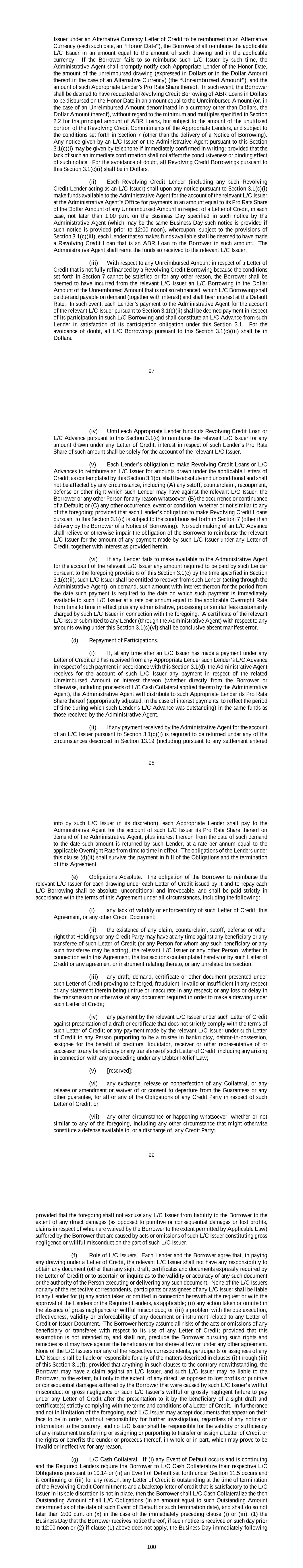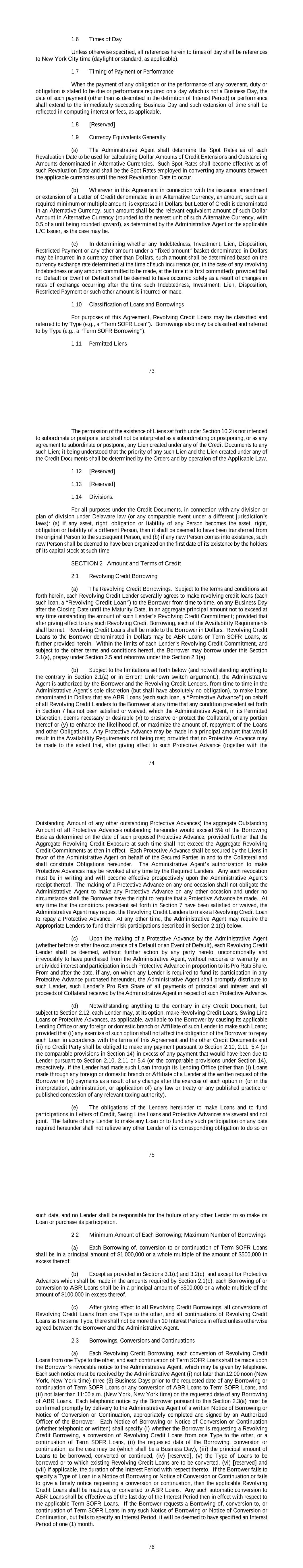 73 1.6 Times of Day Unless otherwise specified, all references herein to times of day shall be references to New York City time (daylight or standard, as applicable). 1.7 Timing of Payment or Performance When the payment of any obligation or the performance of any covenant, duty or obligation is stated to be due or performance required on a day which is not a Business Day, the date of such payment (other than as described in the definition of Interest Period) or performance shall extend to the immediately succeeding Business Day and such extension of time shall be reflected in computing interest or fees, as applicable. 1.8 [Reserved] 1.9 Currency Equivalents Generally (a) The Administrative Agent shall determine the Spot Rates as of each Revaluation Date to be used for calculating Dollar Amounts of Credit Extensions and Outstanding Amounts denominated in Alternative Currencies. Such Spot Rates shall become effective as of such Revaluation Date and shall be the Spot Rates employed in converting any amounts between the applicable currencies until the next Revaluation Date to occur. (b) Wherever in this Agreement in connection with the issuance, amendment or extension of a Letter of Credit denominated in an Alternative Currency, an amount, such as a required minimum or multiple amount, is expressed in Dollars, but Letter of Credit is denominated in an Alternative Currency, such amount shall be the relevant equivalent amount of such Dollar Amount in Alternative Currency (rounded to the nearest unit of such Alternative Currency, with 0.5 of a unit being rounded upward), as determined by the Administrative Agent or the applicable L/C Issuer, as the case may be. (c) In determining whether any Indebtedness, Investment, Lien, Disposition, Restricted Payment or any other amount under a “fixed amount” basket denominated in Dollars may be incurred in a currency other than Dollars, such amount shall be determined based on the currency exchange rate determined at the time of such incurrence (or, in the case of any revolving Indebtedness or any amount committed to be made, at the time it is first committed); provided that no Default or Event of Default shall be deemed to have occurred solely as a result of changes in rates of exchange occurring after the time such Indebtedness, Investment, Lien, Disposition, Restricted Payment or such other amount is incurred or made. 1.10 Classification of Loans and Borrowings For purposes of this Agreement, Revolving Credit Loans may be classified and referred to by Type (e.g., a “Term SOFR Loan”). Borrowings also may be classified and referred to by Type (e.g., a “Term SOFR Borrowing”). 1.11 Permitted Liens 74 The permission of the existence of Liens set forth under Section 10.2 is not intended to subordinate or postpone, and shall not be interpreted as a subordinating or postponing, or as any agreement to subordinate or postpone, any Lien created under any of the Credit Documents to any such Lien; it being understood that the priority of any such Lien and the Lien created under any of the Credit Documents shall be determined by the Orders and by operation of the Applicable Law. 1.12 [Reserved] 1.13 [Reserved] 1.14 Divisions. For all purposes under the Credit Documents, in connection with any division or plan of division under Delaware law (or any comparable event under a different jurisdiction’s laws): (a) if any asset, right, obligation or liability of any Person becomes the asset, right, obligation or liability of a different Person, then it shall be deemed to have been transferred from the original Person to the subsequent Person, and (b) if any new Person comes into existence, such new Person shall be deemed to have been organized on the first date of its existence by the holders of its capital stock at such time. SECTION 2 Amount and Terms of Credit 2.1 Revolving Credit Borrowing (a) The Revolving Credit Borrowings. Subject to the terms and conditions set forth herein, each Revolving Credit Lender severally agrees to make revolving credit loans (each such loan, a “Revolving Credit Loan”) to the Borrower from time to time, on any Business Day after the Closing Date until the Maturity Date, in an aggregate principal amount not to exceed at any time outstanding the amount of such Lender’s Revolving Credit Commitment; provided that after giving effect to any such Revolving Credit Borrowing, each of the Availability Requirements shall be met. Revolving Credit Loans shall be made to the Borrower in Dollars. Revolving Credit Loans to the Borrower denominated in Dollars may be ABR Loans or Term SOFR Loans, as further provided herein. Within the limits of each Lender’s Revolving Credit Commitment, and subject to the other terms and conditions hereof, the Borrower may borrow under this Section 2.1(a), prepay under Section 2.5 and reborrow under this Section 2.1(a). (b) Subject to the limitations set forth below (and notwithstanding anything to the contrary in Section 2.1(a) or in Error! Unknown switch argument.), the Administrative Agent is authorized by the Borrower and the Revolving Credit Lenders, from time to time in the Administrative Agent’s sole discretion (but shall have absolutely no obligation), to make loans denominated in Dollars that are ABR Loans (each such loan, a “Protective Advance”) on behalf of all Revolving Credit Lenders to the Borrower at any time that any condition precedent set forth in Section 7 has not been satisfied or waived, which the Administrative Agent, in its Permitted Discretion, deems necessary or desirable (x) to preserve or protect the Collateral, or any portion thereof or (y) to enhance the likelihood of, or maximize the amount of, repayment of the Loans and other Obligations. Any Protective Advance may be made in a principal amount that would result in the Availability Requirements not being met; provided that no Protective Advance may be made to the extent that, after giving effect to such Protective Ad