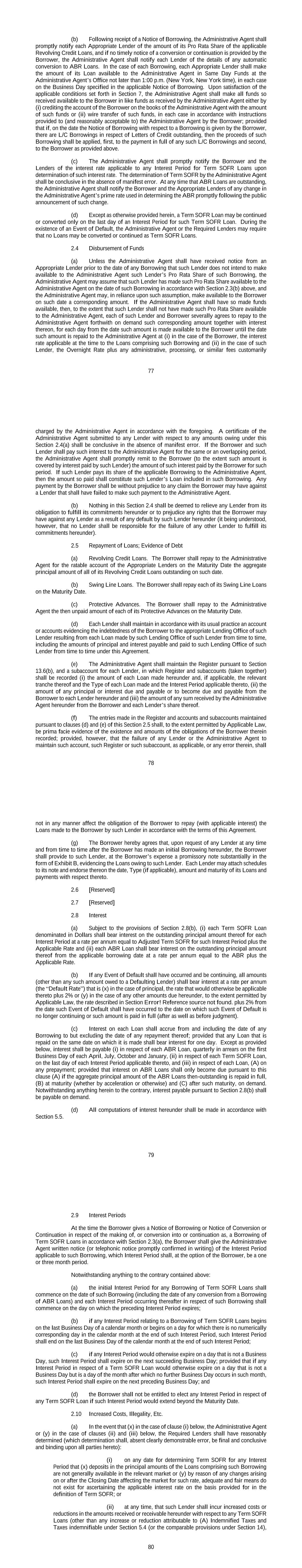 77 (b) Following receipt of a Notice of Borrowing, the Administrative Agent shall promptly notify each Appropriate Lender of the amount of its Pro Rata Share of the applicable Revolving Credit Loans, and if no timely notice of a conversion or continuation is provided by the Borrower, the Administrative Agent shall notify each Lender of the details of any automatic conversion to ABR Loans. In the case of each Borrowing, each Appropriate Lender shall make the amount of its Loan available to the Administrative Agent in Same Day Funds at the Administrative Agent’s Office not later than 1:00 p.m. (New York, New York time), in each case on the Business Day specified in the applicable Notice of Borrowing. Upon satisfaction of the applicable conditions set forth in Section 7, the Administrative Agent shall make all funds so received available to the Borrower in like funds as received by the Administrative Agent either by (i) crediting the account of the Borrower on the books of the Administrative Agent with the amount of such funds or (ii) wire transfer of such funds, in each case in accordance with instructions provided to (and reasonably acceptable to) the Administrative Agent by the Borrower; provided that if, on the date the Notice of Borrowing with respect to a Borrowing is given by the Borrower, there are L/C Borrowings in respect of Letters of Credit outstanding, then the proceeds of such Borrowing shall be applied, first, to the payment in full of any such L/C Borrowings and second, to the Borrower as provided above. (c) The Administrative Agent shall promptly notify the Borrower and the Lenders of the interest rate applicable to any Interest Period for Term SOFR Loans upon determination of such interest rate. The determination of Term SOFR by the Administrative Agent shall be conclusive in the absence of manifest error. At any time that ABR Loans are outstanding, the Administrative Agent shall notify the Borrower and the Appropriate Lenders of any change in the Administrative Agent’s prime rate used in determining the ABR promptly following the public announcement of such change. (d) Except as otherwise provided herein, a Term SOFR Loan may be continued or converted only on the last day of an Interest Period for such Term SOFR Loan. During the existence of an Event of Default, the Administrative Agent or the Required Lenders may require that no Loans may be converted or continued as Term SOFR Loans. 2.4 Disbursement of Funds (a) Unless the Administrative Agent shall have received notice from an Appropriate Lender prior to the date of any Borrowing that such Lender does not intend to make available to the Administrative Agent such Lender’s Pro Rata Share of such Borrowing, the Administrative Agent may assume that such Lender has made such Pro Rata Share available to the Administrative Agent on the date of such Borrowing in accordance with Section 2.3(b) above, and the Administrative Agent may, in reliance upon such assumption, make available to the Borrower on such date a corresponding amount. If the Administrative Agent shall have so made funds available, then, to the extent that such Lender shall not have made such Pro Rata Share available to the Administrative Agent, each of such Lender and Borrower severally agrees to repay to the Administrative Agent forthwith on demand such corresponding amount together with interest thereon, for each day from the date such amount is made available to the Borrower until the date such amount is repaid to the Administrative Agent at (i) in the case of the Borrower, the interest rate applicable at the time to the Loans comprising such Borrowing and (ii) in the case of such Lender, the Overnight Rate plus any administrative, processing, or similar fees customarily 78 charged by the Administrative Agent in accordance with the foregoing. A certificate of the Administrative Agent submitted to any Lender with respect to any amounts owing under this Section 2.4(a) shall be conclusive in the absence of manifest error. If the Borrower and such Lender shall pay such interest to the Administrative Agent for the same or an overlapping period, the Administrative Agent shall promptly remit to the Borrower (to the extent such amount is covered by interest paid by such Lender) the amount of such interest paid by the Borrower for such period. If such Lender pays its share of the applicable Borrowing to the Administrative Agent, then the amount so paid shall constitute such Lender’s Loan included in such Borrowing. Any payment by the Borrower shall be without prejudice to any claim the Borrower may have against a Lender that shall have failed to make such payment to the Administrative Agent. (b) Nothing in this Section 2.4 shall be deemed to relieve any Lender from its obligation to fulfill its commitments hereunder or to prejudice any rights that the Borrower may have against any Lender as a result of any default by such Lender hereunder (it being understood, however, that no Lender shall be responsible for the failure of any other Lender to fulfill its commitments hereunder). 2.5 Repayment of Loans; Evidence of Debt (a) Revolving Credit Loans. The Borrower shall repay to the Administrative Agent for the ratable account of the Appropriate Lenders on the Maturity Date the aggregate principal amount of all of its Revolving Credit Loans outstanding on such date. (b) Swing Line Loans. The Borrower shall repay each of its Swing Line Loans on the Maturity Date. (c) Protective Advances. The Borrower shall repay to the Administrative Agent the then unpaid amount of each of its Protective Advances on the Maturity Date. (d) Each Lender shall maintain in accordance with its usual practice an account or accounts evidencing the indebtedness of the Borrower to the appropriate Lending Office of such Lender resulting from each Loan made by such Lending Office of such Lender from time to time, including the amounts of principal and interest payable and paid to such Lending Of