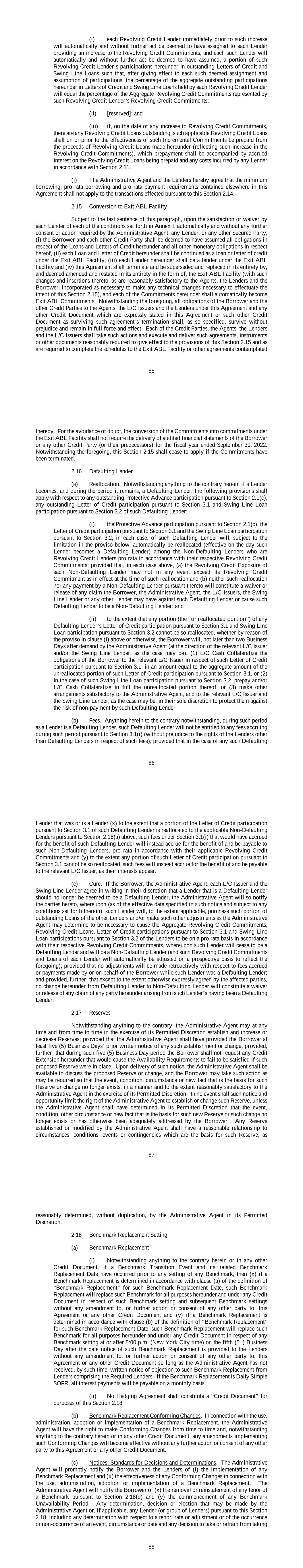 85 (i) each Revolving Credit Lender immediately prior to such increase will automatically and without further act be deemed to have assigned to each Lender providing an increase to the Revolving Credit Commitments, and each such Lender will automatically and without further act be deemed to have assumed, a portion of such Revolving Credit Lender’s participations hereunder in outstanding Letters of Credit and Swing Line Loans such that, after giving effect to each such deemed assignment and assumption of participations, the percentage of the aggregate outstanding participations hereunder in Letters of Credit and Swing Line Loans held by each Revolving Credit Lender will equal the percentage of the Aggregate Revolving Credit Commitments represented by such Revolving Credit Lender’s Revolving Credit Commitments; (ii) [reserved]; and (iii) if, on the date of any increase to Revolving Credit Commitments, there are any Revolving Credit Loans outstanding, such applicable Revolving Credit Loans shall on or prior to the effectiveness of such Incremental Commitments be prepaid from the proceeds of Revolving Credit Loans made hereunder (reflecting such increase in the Revolving Credit Commitments), which prepayment shall be accompanied by accrued interest on the Revolving Credit Loans being prepaid and any costs incurred by any Lender in accordance with Section 2.11. (j) The Administrative Agent and the Lenders hereby agree that the minimum borrowing, pro rata borrowing and pro rata payment requirements contained elsewhere in this Agreement shall not apply to the transactions effected pursuant to this Section 2.14. 2.15 Conversion to Exit ABL Facility Subject to the last sentence of this paragraph, upon the satisfaction or waiver by each Lender of each of the conditions set forth in Annex I, automatically and without any further consent or action required by the Administrative Agent, any Lender, or any other Secured Party, (i) the Borrower and each other Credit Party shall be deemed to have assumed all obligations in respect of the Loans and Letters of Credit hereunder and all other monetary obligations in respect hereof, (ii) each Loan and Letter of Credit hereunder shall be continued as a loan or letter of credit under the Exit ABL Facility, (iii) each Lender hereunder shall be a lender under the Exit ABL Facility and (iv) this Agreement shall terminate and be superseded and replaced in its entirety by, and deemed amended and restated in its entirety in the form of, the Exit ABL Facility (with such changes and insertions thereto, as are reasonably satisfactory to the Agents, the Lenders and the Borrower, incorporated as necessary to make any technical changes necessary to effectuate the intent of this Section 2.15), and each of the Commitments hereunder shall automatically become Exit ABL Commitments. Notwithstanding the foregoing, all obligations of the Borrower and the other Credit Parties to the Agents, the L/C Issuers and the Lenders under this Agreement and any other Credit Document which are expressly stated in this Agreement or such other Credit Document as surviving such agreement’s termination shall, as so specified, survive without prejudice and remain in full force and effect. Each of the Credit Parties, the Agents, the Lenders and the L/C Issuers shall take such actions and execute and deliver such agreements, instruments or other documents reasonably required to give effect to the provisions of this Section 2.15 and as are required to complete the schedules to the Exit ABL Facility or other agreements contemplated 86 thereby. For the avoidance of doubt, the conversion of the Commitments into commitments under the Exit ABL Facility shall not require the delivery of audited financial statements of the Borrower or any other Credit Party (or their predecessors) for the fiscal year ended September 30, 2022. Notwithstanding the foregoing, this Section 2.15 shall cease to apply if the Commitments have been terminated. 2.16 Defaulting Lender (a) Reallocation. Notwithstanding anything to the contrary herein, if a Lender becomes, and during the period it remains, a Defaulting Lender, the following provisions shall apply with respect to any outstanding Protective Advance participation pursuant to Section 2.1(c), any outstanding Letter of Credit participation pursuant to Section 3.1 and Swing Line Loan participation pursuant to Section 3.2 of such Defaulting Lender: (i) the Protective Advance participation pursuant to Section 2.1(c), the Letter of Credit participation pursuant to Section 3.1 and the Swing Line Loan participation pursuant to Section 3.2, in each case, of such Defaulting Lender will, subject to the limitation in the proviso below, automatically be reallocated (effective on the day such Lender becomes a Defaulting Lender) among the Non-Defaulting Lenders who are Revolving Credit Lenders pro rata in accordance with their respective Revolving Credit Commitments; provided that, in each case above, (a) the Revolving Credit Exposure of each Non-Defaulting Lender may not in any event exceed its Revolving Credit Commitment as in effect at the time of such reallocation and (b) neither such reallocation nor any payment by a Non-Defaulting Lender pursuant thereto will constitute a waiver or release of any claim the Borrower, the Administrative Agent, the L/C Issuers, the Swing Line Lender or any other Lender may have against such Defaulting Lender or cause such Defaulting Lender to be a Non-Defaulting Lender; and (ii) to the extent that any portion (the “unreallocated portion”) of any Defaulting Lender’s Letter of Credit participation pursuant to Section 3.1 and Swing Line Loan participation pursuant to Section 3.2 cannot be so reallocated, whether by reason of the proviso in clause (i) above or otherwise, the Borrower will, not later than two Business Days after demand by the Administrative Agent (at the direction of the relevant L/C Issuer and/or the Swing Line Lender, as the c