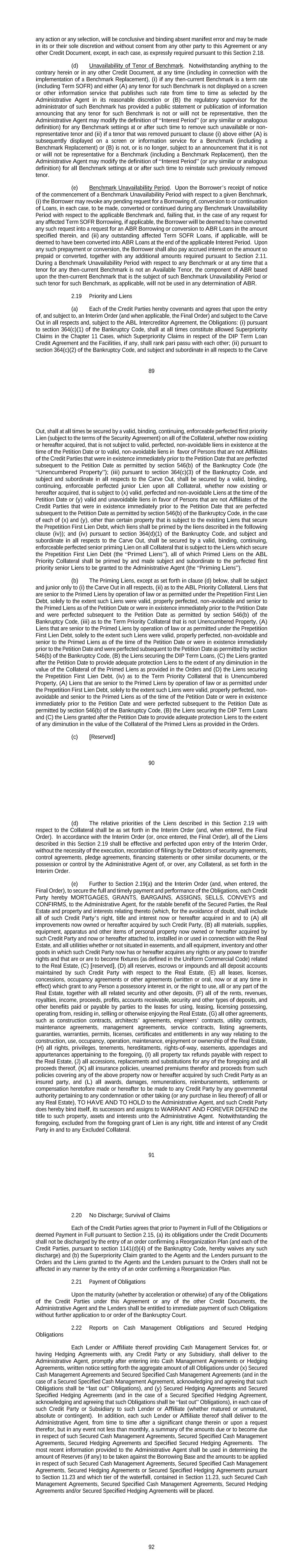 89 any action or any selection, will be conclusive and binding absent manifest error and may be made in its or their sole discretion and without consent from any other party to this Agreement or any other Credit Document, except, in each case, as expressly required pursuant to this Section 2.18. (d) Unavailability of Tenor of Benchmark. Notwithstanding anything to the contrary herein or in any other Credit Document, at any time (including in connection with the implementation of a Benchmark Replacement), (i) if any then-current Benchmark is a term rate (including Term SOFR) and either (A) any tenor for such Benchmark is not displayed on a screen or other information service that publishes such rate from time to time as selected by the Administrative Agent in its reasonable discretion or (B) the regulatory supervisor for the administrator of such Benchmark has provided a public statement or publication of information announcing that any tenor for such Benchmark is not or will not be representative, then the Administrative Agent may modify the definition of “Interest Period” (or any similar or analogous definition) for any Benchmark settings at or after such time to remove such unavailable or non- representative tenor and (ii) if a tenor that was removed pursuant to clause (i) above either (A) is subsequently displayed on a screen or information service for a Benchmark (including a Benchmark Replacement) or (B) is not, or is no longer, subject to an announcement that it is not or will not be representative for a Benchmark (including a Benchmark Replacement), then the Administrative Agent may modify the definition of “Interest Period” (or any similar or analogous definition) for all Benchmark settings at or after such time to reinstate such previously removed tenor. (e) Benchmark Unavailability Period. Upon the Borrower’s receipt of notice of the commencement of a Benchmark Unavailability Period with respect to a given Benchmark, (i) the Borrower may revoke any pending request for a Borrowing of, conversion to or continuation of Loans, in each case, to be made, converted or continued during any Benchmark Unavailability Period with respect to the applicable Benchmark and, failing that, in the case of any request for any affected Term SOFR Borrowing, if applicable, the Borrower will be deemed to have converted any such request into a request for an ABR Borrowing or conversion to ABR Loans in the amount specified therein, and (ii) any outstanding affected Term SOFR Loans, if applicable, will be deemed to have been converted into ABR Loans at the end of the applicable Interest Period. Upon any such prepayment or conversion, the Borrower shall also pay accrued interest on the amount so prepaid or converted, together with any additional amounts required pursuant to Section 2.11. During a Benchmark Unavailability Period with respect to any Benchmark or at any time that a tenor for any then-current Benchmark is not an Available Tenor, the component of ABR based upon the then-current Benchmark that is the subject of such Benchmark Unavailability Period or such tenor for such Benchmark, as applicable, will not be used in any determination of ABR. 2.19 Priority and Liens (a) Each of the Credit Parties hereby covenants and agrees that upon the entry of, and subject to, an Interim Order (and when applicable, the Final Order) and subject to the Carve Out in all respects and, subject to the ABL Intercreditor Agreement, the Obligations: (i) pursuant to section 364(c)(1) of the Bankruptcy Code, shall at all times constitute allowed Superpriority Claims in the Chapter 11 Cases, which Superpriority Claims in respect of the DIP Term Loan Credit Agreement and the Facilities, if any, shall rank pari passu with each other; (ii) pursuant to section 364(c)(2) of the Bankruptcy Code, and subject and subordinate in all respects to the Carve 90 Out, shall at all times be secured by a valid, binding, continuing, enforceable perfected first priority Lien (subject to the terms of the Security Agreement) on all of the Collateral, whether now existing or hereafter acquired, that is not subject to valid, perfected, non-avoidable liens in existence at the time of the Petition Date or to valid, non-avoidable liens in favor of Persons that are not Affiliates of the Credit Parties that were in existence immediately prior to the Petition Date that are perfected subsequent to the Petition Date as permitted by section 546(b) of the Bankruptcy Code (the “Unencumbered Property”); (iii) pursuant to section 364(c)(3) of the Bankruptcy Code, and subject and subordinate in all respects to the Carve Out, shall be secured by a valid, binding, continuing, enforceable perfected junior Lien upon all Collateral, whether now existing or hereafter acquired, that is subject to (x) valid, perfected and non-avoidable Liens at the time of the Petition Date or (y) valid and unavoidable liens in favor of Persons that are not Affiliates of the Credit Parties that were in existence immediately prior to the Petition Date that are perfected subsequent to the Petition Date as permitted by section 546(b) of the Bankruptcy Code, in the case of each of (x) and (y), other than certain property that is subject to the existing Liens that secure the Prepetition First Lien Debt, which liens shall be primed by the liens described in the following clause (iv)); and (iv) pursuant to section 364(d)(1) of the Bankruptcy Code, and subject and subordinate in all respects to the Carve Out, shall be secured by a valid, binding, continuing, enforceable perfected senior priming Lien on all Collateral that is subject to the Liens which secure the Prepetition First Lien Debt (the “Primed Liens”), all of which Primed Liens on the ABL Priority Collateral shall be primed by and made subject and subordinate to the perfected first priority senior Liens to be granted to the Administrative Agent (the “Priming Liens”). (b) The Priming Liens, except as set forth 