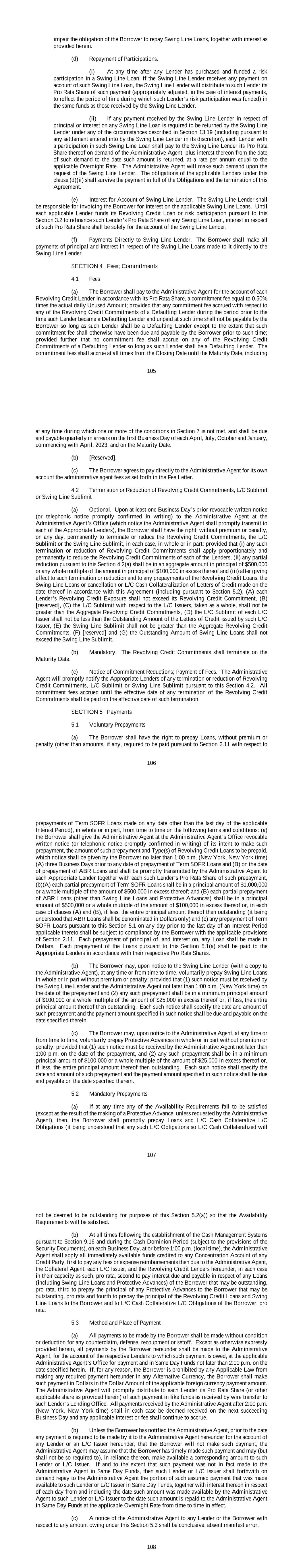 105 impair the obligation of the Borrower to repay Swing Line Loans, together with interest as provided herein. (d) Repayment of Participations. (i) At any time after any Lender has purchased and funded a risk participation in a Swing Line Loan, if the Swing Line Lender receives any payment on account of such Swing Line Loan, the Swing Line Lender will distribute to such Lender its Pro Rata Share of such payment (appropriately adjusted, in the case of interest payments, to reflect the period of time during which such Lender’s risk participation was funded) in the same funds as those received by the Swing Line Lender. (ii) If any payment received by the Swing Line Lender in respect of principal or interest on any Swing Line Loan is required to be returned by the Swing Line Lender under any of the circumstances described in Section 13.19 (including pursuant to any settlement entered into by the Swing Line Lender in its discretion), each Lender with a participation in such Swing Line Loan shall pay to the Swing Line Lender its Pro Rata Share thereof on demand of the Administrative Agent, plus interest thereon from the date of such demand to the date such amount is returned, at a rate per annum equal to the applicable Overnight Rate. The Administrative Agent will make such demand upon the request of the Swing Line Lender. The obligations of the applicable Lenders under this clause (d)(ii) shall survive the payment in full of the Obligations and the termination of this Agreement. (e) Interest for Account of Swing Line Lender. The Swing Line Lender shall be responsible for invoicing the Borrower for interest on the applicable Swing Line Loans. Until each applicable Lender funds its Revolving Credit Loan or risk participation pursuant to this Section 3.2 to refinance such Lender’s Pro Rata Share of any Swing Line Loan, interest in respect of such Pro Rata Share shall be solely for the account of the Swing Line Lender. (f) Payments Directly to Swing Line Lender. The Borrower shall make all payments of principal and interest in respect of the Swing Line Loans made to it directly to the Swing Line Lender. SECTION 4 Fees; Commitments 4.1 Fees (a) The Borrower shall pay to the Administrative Agent for the account of each Revolving Credit Lender in accordance with its Pro Rata Share, a commitment fee equal to 0.50% times the actual daily Unused Amount; provided that any commitment fee accrued with respect to any of the Revolving Credit Commitments of a Defaulting Lender during the period prior to the time such Lender became a Defaulting Lender and unpaid at such time shall not be payable by the Borrower so long as such Lender shall be a Defaulting Lender except to the extent that such commitment fee shall otherwise have been due and payable by the Borrower prior to such time; provided further that no commitment fee shall accrue on any of the Revolving Credit Commitments of a Defaulting Lender so long as such Lender shall be a Defaulting Lender. The commitment fees shall accrue at all times from the Closing Date until the Maturity Date, including 106 at any time during which one or more of the conditions in Section 7 is not met, and shall be due and payable quarterly in arrears on the first Business Day of each April, July, October and January, commencing with April, 2023, and on the Maturity Date. (b) [Reserved]. (c) The Borrower agrees to pay directly to the Administrative Agent for its own account the administrative agent fees as set forth in the Fee Letter. 4.2 Termination or Reduction of Revolving Credit Commitments, L/C Sublimit or Swing Line Sublimit (a) Optional. Upon at least one Business Day’s prior revocable written notice (or telephonic notice promptly confirmed in writing) to the Administrative Agent at the Administrative Agent’s Office (which notice the Administrative Agent shall promptly transmit to each of the Appropriate Lenders), the Borrower shall have the right, without premium or penalty, on any day, permanently to terminate or reduce the Revolving Credit Commitments, the L/C Sublimit or the Swing Line Sublimit, in each case, in whole or in part; provided that (i) any such termination or reduction of Revolving Credit Commitments shall apply proportionately and permanently to reduce the Revolving Credit Commitments of each of the Lenders, (ii) any partial reduction pursuant to this Section 4.2(a) shall be in an aggregate amount in principal of $500,000 or any whole multiple of the amount in principal of $100,000 in excess thereof and (iii) after giving effect to such termination or reduction and to any prepayments of the Revolving Credit Loans, the Swing Line Loans or cancellation or L/C Cash Collateralization of Letters of Credit made on the date thereof in accordance with this Agreement (including pursuant to Section 5.2), (A) each Lender’s Revolving Credit Exposure shall not exceed its Revolving Credit Commitment, (B) [reserved], (C) the L/C Sublimit with respect to the L/C Issuers, taken as a whole, shall not be greater than the Aggregate Revolving Credit Commitments, (D) the L/C Sublimit of each L/C Issuer shall not be less than the Outstanding Amount of the Letters of Credit issued by such L/C Issuer, (E) the Swing Line Sublimit shall not be greater than the Aggregate Revolving Credit Commitments, (F) [reserved] and (G) the Outstanding Amount of Swing Line Loans shall not exceed the Swing Line Sublimit. (b) Mandatory. The Revolving Credit Commitments shall terminate on the Maturity Date. (c) Notice of Commitment Reductions; Payment of Fees. The Administrative Agent will promptly notify the Appropriate Lenders of any termination or reduction of Revolving Credit Commitments, L/C Sublimit or Swing Line Sublimit pursuant to this Section 4.2. All commitment fees accrued until the effective date of any termination of the Revolving Credit Commitments shall be paid on the effective date of such termination. SECTION 5 Payments 5.1 Voluntary Prepayments (a) The Borrower shall
