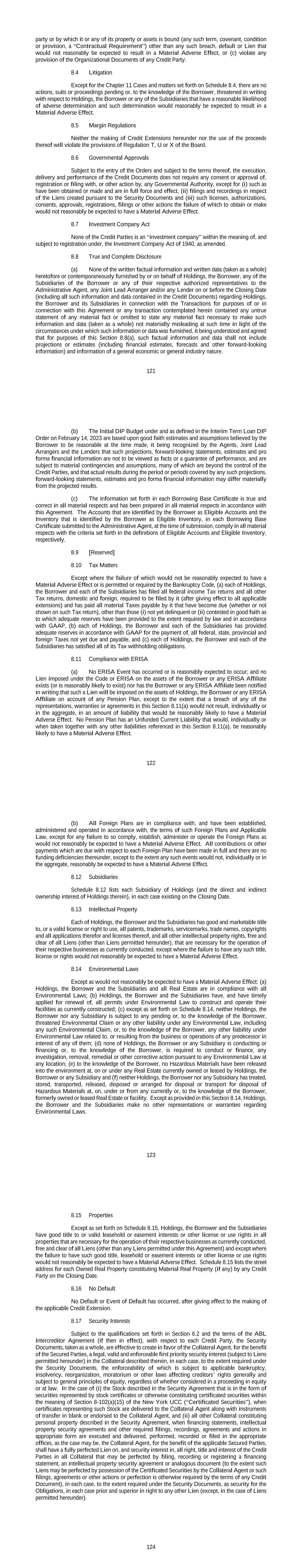 121 party or by which it or any of its property or assets is bound (any such term, covenant, condition or provision, a “Contractual Requirement”) other than any such breach, default or Lien that would not reasonably be expected to result in a Material Adverse Effect, or (c) violate any provision of the Organizational Documents of any Credit Party. 8.4 Litigation Except for the Chapter 11 Cases and matters set forth on Schedule 8.4, there are no actions, suits or proceedings pending or, to the knowledge of the Borrower, threatened in writing with respect to Holdings, the Borrower or any of the Subsidiaries that have a reasonable likelihood of adverse determination and such determination would reasonably be expected to result in a Material Adverse Effect. 8.5 Margin Regulations Neither the making of Credit Extensions hereunder nor the use of the proceeds thereof will violate the provisions of Regulation T, U or X of the Board. 8.6 Governmental Approvals Subject to the entry of the Orders and subject to the terms thereof, the execution, delivery and performance of the Credit Documents does not require any consent or approval of, registration or filing with, or other action by, any Governmental Authority, except for (i) such as have been obtained or made and are in full force and effect, (ii) filings and recordings in respect of the Liens created pursuant to the Security Documents and (iii) such licenses, authorizations, consents, approvals, registrations, filings or other actions the failure of which to obtain or make would not reasonably be expected to have a Material Adverse Effect. 8.7 Investment Company Act None of the Credit Parties is an “investment company” within the meaning of, and subject to registration under, the Investment Company Act of 1940, as amended. 8.8 True and Complete Disclosure (a) None of the written factual information and written data (taken as a whole) heretofore or contemporaneously furnished by or on behalf of Holdings, the Borrower, any of the Subsidiaries of the Borrower or any of their respective authorized representatives to the Administrative Agent, any Joint Lead Arranger and/or any Lender on or before the Closing Date (including all such information and data contained in the Credit Documents) regarding Holdings, the Borrower and its Subsidiaries in connection with the Transactions for purposes of or in connection with this Agreement or any transaction contemplated herein contained any untrue statement of any material fact or omitted to state any material fact necessary to make such information and data (taken as a whole) not materially misleading at such time in light of the circumstances under which such information or data was furnished, it being understood and agreed that for purposes of this Section 8.8(a), such factual information and data shall not include projections or estimates (including financial estimates, forecasts and other forward-looking information) and information of a general economic or general industry nature. 122 (b) The Initial DIP Budget under and as defined in the Interim Term Loan DIP Order on February 14, 2023 are based upon good faith estimates and assumptions believed by the Borrower to be reasonable at the time made, it being recognized by the Agents, Joint Lead Arrangers and the Lenders that such projections, forward-looking statements, estimates and pro forma financial information are not to be viewed as facts or a guarantee of performance, and are subject to material contingencies and assumptions, many of which are beyond the control of the Credit Parties, and that actual results during the period or periods covered by any such projections, forward-looking statements, estimates and pro forma financial information may differ materially from the projected results. (c) The information set forth in each Borrowing Base Certificate is true and correct in all material respects and has been prepared in all material respects in accordance with this Agreement. The Accounts that are identified by the Borrower as Eligible Accounts and the Inventory that is identified by the Borrower as Eligible Inventory, in each Borrowing Base Certificate submitted to the Administrative Agent, at the time of submission, comply in all material respects with the criteria set forth in the definitions of Eligible Accounts and Eligible Inventory, respectively. 8.9 [Reserved] 8.10 Tax Matters Except where the failure of which would not be reasonably expected to have a Material Adverse Effect or is permitted or required by the Bankruptcy Code, (a) each of Holdings, the Borrower and each of the Subsidiaries has filed all federal income Tax returns and all other Tax returns, domestic and foreign, required to be filed by it (after giving effect to all applicable extensions) and has paid all material Taxes payable by it that have become due (whether or not shown on such Tax return), other than those (i) not yet delinquent or (ii) contested in good faith as to which adequate reserves have been provided to the extent required by law and in accordance with GAAP, (b) each of Holdings, the Borrower and each of the Subsidiaries has provided adequate reserves in accordance with GAAP for the payment of, all federal, state, provincial and foreign Taxes not yet due and payable, and (c) each of Holdings, the Borrower and each of the Subsidiaries has satisfied all of its Tax withholding obligations. 8.11 Compliance with ERISA (a) No ERISA Event has occurred or is reasonably expected to occur; and no Lien imposed under the Code or ERISA on the assets of the Borrower or any ERISA Affiliate exists (or is reasonably likely to exist) nor has the Borrower or any ERISA Affiliate been notified in writing that such a Lien will be imposed on the assets of Holdings, the Borrower or any ERISA Affiliate on account of any Pension Plan, except to the extent that a breach of any of the representations, warranties or agreements in this Section 8.11(a) would not result, individually