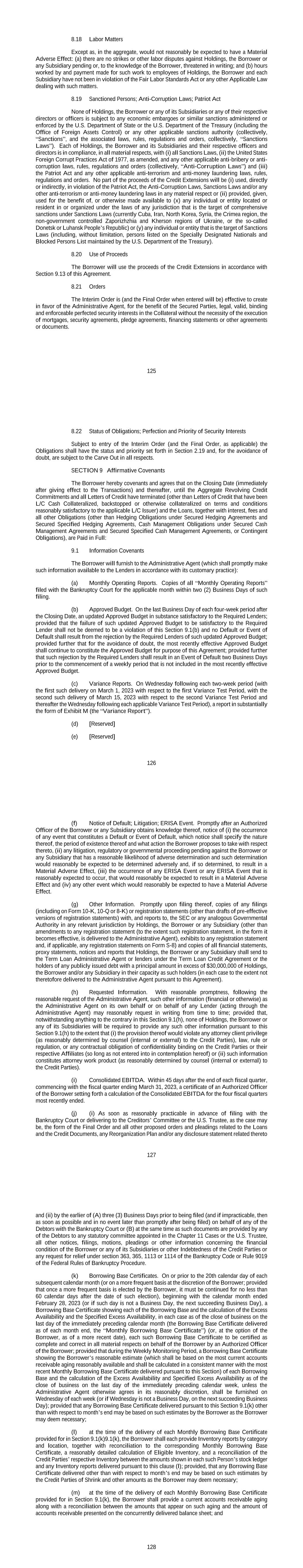125 8.18 Labor Matters Except as, in the aggregate, would not reasonably be expected to have a Material Adverse Effect: (a) there are no strikes or other labor disputes against Holdings, the Borrower or any Subsidiary pending or, to the knowledge of the Borrower, threatened in writing; and (b) hours worked by and payment made for such work to employees of Holdings, the Borrower and each Subsidiary have not been in violation of the Fair Labor Standards Act or any other Applicable Law dealing with such matters. 8.19 Sanctioned Persons; Anti-Corruption Laws; Patriot Act None of Holdings, the Borrower or any of its Subsidiaries or any of their respective directors or officers is subject to any economic embargoes or similar sanctions administered or enforced by the U.S. Department of State or the U.S. Department of the Treasury (including the Office of Foreign Assets Control) or any other applicable sanctions authority (collectively, “Sanctions”, and the associated laws, rules, regulations and orders, collectively, “Sanctions Laws”). Each of Holdings, the Borrower and its Subsidiaries and their respective officers and directors is in compliance, in all material respects, with (i) all Sanctions Laws, (ii) the United States Foreign Corrupt Practices Act of 1977, as amended, and any other applicable anti-bribery or anti- corruption laws, rules, regulations and orders (collectively, “Anti-Corruption Laws”) and (iii) the Patriot Act and any other applicable anti-terrorism and anti-money laundering laws, rules, regulations and orders. No part of the proceeds of the Credit Extensions will be (i) used, directly or indirectly, in violation of the Patriot Act, the Anti-Corruption Laws, Sanctions Laws and/or any other anti-terrorism or anti-money laundering laws in any material respect or (ii) provided, given, used for the benefit of, or otherwise made available to (x) any individual or entity located or resident in or organized under the laws of any jurisdiction that is the target of comprehensive sanctions under Sanctions Laws (currently Cuba, Iran, North Korea, Syria, the Crimea region, the non-government controlled Zaporizhzhia and Kherson regions of Ukraine, or the so-called Donetsk or Luhansk People’s Republic) or (y) any individual or entity that is the target of Sanctions Laws (including, without limitation, persons listed on the Specially Designated Nationals and Blocked Persons List maintained by the U.S. Department of the Treasury). 8.20 Use of Proceeds The Borrower will use the proceeds of the Credit Extensions in accordance with Section 9.13 of this Agreement. 8.21 Orders The Interim Order is (and the Final Order when entered will be) effective to create in favor of the Administrative Agent, for the benefit of the Secured Parties, legal, valid, binding and enforceable perfected security interests in the Collateral without the necessity of the execution of mortgages, security agreements, pledge agreements, financing statements or other agreements or documents. 126 8.22 Status of Obligations; Perfection and Priority of Security Interests Subject to entry of the Interim Order (and the Final Order, as applicable) the Obligations shall have the status and priority set forth in Section 2.19 and, for the avoidance of doubt, are subject to the Carve Out in all respects. SECTION 9 Affirmative Covenants The Borrower hereby covenants and agrees that on the Closing Date (immediately after giving effect to the Transactions) and thereafter, until the Aggregate Revolving Credit Commitments and all Letters of Credit have terminated (other than Letters of Credit that have been L/C Cash Collateralized, backstopped or otherwise collateralized on terms and conditions reasonably satisfactory to the applicable L/C Issuer) and the Loans, together with interest, fees and all other Obligations (other than Hedging Obligations under Secured Hedging Agreements and Secured Specified Hedging Agreements, Cash Management Obligations under Secured Cash Management Agreements and Secured Specified Cash Management Agreements, or Contingent Obligations), are Paid in Full: 9.1 Information Covenants The Borrower will furnish to the Administrative Agent (which shall promptly make such information available to the Lenders in accordance with its customary practice): (a) Monthly Operating Reports. Copies of all “Monthly Operating Reports” filed with the Bankruptcy Court for the applicable month within two (2) Business Days of such filing. (b) Approved Budget. On the last Business Day of each four-week period after the Closing Date, an updated Approved Budget in substance satisfactory to the Required Lenders; provided that the failure of such updated Approved Budget to be satisfactory to the Required Lender shall not be deemed to be a violation of this Section 9.1(b) and no Default or Event of Default shall result from the rejection by the Required Lenders of such updated Approved Budget; provided further that for the avoidance of doubt, the most recently effective Approved Budget shall continue to constitute the Approved Budget for purpose of this Agreement; provided further that such rejection by the Required Lenders shall result in an Event of Default two Business Days prior to the commencement of a weekly period that is not included in the most recently effective Approved Budget. (c) Variance Reports. On Wednesday following each two-week period (with the first such delivery on March 1, 2023 with respect to the first Variance Test Period, with the second such delivery of March 15, 2023 with respect to the second Variance Test Period and thereafter the Wednesday following each applicable Variance Test Period), a report in substantially the form of Exhibit M (the “Variance Report”). (d) [Reserved] (e) [Reserved] 127 (f) Notice of Default; Litigation; ERISA Event. Promptly after an Authorized Officer of the Borrower or any Subsidiary obtains knowledge thereof, notice of (i) the occurrence of any event that const