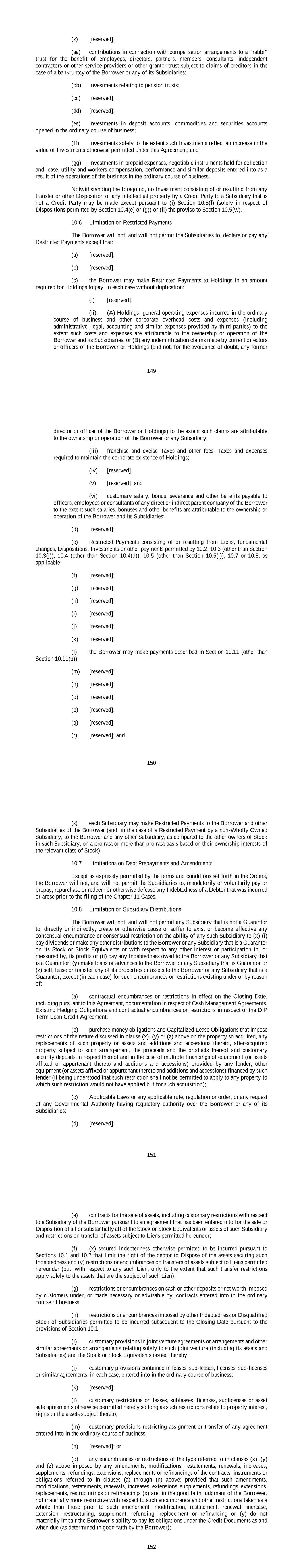 149 (z) [reserved]; (aa) contributions in connection with compensation arrangements to a “rabbi” trust for the benefit of employees, directors, partners, members, consultants, independent contractors or other service providers or other grantor trust subject to claims of creditors in the case of a bankruptcy of the Borrower or any of its Subsidiaries; (bb) Investments relating to pension trusts; (cc) [reserved]; (dd) [reserved]; (ee) Investments in deposit accounts, commodities and securities accounts opened in the ordinary course of business; (ff) Investments solely to the extent such Investments reflect an increase in the value of Investments otherwise permitted under this Agreement; and (gg) Investments in prepaid expenses, negotiable instruments held for collection and lease, utility and workers compensation, performance and similar deposits entered into as a result of the operations of the business in the ordinary course of business. Notwithstanding the foregoing, no Investment consisting of or resulting from any transfer or other Disposition of any intellectual property by a Credit Party to a Subsidiary that is not a Credit Party may be made except pursuant to (i) Section 10.5(l) (solely in respect of Dispositions permitted by Section 10.4(e) or (g)) or (ii) the proviso to Section 10.5(w). 10.6 Limitation on Restricted Payments The Borrower will not, and will not permit the Subsidiaries to, declare or pay any Restricted Payments except that: (a) [reserved]; (b) [reserved]; (c) the Borrower may make Restricted Payments to Holdings in an amount required for Holdings to pay, in each case without duplication: (i) [reserved]; (ii) (A) Holdings’ general operating expenses incurred in the ordinary course of business and other corporate overhead costs and expenses (including administrative, legal, accounting and similar expenses provided by third parties) to the extent such costs and expenses are attributable to the ownership or operation of the Borrower and its Subsidiaries, or (B) any indemnification claims made by current directors or officers of the Borrower or Holdings (and not, for the avoidance of doubt, any former 150 director or officer of the Borrower or Holdings) to the extent such claims are attributable to the ownership or operation of the Borrower or any Subsidiary; (iii) franchise and excise Taxes and other fees, Taxes and expenses required to maintain the corporate existence of Holdings; (iv) [reserved]; (v) [reserved]; and (vi) customary salary, bonus, severance and other benefits payable to officers, employees or consultants of any direct or indirect parent company of the Borrower to the extent such salaries, bonuses and other benefits are attributable to the ownership or operation of the Borrower and its Subsidiaries; (d) [reserved]; (e) Restricted Payments consisting of or resulting from Liens, fundamental changes, Dispositions, Investments or other payments permitted by 10.2, 10.3 (other than Section 10.3(j)), 10.4 (other than Section 10.4(d)), 10.5 (other than Section 10.5(l)), 10.7 or 10.8, as applicable; (f) [reserved]; (g) [reserved]; (h) [reserved]; (i) [reserved]; (j) [reserved]; (k) [reserved]; (l) the Borrower may make payments described in Section 10.11 (other than Section 10.11(b)); (m) [reserved]; (n) [reserved]; (o) [reserved]; (p) [reserved]; (q) [reserved]; (r) [reserved]; and 151 (s) each Subsidiary may make Restricted Payments to the Borrower and other Subsidiaries of the Borrower (and, in the case of a Restricted Payment by a non-Wholly Owned Subsidiary, to the Borrower and any other Subsidiary, as compared to the other owners of Stock in such Subsidiary, on a pro rata or more than pro rata basis based on their ownership interests of the relevant class of Stock). 10.7 Limitations on Debt Prepayments and Amendments Except as expressly permitted by the terms and conditions set forth in the Orders, the Borrower will not, and will not permit the Subsidiaries to, mandatorily or voluntarily pay or prepay, repurchase or redeem or otherwise defease any Indebtedness of a Debtor that was incurred or arose prior to the filing of the Chapter 11 Cases. 10.8 Limitation on Subsidiary Distributions The Borrower will not, and will not permit any Subsidiary that is not a Guarantor to, directly or indirectly, create or otherwise cause or suffer to exist or become effective any consensual encumbrance or consensual restriction on the ability of any such Subsidiary to (x) (i) pay dividends or make any other distributions to the Borrower or any Subsidiary that is a Guarantor on its Stock or Stock Equivalents or with respect to any other interest or participation in, or measured by, its profits or (ii) pay any Indebtedness owed to the Borrower or any Subsidiary that is a Guarantor, (y) make loans or advances to the Borrower or any Subsidiary that is Guarantor or (z) sell, lease or transfer any of its properties or assets to the Borrower or any Subsidiary that is a Guarantor, except (in each case) for such encumbrances or restrictions existing under or by reason of: (a) contractual encumbrances or restrictions in effect on the Closing Date, including pursuant to this Agreement, documentation in respect of Cash Management Agreements, Existing Hedging Obligations and contractual encumbrances or restrictions in respect of the DIP Term Loan Credit Agreement; (b) purchase money obligations and Capitalized Lease Obligations that impose restrictions of the nature discussed in clause (x), (y) or (z) above on the property so acquired, any replacements of such property or assets and additions and accessions thereto, after-acquired property subject to such arrangement, the proceeds and the products thereof and customary security deposits in respect thereof and in the case of multiple financings of equipment (or assets affixed or appurtenant thereto and additions and accessions) provided by any lender, other equipment (or assets affixed or appurtenant thereto and additions and access