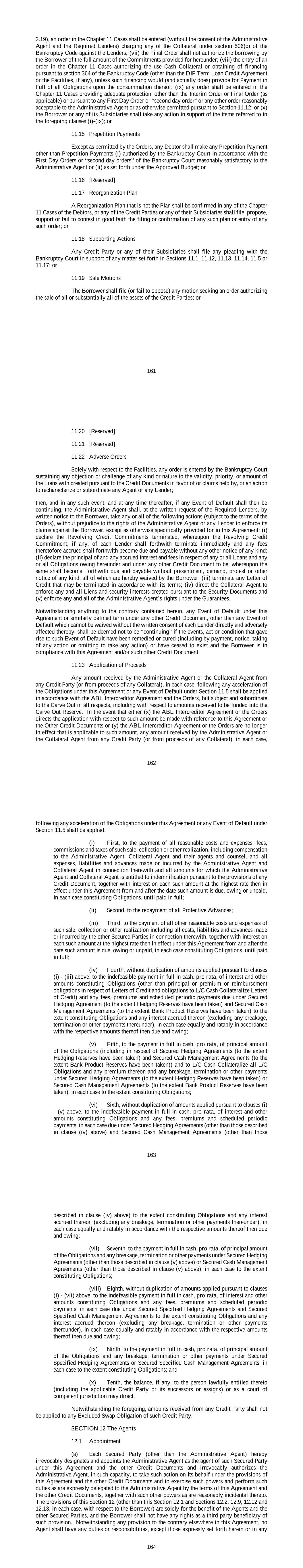 161 2.19), an order in the Chapter 11 Cases shall be entered (without the consent of the Administrative Agent and the Required Lenders) charging any of the Collateral under section 506(c) of the Bankruptcy Code against the Lenders; (vii) the Final Order shall not authorize the borrowing by the Borrower of the full amount of the Commitments provided for hereunder; (viii) the entry of an order in the Chapter 11 Cases authorizing the use Cash Collateral or obtaining of financing pursuant to section 364 of the Bankruptcy Code (other than the DIP Term Loan Credit Agreement or the Facilities, if any), unless such financing would (and actually does) provide for Payment in Full of all Obligations upon the consummation thereof; (ix) any order shall be entered in the Chapter 11 Cases providing adequate protection, other than the Interim Order or Final Order (as applicable) or pursuant to any First Day Order or “second day order” or any other order reasonably acceptable to the Administrative Agent or as otherwise permitted pursuant to Section 11.12; or (x) the Borrower or any of its Subsidiaries shall take any action in support of the items referred to in the foregoing clauses (i)-(ix); or 11.15 Prepetition Payments Except as permitted by the Orders, any Debtor shall make any Prepetition Payment other than Prepetition Payments (i) authorized by the Bankruptcy Court in accordance with the First Day Orders or “second day orders” of the Bankruptcy Court reasonably satisfactory to the Administrative Agent or (ii) as set forth under the Approved Budget; or 11.16 [Reserved] 11.17 Reorganization Plan A Reorganization Plan that is not the Plan shall be confirmed in any of the Chapter 11 Cases of the Debtors, or any of the Credit Parties or any of their Subsidiaries shall file, propose, support or fail to contest in good faith the filing or confirmation of any such plan or entry of any such order; or 11.18 Supporting Actions Any Credit Party or any of their Subsidiaries shall file any pleading with the Bankruptcy Court in support of any matter set forth in Sections 11.1, 11.12, 11.13, 11.14, 11.5 or 11.17; or 11.19 Sale Motions The Borrower shall file (or fail to oppose) any motion seeking an order authorizing the sale of all or substantially all of the assets of the Credit Parties; or 162 11.20 [Reserved] 11.21 [Reserved] 11.22 Adverse Orders Solely with respect to the Facilities, any order is entered by the Bankruptcy Court sustaining any objection or challenge of any kind or nature to the validity, priority, or amount of the Liens with created pursuant to the Credit Documents in favor of or claims held by, or an action to recharacterize or subordinate any Agent or any Lender; then, and in any such event, and at any time thereafter, if any Event of Default shall then be continuing, the Administrative Agent shall, at the written request of the Required Lenders, by written notice to the Borrower, take any or all of the following actions (subject to the terms of the Orders), without prejudice to the rights of the Administrative Agent or any Lender to enforce its claims against the Borrower, except as otherwise specifically provided for in this Agreement: (i) declare the Revolving Credit Commitments terminated, whereupon the Revolving Credit Commitment, if any, of each Lender shall forthwith terminate immediately and any fees theretofore accrued shall forthwith become due and payable without any other notice of any kind; (ii) declare the principal of and any accrued interest and fees in respect of any or all Loans and any or all Obligations owing hereunder and under any other Credit Document to be, whereupon the same shall become, forthwith due and payable without presentment, demand, protest or other notice of any kind, all of which are hereby waived by the Borrower; (iii) terminate any Letter of Credit that may be terminated in accordance with its terms; (iv) direct the Collateral Agent to enforce any and all Liens and security interests created pursuant to the Security Documents and (v) enforce any and all of the Administrative Agent’s rights under the Guarantees. Notwithstanding anything to the contrary contained herein, any Event of Default under this Agreement or similarly defined term under any other Credit Document, other than any Event of Default which cannot be waived without the written consent of each Lender directly and adversely affected thereby, shall be deemed not to be “continuing” if the events, act or condition that gave rise to such Event of Default have been remedied or cured (including by payment, notice, taking of any action or omitting to take any action) or have ceased to exist and the Borrower is in compliance with this Agreement and/or such other Credit Document. 11.23 Application of Proceeds Any amount received by the Administrative Agent or the Collateral Agent from any Credit Party (or from proceeds of any Collateral), in each case, following any acceleration of the Obligations under this Agreement or any Event of Default under Section 11.5 shall be applied in accordance with the ABL Intercreditor Agreement and the Orders, but subject and subordinate to the Carve Out in all respects, including with respect to amounts received to be funded into the Carve Out Reserve. In the event that either (x) the ABL Intercreditor Agreement or the Orders directs the application with respect to such amount be made with reference to this Agreement or the Other Credit Documents or (y) the ABL Intercreditor Agreement or the Orders are no longer in effect that is applicable to such amount, any amount received by the Administrative Agent or the Collateral Agent from any Credit Party (or from proceeds of any Collateral), in each case, 163 following any acceleration of the Obligations under this Agreement or any Event of Default under Section 11.5 shall be applied: (i) First, to the payment of all reasonable costs and expenses, fees, commissions and taxes of such sale, collection or other