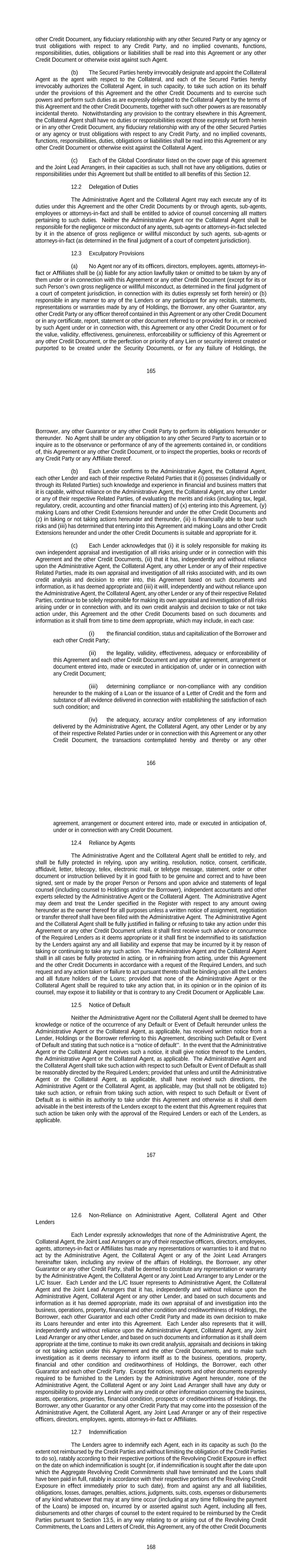 iv 9.19 Appraisals and Field Examinations .................................................................... 138 9.20 Repayment of Certain Obligations ...................................................................... 138 SECTION 10 Negative Covenants ....................................................................................................... 139 10.1 Limitation on Indebtedness ................................................................................. 139 10.2 Limitation on Liens ............................................................................................. 142 10.3 Limitation on Fundamental Changes .................................................................. 143 10.4 Limitation on Disposition ................................................................................... 144 10.5 Limitation on Investments .................................................................................. 147 10.6 Limitation on Restricted Payments ..................................................................... 149 10.7 Limitations on Debt Prepayments and Amendments.......................................... 151 10.8 Limitation on Subsidiary Distributions ............................................................... 151 10.9 Amendment of Organizational Documents ........................................................ 153 10.10 Permitted Activities and Transfer to Parent Companies ..................................... 153 10.11 Transactions with Affiliates ................................................................................ 153 10.12 Permitted Variance.............................................................................................. 154 10.13 Intercompany Limitations ................................................................................... 155 10.14 Bankruptcy Matters ............................................................................................. 155 10.15 Financial Covenant ............................................................................................. 156 SECTION 11 Events of Default ........................................................................................................... 156 11.1 Payments ............................................................................................................. 157 11.2 Representations, Etc. ........................................................................................... 157 11.3 Covenants ............................................................................................................ 157 11.4 Default Under Other Agreements ....................................................................... 157 11.5 Bankruptcy .......................................................................................................... 158 11.6 ERISA ................................................................................................................. 159 11.7 Guarantee ............................................................................................................ 159 11.8 Security Agreement ............................................................................................ 159 11.9 Judgments ........................................................................................................... 159 11.10 Change of Control ............................................................................................... 159 11.11 Dismissal; Conversion ........................................................................................ 159 11.12 Superpriority Claims ........................................................................................... 160 11.13 Stay Relief ........................................................................................................... 160 11.14 Orders; Actions ................................................................................................... 160 11.15 Prepetition Payments .......................................................................................... 161 11.16 [Reserved] ........................................................................................................... 161 11.17 Reorganization Plan ............................................................................................ 161 11.18 Supporting Actions ............................................................................................. 161 11.19 Sale Motions ....................................................................................................... 161 11.20 [Reserved] ........................................................................................................... 162 11.21 [Reserved] ........................................................................................................... 162 11.22 Adverse Orders ................................................................................................... 162 11.23 Application of Proceeds ...................................................................................... 162 SECTION 12 The Agents ..................................................................................................................... 164 12.1 Appointment ....................................................................................................... 164 v 12.2 Delegation of Duties ........................................................................................... 165 12.3 Exculpatory Provisions ....................................................................................... 165 12.4 Reliance by Agents ............................................................................................. 167 12.5 Notice of Default................................................................................................. 167 12.6 Non-Reliance on Administrative Agent, Collateral Agent and Other Lenders ........................................................
