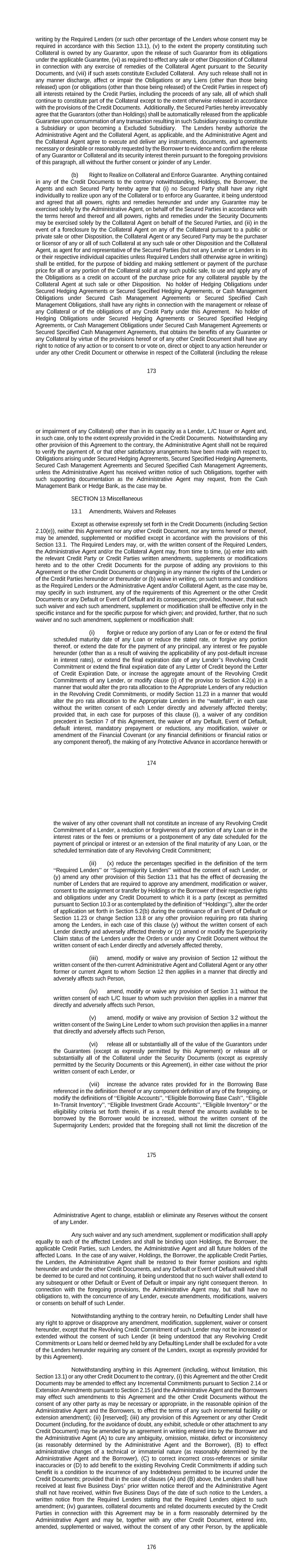153 provided that (x) the priority of any preferred stock in receiving dividends or liquidating distributions prior to dividends or liquidating distributions being paid on common stock and (y) the subordination of (including the application of any standstill requirements to) loans or advances made to the Borrower or any Subsidiary that is a Guarantor to other Indebtedness incurred by the Borrower or any Subsidiary that is a Guarantor shall not be deemed to constitute such an encumbrance or restriction. 10.9 Amendment of Organizational Documents The Borrower will not, nor will the Borrower permit any Credit Party to, amend or otherwise modify any of its Organizational Documents in a manner that is materially adverse to the Lenders, except as required by Applicable Laws. 10.10 Permitted Activities and Transfer to Parent Companies Holdings will not engage in any material operating or business activities; provided that the following and any activities incidental thereto shall be permitted in any event: (i) its ownership of the Stock of the Borrower (but no other direct Subsidiaries), including receipt and payment of dividends and payments in respect of Indebtedness and other amounts in respect of Stock, (ii) the maintenance of its legal existence (including the ability to incur and pay, as applicable, fees, costs and expenses and taxes relating to such maintenance), (iii) the performance of its obligations with respect to the Transactions, the Credit Documents and any other documents governing Indebtedness permitted hereby, (iv) [reserved], (v) financing activities, including the issuance of securities, incurrence of debt, receipt and payment of dividends and distributions, making contributions to the capital of the Borrower and guaranteeing the obligations of the Borrower and the Subsidiaries, (vi) if applicable, participating in tax, accounting and other administrative matters as a member of the consolidated group and the provision of administrative and advisory services (including treasury and insurance services) to its Subsidiaries of a type customarily provided by a holding company to its Subsidiaries, (vii) holding any cash or other property (but not operate any property), (viii) making and receiving of any dividends, payments in respect of Indebtedness or Investments permitted hereunder, (ix) providing indemnification to officers and directors, (x) [reserved], (xi) activities related to the consummation of the Transactions and activities contemplated thereby, (xii) [reserved], (xiii) [reserved], (xiv) [reserved], (xv) any transaction with the Borrower or any Subsidiary to the extent expressly permitted under this Section 10, (xvi) [reserved], (xvii) paying any Taxes it is obligated to pay, (xviii) [reserved] and (xix) any activities incidental or reasonably related to the foregoing. 10.11 Transactions with Affiliates The Borrower will not conduct, nor will the Borrower permit any Subsidiary to, enter into any transaction of any kind with any Affiliate of the Borrower, whether or not in the ordinary course of business, other than: (a) transactions (i) between or among Credit Parties, (ii) between or among Subsidiaries that are not Credit Parties or (iii) between a Credit Party and a Subsidiary that is not a Credit Party in the ordinary course of business; 154 (b) transactions permitted by Section 10.5 or Section 10.6 (other than Section 10.6(m)); (c) transactions on terms substantially as favorable to the Borrower or such Subsidiary as would reasonably be obtainable by the Borrower or such Subsidiary at the time in a comparable arm’s-length transaction with a Person other than an Affiliate; (d) [reserved]; (e) (i) employment, consulting and severance arrangements between the Borrower and the Subsidiaries (or any direct or indirect parent of the Borrower) and their respective officers, employees, directors or consultants in the ordinary course of business (including payments, loans and advances in connection therewith) and (ii) issuances of securities, or other payments, awards or grants in cash, securities or otherwise and other transactions pursuant to any equityholder, employee or director equity plan or stock or other equity option plan or any other management or employee benefit plan or agreement, other compensatory arrangement or any stock or other equity subscription, co-invest or equityholder agreement; (f) the payment of customary fees and reasonable out of pocket costs to, and indemnities provided on behalf of, directors, managers, consultants, officers and employees of the Borrower (or, to the extent attributable to the ownership of the Borrower and its Subsidiaries, any direct or indirect parent thereof) and the Subsidiaries of the Borrower; (g) [reserved]; (h) [reserved]; (i) transactions pursuant to permitted agreements in existence on the Closing Date and set forth on Schedule 10.11; (j) [reserved]; (k) [reserved]; or (l) to the extent covered thereby, affiliate transactions authorized or approved pursuant to (i) the Interim Order, and, when applicable, the Final Order, or any First Day Order or (ii) any other order entered by the Bankruptcy Court without the objection of the Administrative Agent or the Required Lenders; provided, for the avoidance of doubt, that such objection need not be filed with the Bankruptcy Court. 10.12 Permitted Variance Subject to the Permitted Variance, permit actual “total receipts” to exceed, or “operating disbursements” to be less than, for any Variance Test Period, total receipts or operating disbursements projected in the Approved Budget for such Variance Test Period to be determined on a bi-weekly basis. 155 10.13 Intercompany Limitations (a) Notwithstanding anything herein to the contrary and without limiting any other covenant contained herein, no credit support, guarantee, cash and/or Cash Equivalents (in each case, including proceeds of the loans made pursuant to the Facilities or the DIP Term Loan Credit Agreement, Cash Col