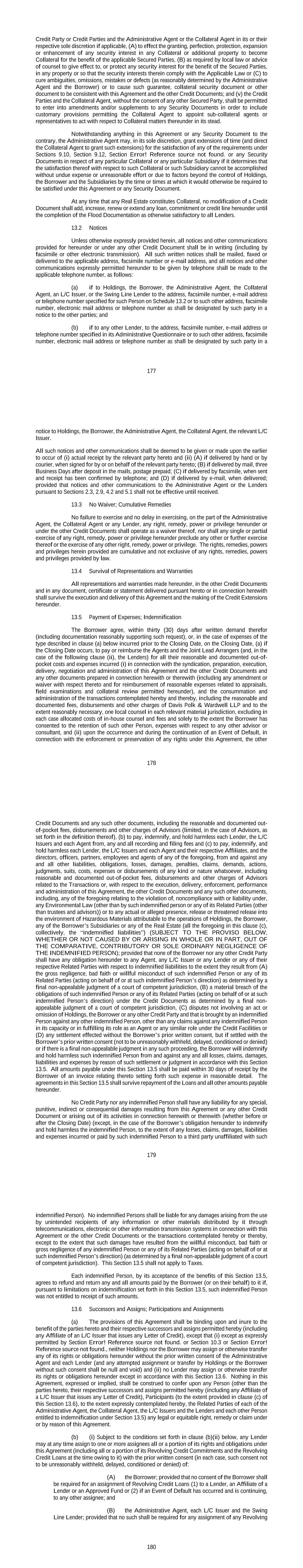 177 Credit Party or Credit Parties and the Administrative Agent or the Collateral Agent in its or their respective sole discretion if applicable, (A) to effect the granting, perfection, protection, expansion or enhancement of any security interest in any Collateral or additional property to become Collateral for the benefit of the applicable Secured Parties, (B) as required by local law or advice of counsel to give effect to, or protect any security interest for the benefit of the Secured Parties, in any property or so that the security interests therein comply with the Applicable Law or (C) to cure ambiguities, omissions, mistakes or defects (as reasonably determined by the Administrative Agent and the Borrower) or to cause such guarantee, collateral security document or other document to be consistent with this Agreement and the other Credit Documents; and (v) the Credit Parties and the Collateral Agent, without the consent of any other Secured Party, shall be permitted to enter into amendments and/or supplements to any Security Documents in order to include customary provisions permitting the Collateral Agent to appoint sub-collateral agents or representatives to act with respect to Collateral matters thereunder in its stead. Notwithstanding anything in this Agreement or any Security Document to the contrary, the Administrative Agent may, in its sole discretion, grant extensions of time (and direct the Collateral Agent to grant such extensions) for the satisfaction of any of the requirements under Sections 9.10, Section 9.12, Section Error! Reference source not found. or any Security Documents in respect of any particular Collateral or any particular Subsidiary if it determines that the satisfaction thereof with respect to such Collateral or such Subsidiary cannot be accomplished without undue expense or unreasonable effort or due to factors beyond the control of Holdings, the Borrower and the Subsidiaries by the time or times at which it would otherwise be required to be satisfied under this Agreement or any Security Document. At any time that any Real Estate constitutes Collateral, no modification of a Credit Document shall add, increase, renew or extend any loan, commitment or credit line hereunder until the completion of the Flood Documentation as otherwise satisfactory to all Lenders. 13.2 Notices Unless otherwise expressly provided herein, all notices and other communications provided for hereunder or under any other Credit Document shall be in writing (including by facsimile or other electronic transmission). All such written notices shall be mailed, faxed or delivered to the applicable address, facsimile number or e-mail address, and all notices and other communications expressly permitted hereunder to be given by telephone shall be made to the applicable telephone number, as follows: (a) if to Holdings, the Borrower, the Administrative Agent, the Collateral Agent, an L/C Issuer, or the Swing Line Lender to the address, facsimile number, e-mail address or telephone number specified for such Person on Schedule 13.2 or to such other address, facsimile number, electronic mail address or telephone number as shall be designated by such party in a notice to the other parties; and (b) if to any other Lender, to the address, facsimile number, e-mail address or telephone number specified in its Administrative Questionnaire or to such other address, facsimile number, electronic mail address or telephone number as shall be designated by such party in a 178 notice to Holdings, the Borrower, the Administrative Agent, the Collateral Agent, the relevant L/C Issuer. All such notices and other communications shall be deemed to be given or made upon the earlier to occur of (i) actual receipt by the relevant party hereto and (ii) (A) if delivered by hand or by courier, when signed for by or on behalf of the relevant party hereto; (B) if delivered by mail, three Business Days after deposit in the mails, postage prepaid; (C) if delivered by facsimile, when sent and receipt has been confirmed by telephone; and (D) if delivered by e-mail, when delivered; provided that notices and other communications to the Administrative Agent or the Lenders pursuant to Sections 2.3, 2.9, 4.2 and 5.1 shall not be effective until received. 13.3 No Waiver; Cumulative Remedies No failure to exercise and no delay in exercising, on the part of the Administrative Agent, the Collateral Agent or any Lender, any right, remedy, power or privilege hereunder or under the other Credit Documents shall operate as a waiver thereof, nor shall any single or partial exercise of any right, remedy, power or privilege hereunder preclude any other or further exercise thereof or the exercise of any other right, remedy, power or privilege. The rights, remedies, powers and privileges herein provided are cumulative and not exclusive of any rights, remedies, powers and privileges provided by law. 13.4 Survival of Representations and Warranties All representations and warranties made hereunder, in the other Credit Documents and in any document, certificate or statement delivered pursuant hereto or in connection herewith shall survive the execution and delivery of this Agreement and the making of the Credit Extensions hereunder. 13.5 Payment of Expenses; Indemnification The Borrower agree, within thirty (30) days after written demand therefor (including documentation reasonably supporting such request), or, in the case of expenses of the type described in clause (a) below incurred prior to the Closing Date, on the Closing Date, (a) if the Closing Date occurs, to pay or reimburse the Agents and the Joint Lead Arrangers (and, in the case of the following clause (ii), the Lenders) for all their reasonable and documented out-of- pocket costs and expenses incurred (i) in connection with the syndication, preparation, execution, delivery, negotiation and administration of this Agreement and the other Credit Documents and any other documents prepared i
