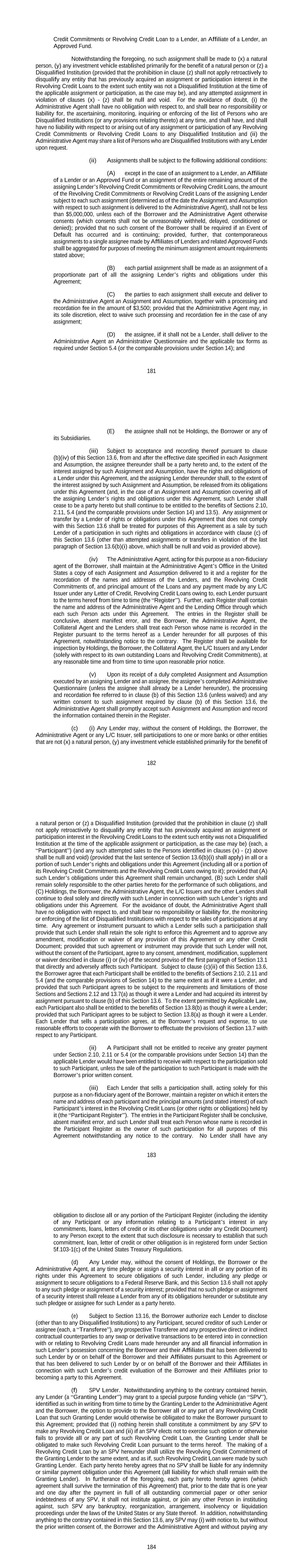 181 Credit Commitments or Revolving Credit Loan to a Lender, an Affiliate of a Lender, an Approved Fund. Notwithstanding the foregoing, no such assignment shall be made to (x) a natural person, (y) any investment vehicle established primarily for the benefit of a natural person or (z) a Disqualified Institution (provided that the prohibition in clause (z) shall not apply retroactively to disqualify any entity that has previously acquired an assignment or participation interest in the Revolving Credit Loans to the extent such entity was not a Disqualified Institution at the time of the applicable assignment or participation, as the case may be), and any attempted assignment in violation of clauses (x) - (z) shall be null and void. For the avoidance of doubt, (i) the Administrative Agent shall have no obligation with respect to, and shall bear no responsibility or liability for, the ascertaining, monitoring, inquiring or enforcing of the list of Persons who are Disqualified Institutions (or any provisions relating thereto) at any time, and shall have, and shall have no liability with respect to or arising out of any assignment or participation of any Revolving Credit Commitments or Revolving Credit Loans to any Disqualified Institution and (ii) the Administrative Agent may share a list of Persons who are Disqualified Institutions with any Lender upon request. (ii) Assignments shall be subject to the following additional conditions: (A) except in the case of an assignment to a Lender, an Affiliate of a Lender or an Approved Fund or an assignment of the entire remaining amount of the assigning Lender’s Revolving Credit Commitments or Revolving Credit Loans, the amount of the Revolving Credit Commitments or Revolving Credit Loans of the assigning Lender subject to each such assignment (determined as of the date the Assignment and Assumption with respect to such assignment is delivered to the Administrative Agent), shall not be less than $5,000,000, unless each of the Borrower and the Administrative Agent otherwise consents (which consents shall not be unreasonably withheld, delayed, conditioned or denied); provided that no such consent of the Borrower shall be required if an Event of Default has occurred and is continuing; provided, further, that contemporaneous assignments to a single assignee made by Affiliates of Lenders and related Approved Funds shall be aggregated for purposes of meeting the minimum assignment amount requirements stated above; (B) each partial assignment shall be made as an assignment of a proportionate part of all the assigning Lender’s rights and obligations under this Agreement; (C) the parties to each assignment shall execute and deliver to the Administrative Agent an Assignment and Assumption, together with a processing and recordation fee in the amount of $3,500; provided that the Administrative Agent may, in its sole discretion, elect to waive such processing and recordation fee in the case of any assignment; (D) the assignee, if it shall not be a Lender, shall deliver to the Administrative Agent an Administrative Questionnaire and the applicable tax forms as required under Section 5.4 (or the comparable provisions under Section 14); and 182 (E) the assignee shall not be Holdings, the Borrower or any of its Subsidiaries. (iii) Subject to acceptance and recording thereof pursuant to clause (b)(iv) of this Section 13.6, from and after the effective date specified in each Assignment and Assumption, the assignee thereunder shall be a party hereto and, to the extent of the interest assigned by such Assignment and Assumption, have the rights and obligations of a Lender under this Agreement, and the assigning Lender thereunder shall, to the extent of the interest assigned by such Assignment and Assumption, be released from its obligations under this Agreement (and, in the case of an Assignment and Assumption covering all of the assigning Lender’s rights and obligations under this Agreement, such Lender shall cease to be a party hereto but shall continue to be entitled to the benefits of Sections 2.10, 2.11, 5.4 (and the comparable provisions under Section 14) and 13.5). Any assignment or transfer by a Lender of rights or obligations under this Agreement that does not comply with this Section 13.6 shall be treated for purposes of this Agreement as a sale by such Lender of a participation in such rights and obligations in accordance with clause (c) of this Section 13.6 (other than attempted assignments or transfers in violation of the last paragraph of Section 13.6(b)(i) above, which shall be null and void as provided above). (iv) The Administrative Agent, acting for this purpose as a non-fiduciary agent of the Borrower, shall maintain at the Administrative Agent’s Office in the United States a copy of each Assignment and Assumption delivered to it and a register for the recordation of the names and addresses of the Lenders, and the Revolving Credit Commitments of, and principal amount of the Loans and any payment made by any L/C Issuer under any Letter of Credit, Revolving Credit Loans owing to, each Lender pursuant to the terms hereof from time to time (the “Register”). Further, each Register shall contain the name and address of the Administrative Agent and the Lending Office through which each such Person acts under this Agreement. The entries in the Register shall be conclusive, absent manifest error, and the Borrower, the Administrative Agent, the Collateral Agent and the Lenders shall treat each Person whose name is recorded in the Register pursuant to the terms hereof as a Lender hereunder for all purposes of this Agreement, notwithstanding notice to the contrary. The Register shall be available for inspection by Holdings, the Borrower, the Collateral Agent, the L/C Issuers and any Lender (solely with respect to its own outstanding Loans and Revolving Credit Commitments), at any reasonable time and from time to time upon reasonable prior notice. (v) Up