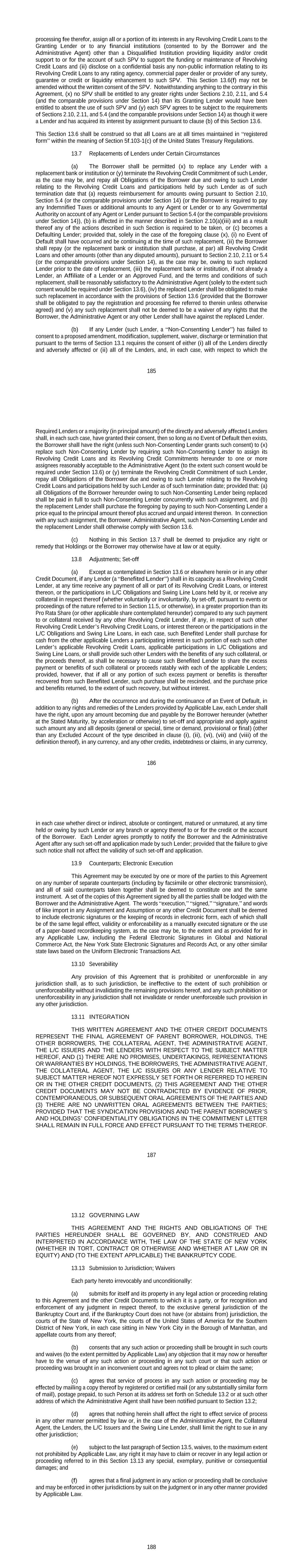 185 processing fee therefor, assign all or a portion of its interests in any Revolving Credit Loans to the Granting Lender or to any financial institutions (consented to by the Borrower and the Administrative Agent) other than a Disqualified Institution providing liquidity and/or credit support to or for the account of such SPV to support the funding or maintenance of Revolving Credit Loans and (ii) disclose on a confidential basis any non-public information relating to its Revolving Credit Loans to any rating agency, commercial paper dealer or provider of any surety, guarantee or credit or liquidity enhancement to such SPV. This Section 13.6(f) may not be amended without the written consent of the SPV. Notwithstanding anything to the contrary in this Agreement, (x) no SPV shall be entitled to any greater rights under Sections 2.10, 2.11, and 5.4 (and the comparable provisions under Section 14) than its Granting Lender would have been entitled to absent the use of such SPV and (y) each SPV agrees to be subject to the requirements of Sections 2.10, 2.11, and 5.4 (and the comparable provisions under Section 14) as though it were a Lender and has acquired its interest by assignment pursuant to clause (b) of this Section 13.6. This Section 13.6 shall be construed so that all Loans are at all times maintained in “registered form” within the meaning of Section 5f.103-1(c) of the United States Treasury Regulations. 13.7 Replacements of Lenders under Certain Circumstances (a) The Borrower shall be permitted (x) to replace any Lender with a replacement bank or institution or (y) terminate the Revolving Credit Commitment of such Lender, as the case may be, and repay all Obligations of the Borrower due and owing to such Lender relating to the Revolving Credit Loans and participations held by such Lender as of such termination date that (a) requests reimbursement for amounts owing pursuant to Section 2.10, Section 5.4 (or the comparable provisions under Section 14) (or the Borrower is required to pay any Indemnified Taxes or additional amounts to any Agent or Lender or to any Governmental Authority on account of any Agent or Lender pursuant to Section 5.4 (or the comparable provisions under Section 14)), (b) is affected in the manner described in Section 2.10(a)(iii) and as a result thereof any of the actions described in such Section is required to be taken, or (c) becomes a Defaulting Lender; provided that, solely in the case of the foregoing clause (x), (i) no Event of Default shall have occurred and be continuing at the time of such replacement, (ii) the Borrower shall repay (or the replacement bank or institution shall purchase, at par) all Revolving Credit Loans and other amounts (other than any disputed amounts), pursuant to Section 2.10, 2.11 or 5.4 (or the comparable provisions under Section 14), as the case may be, owing to such replaced Lender prior to the date of replacement, (iii) the replacement bank or institution, if not already a Lender, an Affiliate of a Lender or an Approved Fund, and the terms and conditions of such replacement, shall be reasonably satisfactory to the Administrative Agent (solely to the extent such consent would be required under Section 13.6), (iv) the replaced Lender shall be obligated to make such replacement in accordance with the provisions of Section 13.6 (provided that the Borrower shall be obligated to pay the registration and processing fee referred to therein unless otherwise agreed) and (v) any such replacement shall not be deemed to be a waiver of any rights that the Borrower, the Administrative Agent or any other Lender shall have against the replaced Lender. (b) If any Lender (such Lender, a “Non-Consenting Lender”) has failed to consent to a proposed amendment, modification, supplement, waiver, discharge or termination that pursuant to the terms of Section 13.1 requires the consent of either (i) all of the Lenders directly and adversely affected or (ii) all of the Lenders, and, in each case, with respect to which the 186 Required Lenders or a majority (in principal amount) of the directly and adversely affected Lenders shall, in each such case, have granted their consent, then so long as no Event of Default then exists, the Borrower shall have the right (unless such Non-Consenting Lender grants such consent) to (x) replace such Non-Consenting Lender by requiring such Non-Consenting Lender to assign its Revolving Credit Loans and its Revolving Credit Commitments hereunder to one or more assignees reasonably acceptable to the Administrative Agent (to the extent such consent would be required under Section 13.6) or (y) terminate the Revolving Credit Commitment of such Lender, repay all Obligations of the Borrower due and owing to such Lender relating to the Revolving Credit Loans and participations held by such Lender as of such termination date; provided that: (a) all Obligations of the Borrower hereunder owing to such Non-Consenting Lender being replaced shall be paid in full to such Non-Consenting Lender concurrently with such assignment, and (b) the replacement Lender shall purchase the foregoing by paying to such Non-Consenting Lender a price equal to the principal amount thereof plus accrued and unpaid interest thereon. In connection with any such assignment, the Borrower, Administrative Agent, such Non-Consenting Lender and the replacement Lender shall otherwise comply with Section 13.6. (c) Nothing in this Section 13.7 shall be deemed to prejudice any right or remedy that Holdings or the Borrower may otherwise have at law or at equity. 13.8 Adjustments; Set-off (a) Except as contemplated in Section 13.6 or elsewhere herein or in any other Credit Document, if any Lender (a “Benefited Lender”) shall in its capacity as a Revolving Credit Lender, at any time receive any payment of all or part of its Revolving Credit Loans, or interest thereon, or the participations in L/C Obligations and Swing Line Loans held by it, or receive any coll