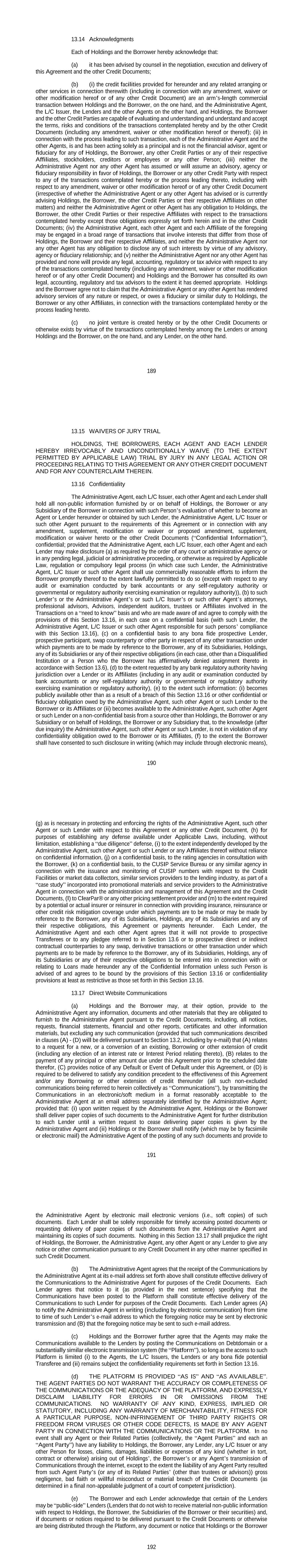 189 13.14 Acknowledgments Each of Holdings and the Borrower hereby acknowledge that: (a) it has been advised by counsel in the negotiation, execution and delivery of this Agreement and the other Credit Documents; (b) (i) the credit facilities provided for hereunder and any related arranging or other services in connection therewith (including in connection with any amendment, waiver or other modification hereof or of any other Credit Document) are an arm’s-length commercial transaction between Holdings and the Borrower, on the one hand, and the Administrative Agent, the L/C Issuer, the Lenders and the other Agents on the other hand, and Holdings, the Borrower and the other Credit Parties are capable of evaluating and understanding and understand and accept the terms, risks and conditions of the transactions contemplated hereby and by the other Credit Documents (including any amendment, waiver or other modification hereof or thereof); (ii) in connection with the process leading to such transaction, each of the Administrative Agent and the other Agents, is and has been acting solely as a principal and is not the financial advisor, agent or fiduciary for any of Holdings, the Borrower, any other Credit Parties or any of their respective Affiliates, stockholders, creditors or employees or any other Person; (iii) neither the Administrative Agent nor any other Agent has assumed or will assume an advisory, agency or fiduciary responsibility in favor of Holdings, the Borrower or any other Credit Party with respect to any of the transactions contemplated hereby or the process leading thereto, including with respect to any amendment, waiver or other modification hereof or of any other Credit Document (irrespective of whether the Administrative Agent or any other Agent has advised or is currently advising Holdings, the Borrower, the other Credit Parties or their respective Affiliates on other matters) and neither the Administrative Agent or other Agent has any obligation to Holdings, the Borrower, the other Credit Parties or their respective Affiliates with respect to the transactions contemplated hereby except those obligations expressly set forth herein and in the other Credit Documents; (iv) the Administrative Agent, each other Agent and each Affiliate of the foregoing may be engaged in a broad range of transactions that involve interests that differ from those of Holdings, the Borrower and their respective Affiliates, and neither the Administrative Agent nor any other Agent has any obligation to disclose any of such interests by virtue of any advisory, agency or fiduciary relationship; and (v) neither the Administrative Agent nor any other Agent has provided and none will provide any legal, accounting, regulatory or tax advice with respect to any of the transactions contemplated hereby (including any amendment, waiver or other modification hereof or of any other Credit Document) and Holdings and the Borrower has consulted its own legal, accounting, regulatory and tax advisors to the extent it has deemed appropriate. Holdings and the Borrower agree not to claim that the Administrative Agent or any other Agent has rendered advisory services of any nature or respect, or owes a fiduciary or similar duty to Holdings, the Borrower or any other Affiliates, in connection with the transactions contemplated hereby or the process leading hereto. (c) no joint venture is created hereby or by the other Credit Documents or otherwise exists by virtue of the transactions contemplated hereby among the Lenders or among Holdings and the Borrower, on the one hand, and any Lender, on the other hand. 190 13.15 WAIVERS OF JURY TRIAL HOLDINGS, THE BORROWERS, EACH AGENT AND EACH LENDER HEREBY IRREVOCABLY AND UNCONDITIONALLY WAIVE (TO THE EXTENT PERMITTED BY APPLICABLE LAW) TRIAL BY JURY IN ANY LEGAL ACTION OR PROCEEDING RELATING TO THIS AGREEMENT OR ANY OTHER CREDIT DOCUMENT AND FOR ANY COUNTERCLAIM THEREIN. 13.16 Confidentiality The Administrative Agent, each L/C Issuer, each other Agent and each Lender shall hold all non-public information furnished by or on behalf of Holdings, the Borrower or any Subsidiary of the Borrower in connection with such Person’s evaluation of whether to become an Agent or Lender hereunder or obtained by such Lender, the Administrative Agent, L/C Issuer or such other Agent pursuant to the requirements of this Agreement or in connection with any amendment, supplement, modification or waiver or proposed amendment, supplement, modification or waiver hereto or the other Credit Documents (“Confidential Information”), confidential; provided that the Administrative Agent, each L/C Issuer, each other Agent and each Lender may make disclosure (a) as required by the order of any court or administrative agency or in any pending legal, judicial or administrative proceeding, or otherwise as required by Applicable Law, regulation or compulsory legal process (in which case such Lender, the Administrative Agent, L/C Issuer or such other Agent shall use commercially reasonable efforts to inform the Borrower promptly thereof to the extent lawfully permitted to do so (except with respect to any audit or examination conducted by bank accountants or any self-regulatory authority or governmental or regulatory authority exercising examination or regulatory authority)), (b) to such Lender’s or the Administrative Agent’s or such L/C Issuer’s or such other Agent’s attorneys, professional advisors, Advisors, independent auditors, trustees or Affiliates involved in the Transactions on a “need to know” basis and who are made aware of and agree to comply with the provisions of this Section 13.16, in each case on a confidential basis (with such Lender, the Administrative Agent, L/C Issuer or such other Agent responsible for such persons’ compliance with this Section 13.16), (c) on a confidential basis to any bona fide prospective Lender, prospective participant, swap counterparty or other party in res