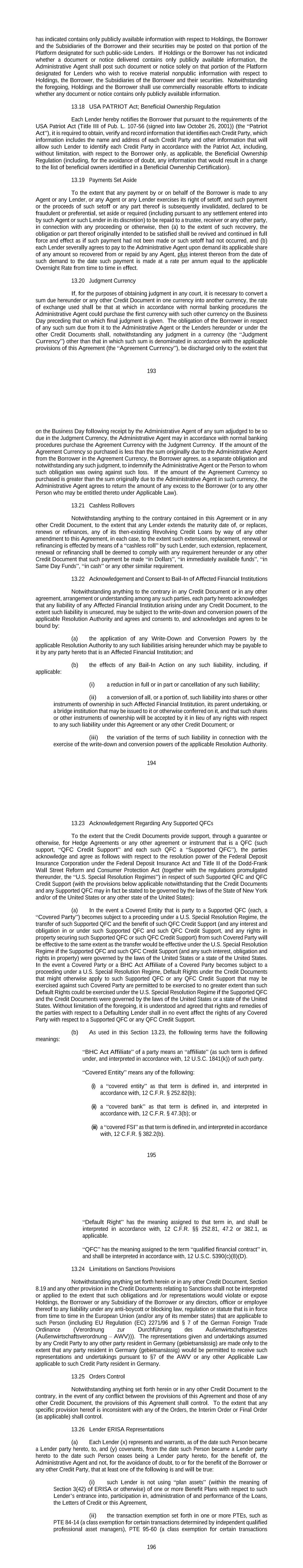 193 has indicated contains only publicly available information with respect to Holdings, the Borrower and the Subsidiaries of the Borrower and their securities may be posted on that portion of the Platform designated for such public-side Lenders. If Holdings or the Borrower has not indicated whether a document or notice delivered contains only publicly available information, the Administrative Agent shall post such document or notice solely on that portion of the Platform designated for Lenders who wish to receive material nonpublic information with respect to Holdings, the Borrower, the Subsidiaries of the Borrower and their securities. Notwithstanding the foregoing, Holdings and the Borrower shall use commercially reasonable efforts to indicate whether any document or notice contains only publicly available information. 13.18 USA PATRIOT Act; Beneficial Ownership Regulation Each Lender hereby notifies the Borrower that pursuant to the requirements of the USA Patriot Act (Title III of Pub. L. 107-56 (signed into law October 26, 2001)) (the “Patriot Act”), it is required to obtain, verify and record information that identifies each Credit Party, which information includes the name and address of each Credit Party and other information that will allow such Lender to identify each Credit Party in accordance with the Patriot Act, including, without limitation, with respect to the Borrower only, as applicable, the Beneficial Ownership Regulation (including, for the avoidance of doubt, any information that would result in a change to the list of beneficial owners identified in a Beneficial Ownership Certification). 13.19 Payments Set Aside To the extent that any payment by or on behalf of the Borrower is made to any Agent or any Lender, or any Agent or any Lender exercises its right of setoff, and such payment or the proceeds of such setoff or any part thereof is subsequently invalidated, declared to be fraudulent or preferential, set aside or required (including pursuant to any settlement entered into by such Agent or such Lender in its discretion) to be repaid to a trustee, receiver or any other party, in connection with any proceeding or otherwise, then (a) to the extent of such recovery, the obligation or part thereof originally intended to be satisfied shall be revived and continued in full force and effect as if such payment had not been made or such setoff had not occurred, and (b) each Lender severally agrees to pay to the Administrative Agent upon demand its applicable share of any amount so recovered from or repaid by any Agent, plus interest thereon from the date of such demand to the date such payment is made at a rate per annum equal to the applicable Overnight Rate from time to time in effect. 13.20 Judgment Currency If, for the purposes of obtaining judgment in any court, it is necessary to convert a sum due hereunder or any other Credit Document in one currency into another currency, the rate of exchange used shall be that at which in accordance with normal banking procedures the Administrative Agent could purchase the first currency with such other currency on the Business Day preceding that on which final judgment is given. The obligation of the Borrower in respect of any such sum due from it to the Administrative Agent or the Lenders hereunder or under the other Credit Documents shall, notwithstanding any judgment in a currency (the “Judgment Currency”) other than that in which such sum is denominated in accordance with the applicable provisions of this Agreement (the “Agreement Currency”), be discharged only to the extent that 194 on the Business Day following receipt by the Administrative Agent of any sum adjudged to be so due in the Judgment Currency, the Administrative Agent may in accordance with normal banking procedures purchase the Agreement Currency with the Judgment Currency. If the amount of the Agreement Currency so purchased is less than the sum originally due to the Administrative Agent from the Borrower in the Agreement Currency, the Borrower agrees, as a separate obligation and notwithstanding any such judgment, to indemnify the Administrative Agent or the Person to whom such obligation was owing against such loss. If the amount of the Agreement Currency so purchased is greater than the sum originally due to the Administrative Agent in such currency, the Administrative Agent agrees to return the amount of any excess to the Borrower (or to any other Person who may be entitled thereto under Applicable Law). 13.21 Cashless Rollovers Notwithstanding anything to the contrary contained in this Agreement or in any other Credit Document, to the extent that any Lender extends the maturity date of, or replaces, renews or refinances, any of its then-existing Revolving Credit Loans by way of any other amendment to this Agreement, in each case, to the extent such extension, replacement, renewal or refinancing is effected by means of a “cashless roll” by such Lender, such extension, replacement, renewal or refinancing shall be deemed to comply with any requirement hereunder or any other Credit Document that such payment be made “in Dollars”, “in immediately available funds”, “in Same Day Funds”, “in cash” or any other similar requirement. 13.22 Acknowledgement and Consent to Bail-In of Affected Financial Institutions Notwithstanding anything to the contrary in any Credit Document or in any other agreement, arrangement or understanding among any such parties, each party hereto acknowledges that any liability of any Affected Financial Institution arising under any Credit Document, to the extent such liability is unsecured, may be subject to the write-down and conversion powers of the applicable Resolution Authority and agrees and consents to, and acknowledges and agrees to be bound by: (a) the application of any Write-Down and Conversion Powers by the applicable Resolution Authority to any such liabilities arising hereunder which may be payab